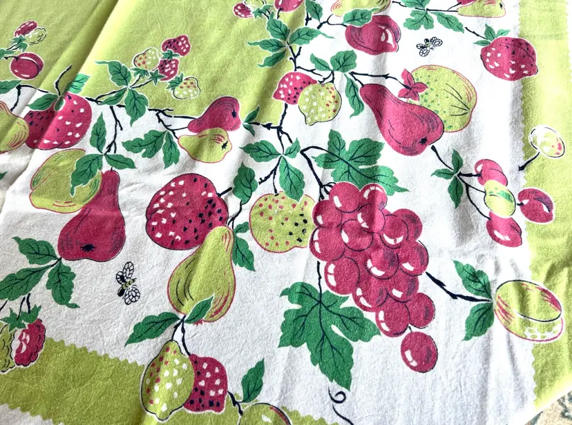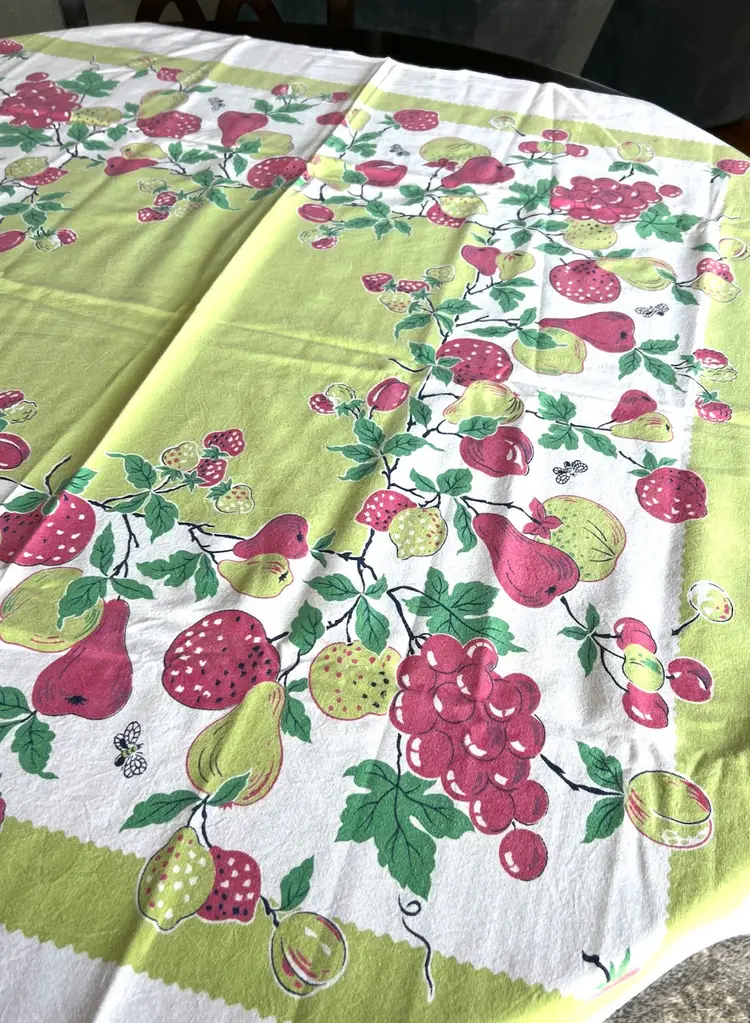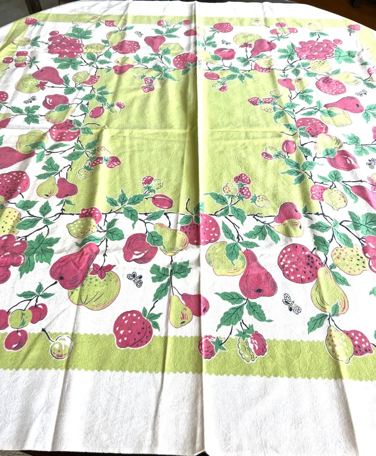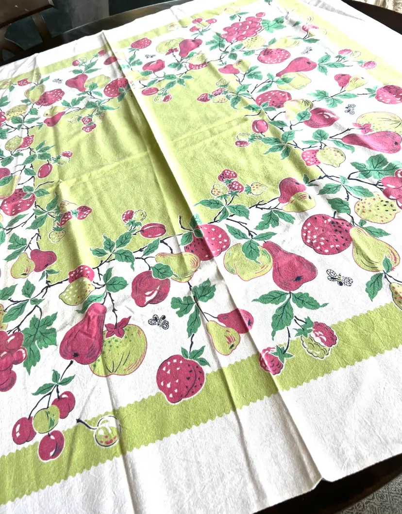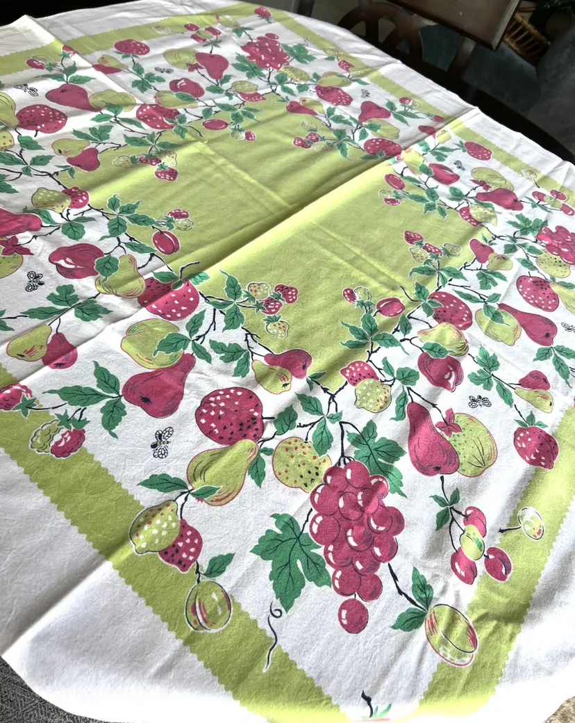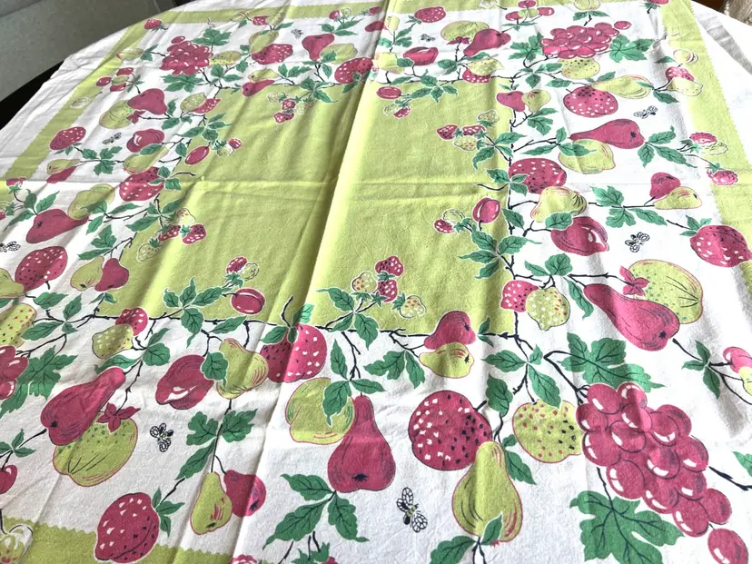 Gorgeous bright tablecloth in colors of red, lime green and on a white background. Perfect for your next party or gathering. I purchased this tablecloth at a local estate sale although it appears to have been little used. Colors are green, red and white Material - cotton - easy to wash - Condition: no holes frays or spots - looks great with true colors Size: 42 by 44 inch rectangle - almost square