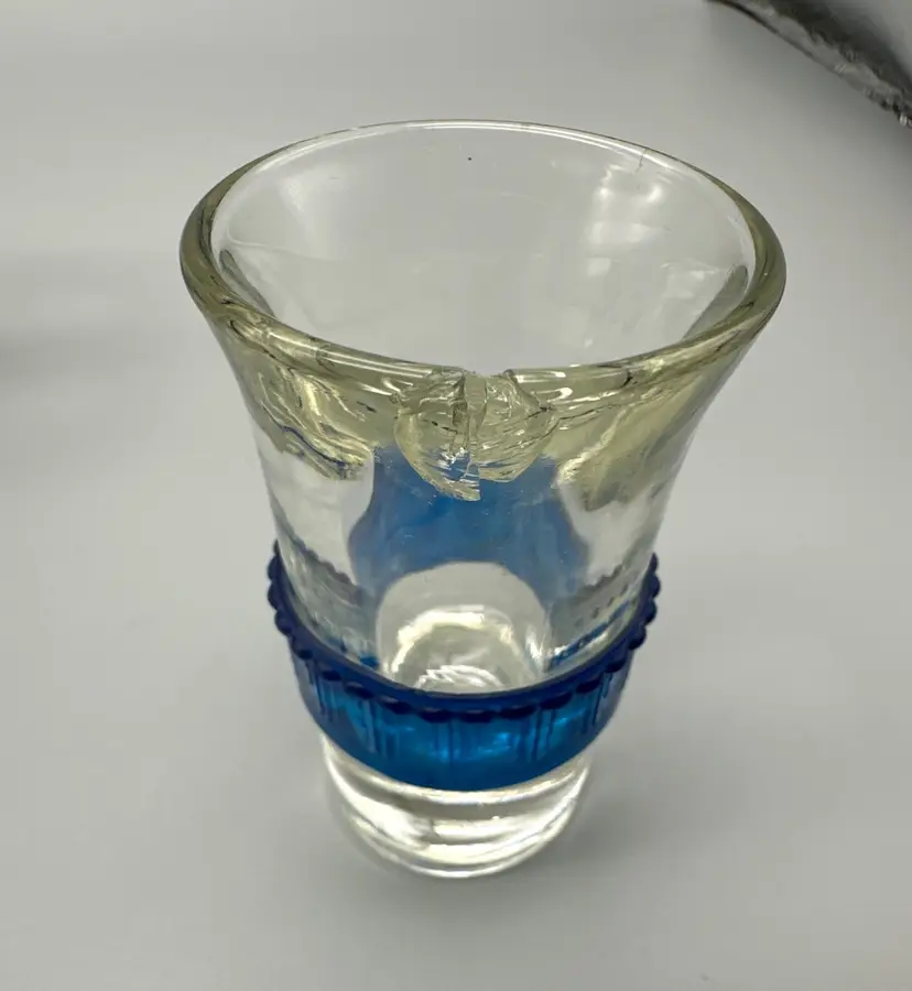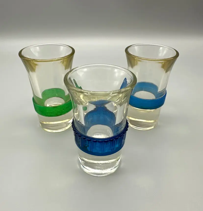 These unique vintage Tsing Tao Shot Glasses have Celluloid textured bands in blue and green. Their Mid Century charm and artisanal craftsmanship make them a delightful addition to your collection!