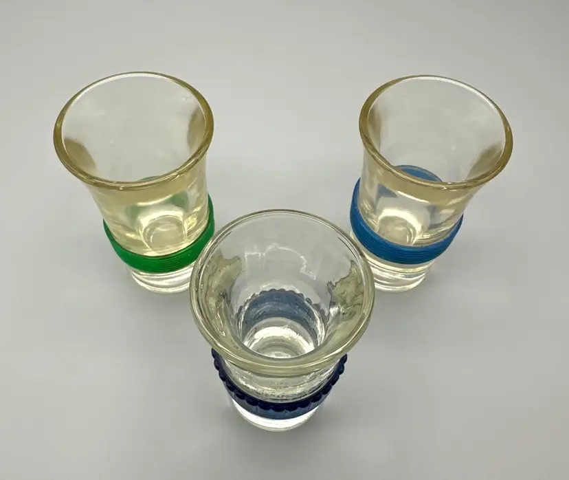 • Glass With Celluloid Bands • Textured colored bands for grip • Set of three but I am throwing in a 4th one that does have a chip • Ideal for decorative or functional use • Unique vintage aesthetic