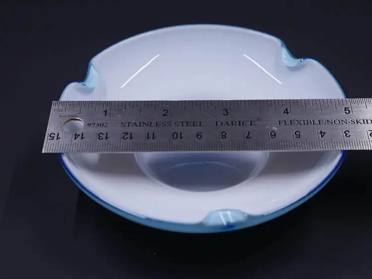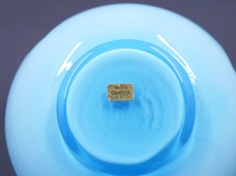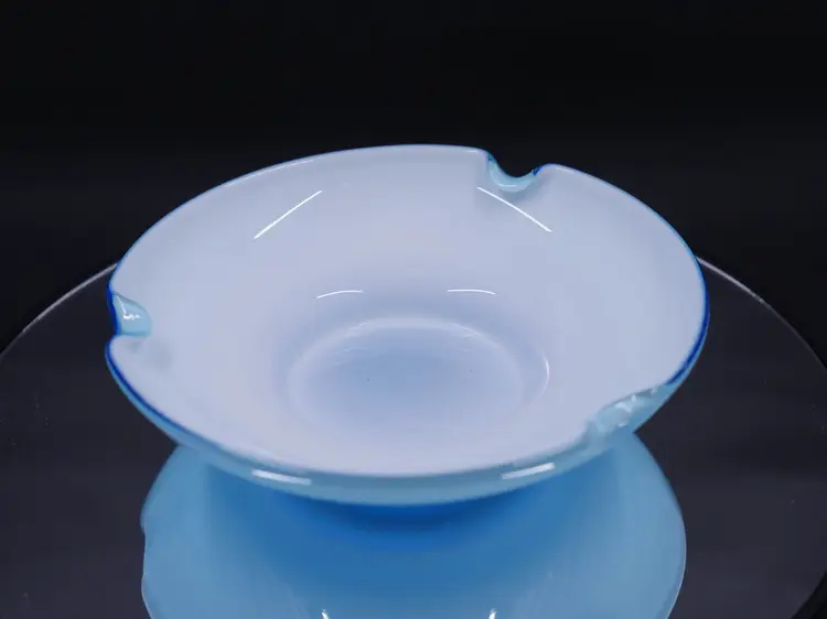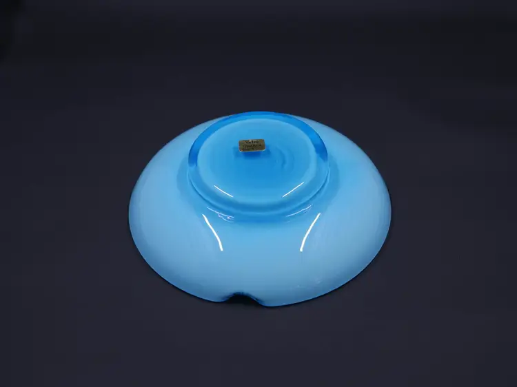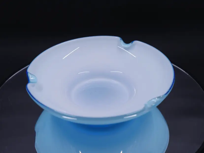 A shallow, approx. 5" rounded glass dish with three indentations on the rim, possibly for use as an ashtray or catchall dish. The cased glass technique creates a two-toned effect, with the white interior contrasting with the vibrant, translucent light blue colored exterior. The base has an original gold label that reads "Vetro Opalina Made in Italy." In excellent condition, no condition issues appearing unused.