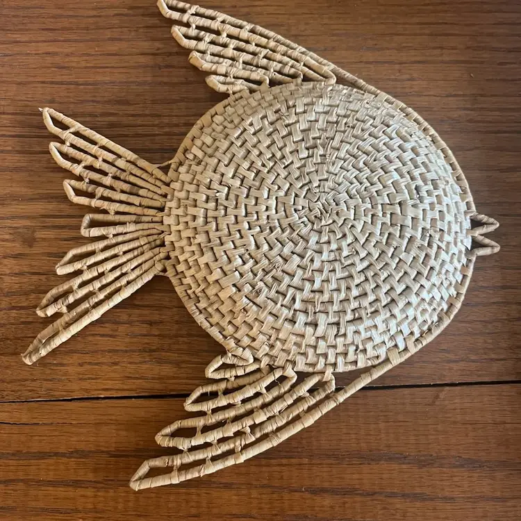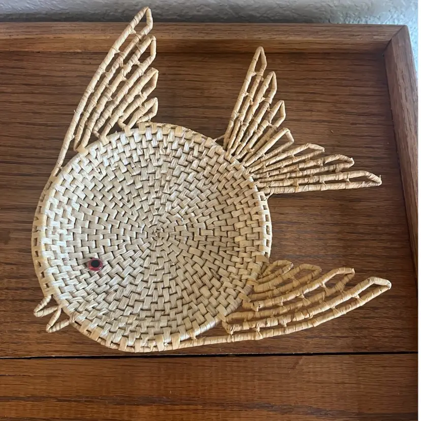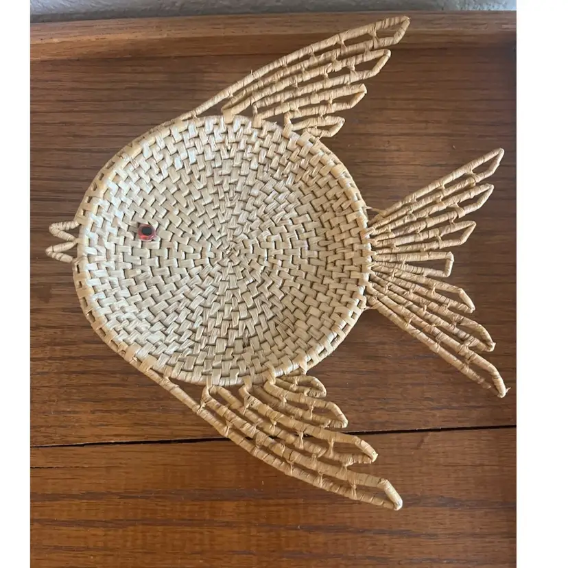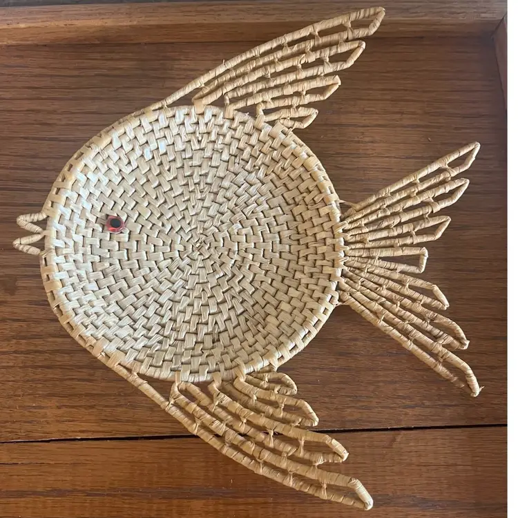 MCM wicker fish wall decor with glass eye measuring approximately 10.5” x 10.5”
