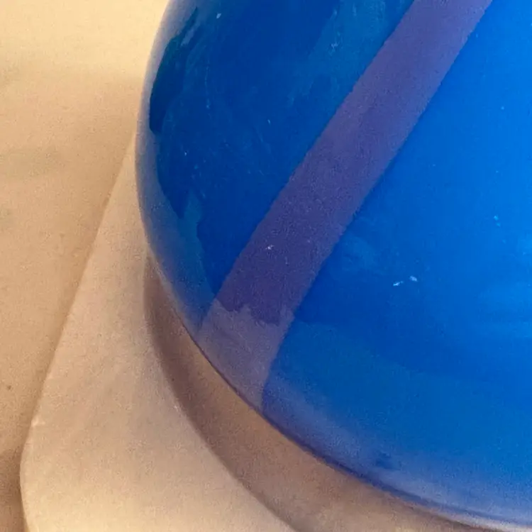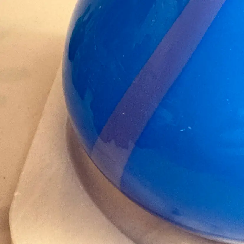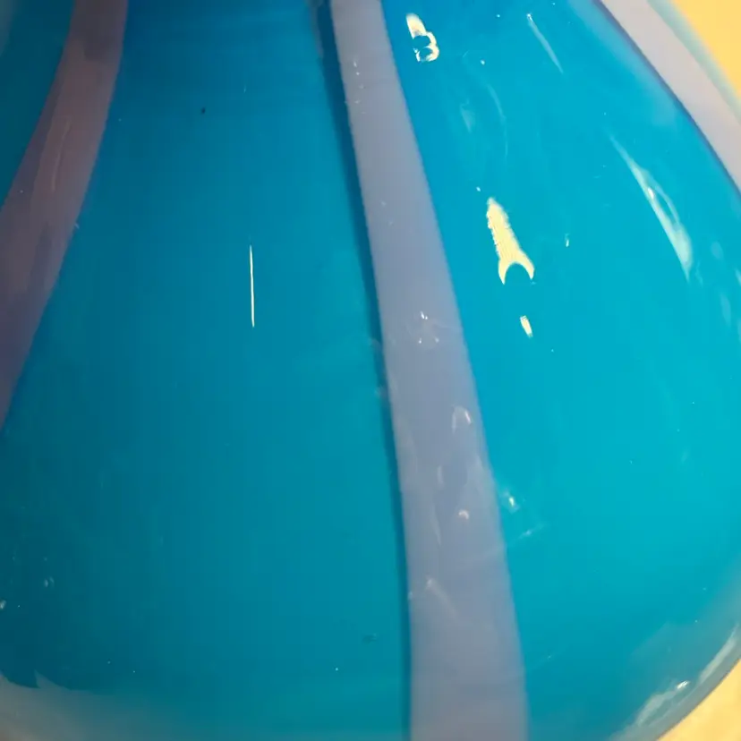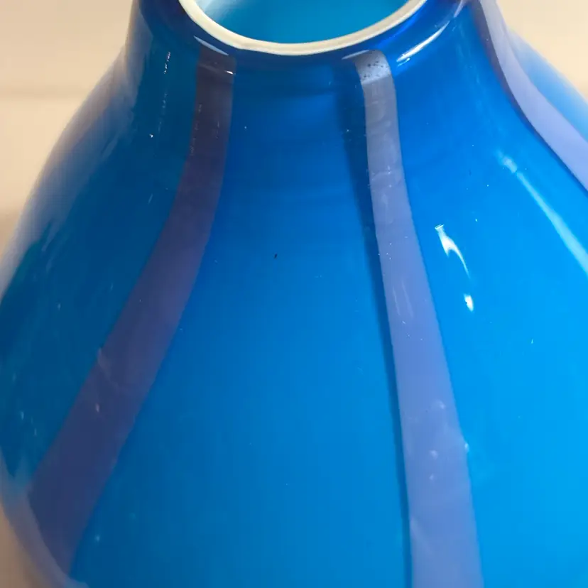 This Midcentury Blue and Purple Circus Tent Cased Glass Art Vase of Murano style is a hand-blown, medium-sized glass vase with a unique gourd shape and intricate strip pattern. The vase features a stunning 3D effect design inspired by a circus tent, making it a stylish and artistic piece for any adult's home decor. Made in Italy in the 1960s, this handmade vase showcases a glossy finish and is a striking addition to any collection of decorative collectibles.
