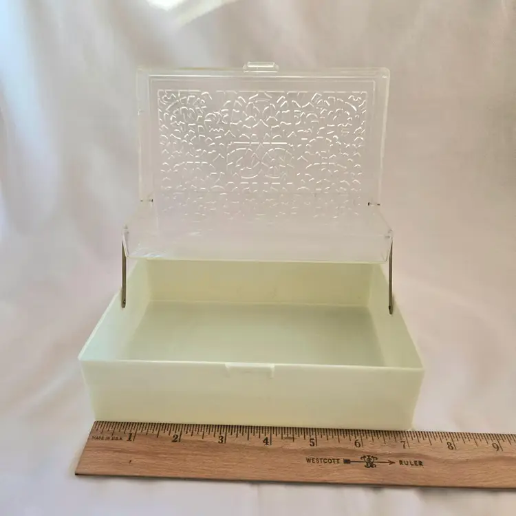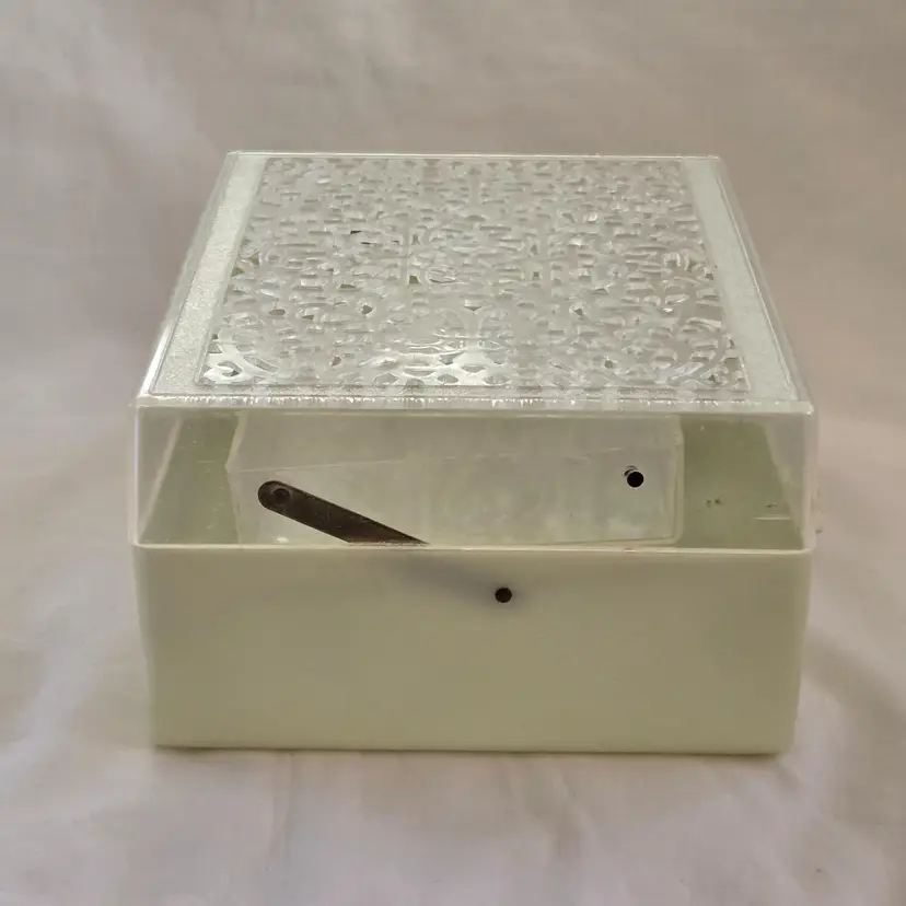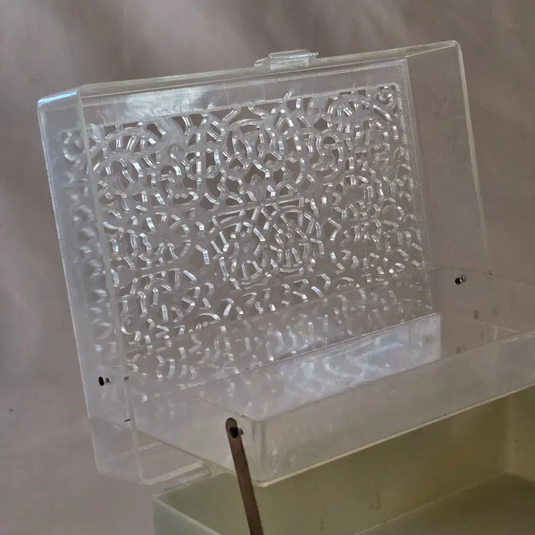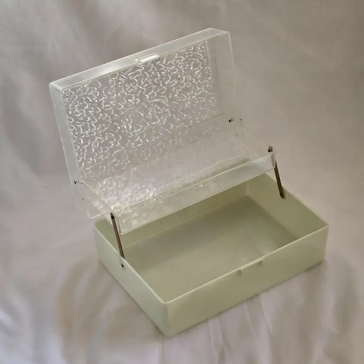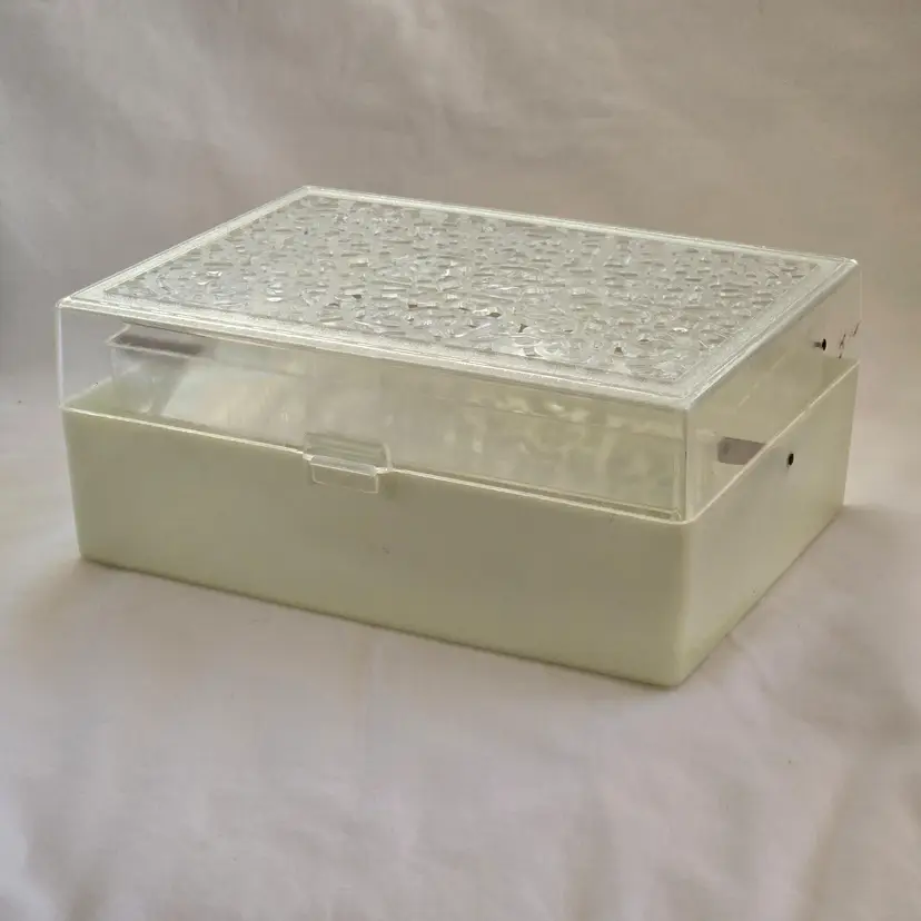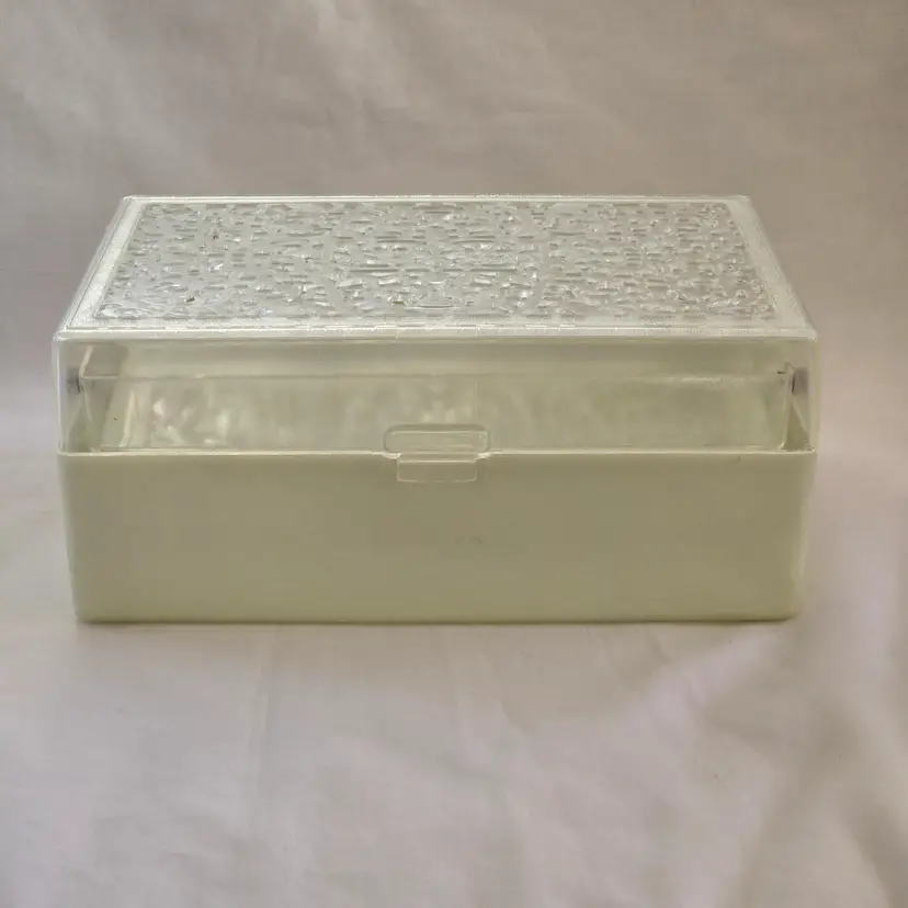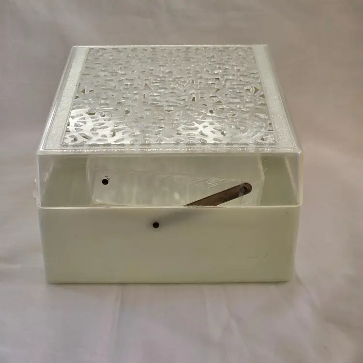 Midcentury Ivory Plastic Jewelry Box Reticulated Lid Plastic Jewelry Company USA made. Used condition with some wear to clasp, dirt, stains, etc. from actual use. Please view all the photos and read the entire item description and please ask any questions prior to purchase when possible.
