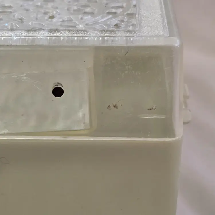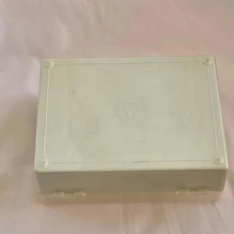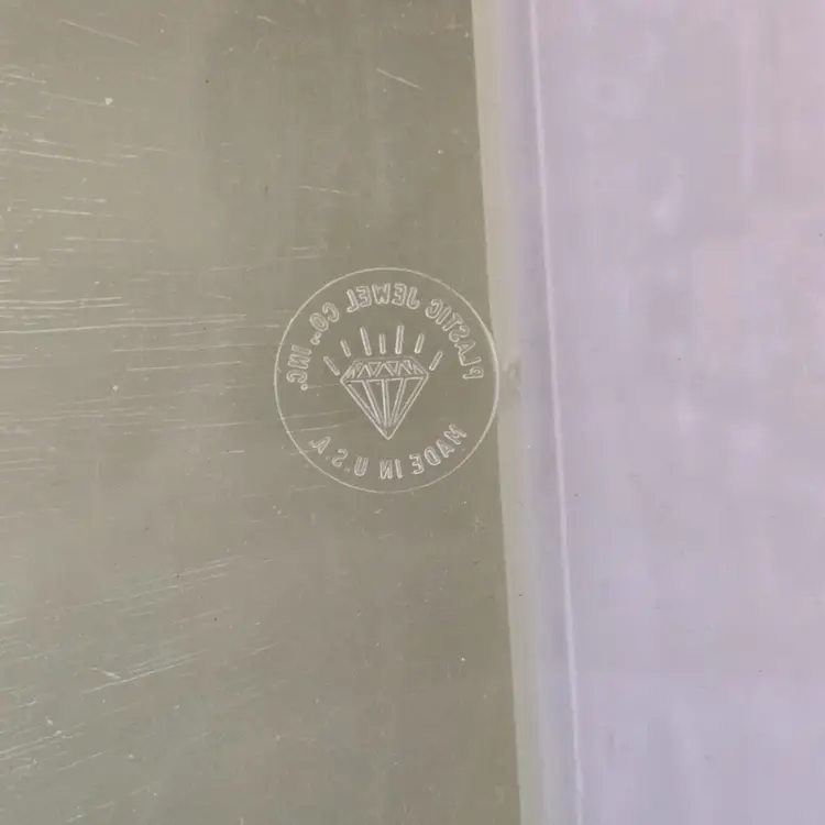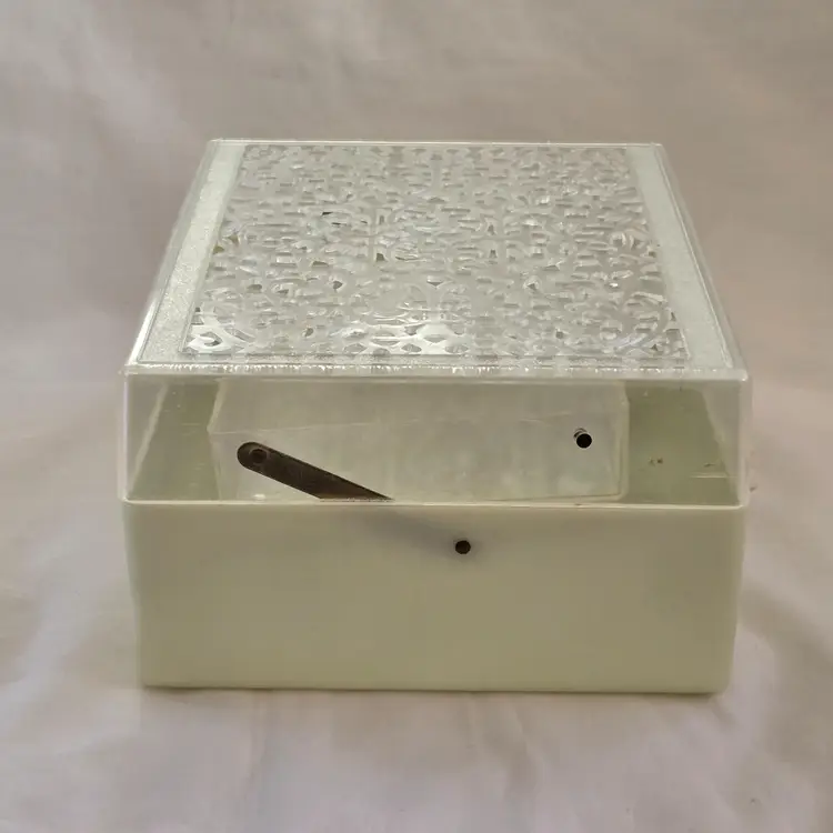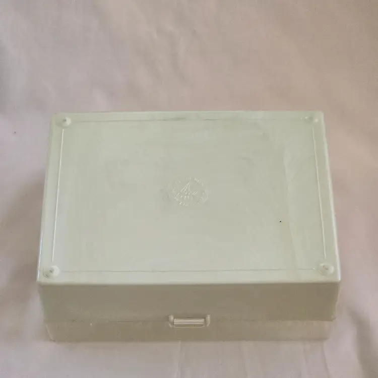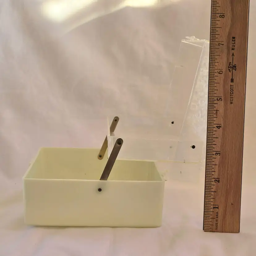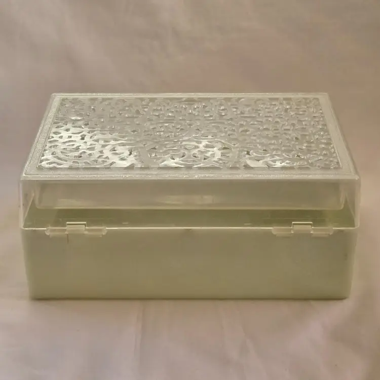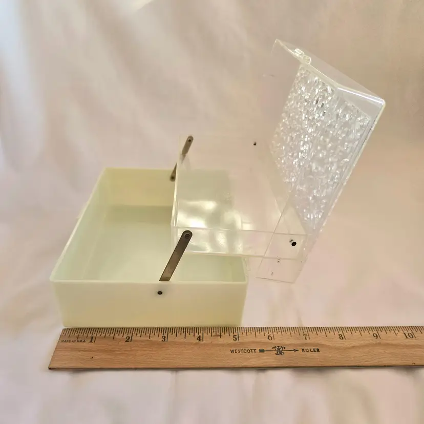 Midcentury Ivory Plastic Jewelry Box Reticulated Lid Plastic Jewelry Company USA made. Used condition with some wear to clasp, dirt, stains, etc. from actual use. Please view all the photos and read the entire item description and please ask any questions prior to purchase when possible.