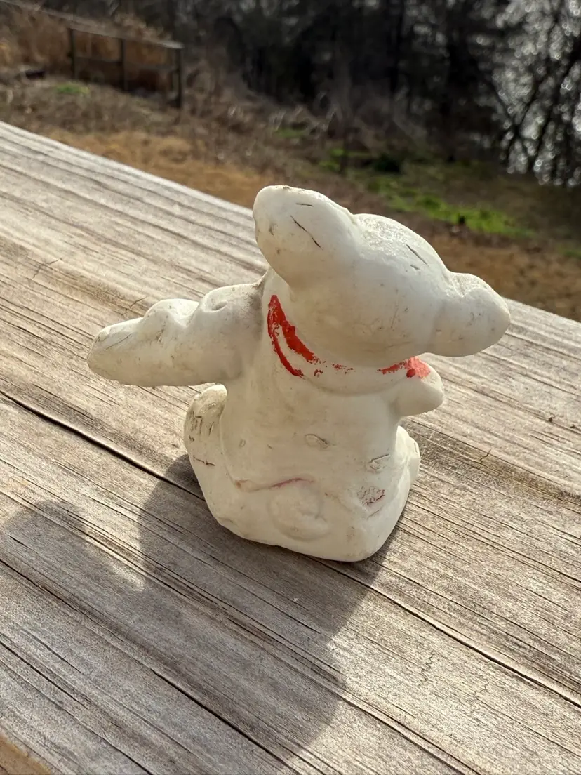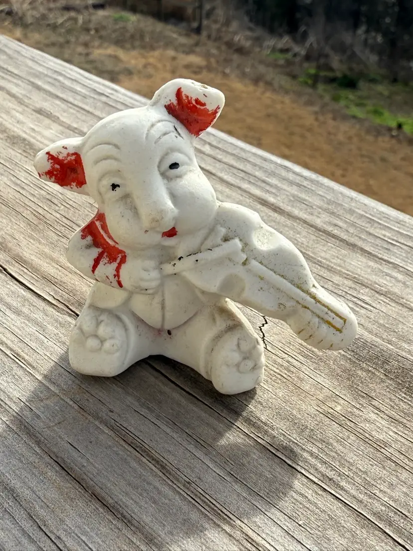 A charming 1950s/60s Japanese export figurine crafted from mattefinish white bisque pottery. The piece depicts a whimsical dog in a seated pose, playing a violin. Features handpainted red accents on the ears and a large scarf. Typical of the period, the molding is stylized with sweet, simple facial features. Condition: Shows character with minor paint wear and surface dust consistent with age.