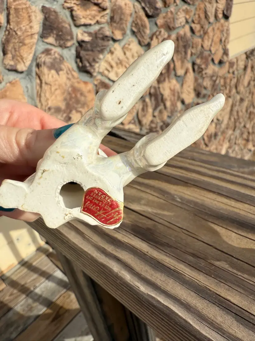 A rare and charming 1950s porcelain pixie elf figurine with a stunning pearlescent lustreware finish. The figure is depicted in a relaxed sitting pose with elongated legs and a pointed hat. Features handpainted details including expressive eyes and rosy cheeks. The base retains the original red and gold "Lefton Exclusives Japan" foil label. In excellent condition with no chips or cracks and the iridescent finish remaining bright and intact.