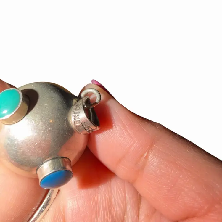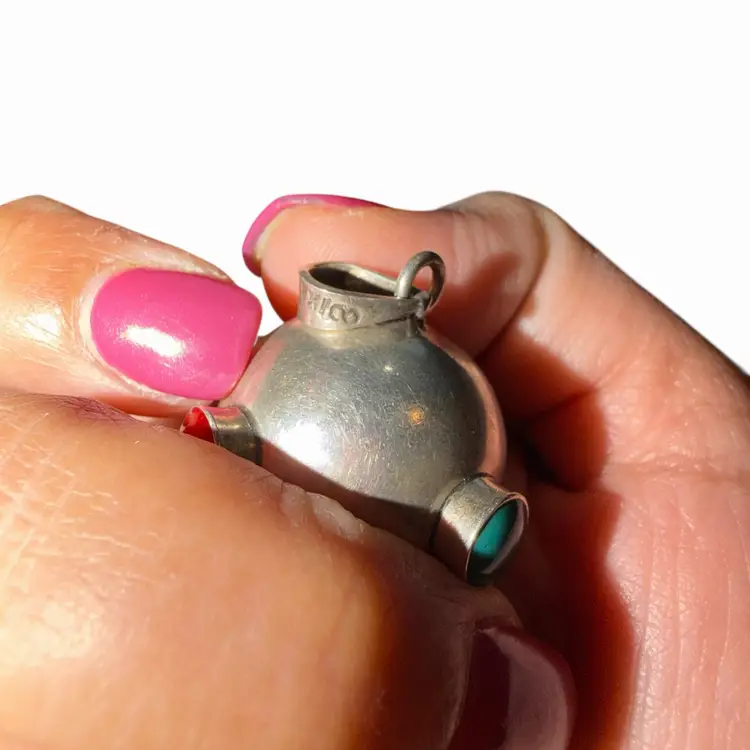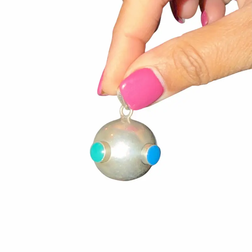 Measuring approximately 1.25” in diameter, this sculptural orb features natural blue and green turquoise, coral, and onyx cabochons set in a bold atomic-style design. The interior chime is intact and produces a soft, beautiful sound when worn.