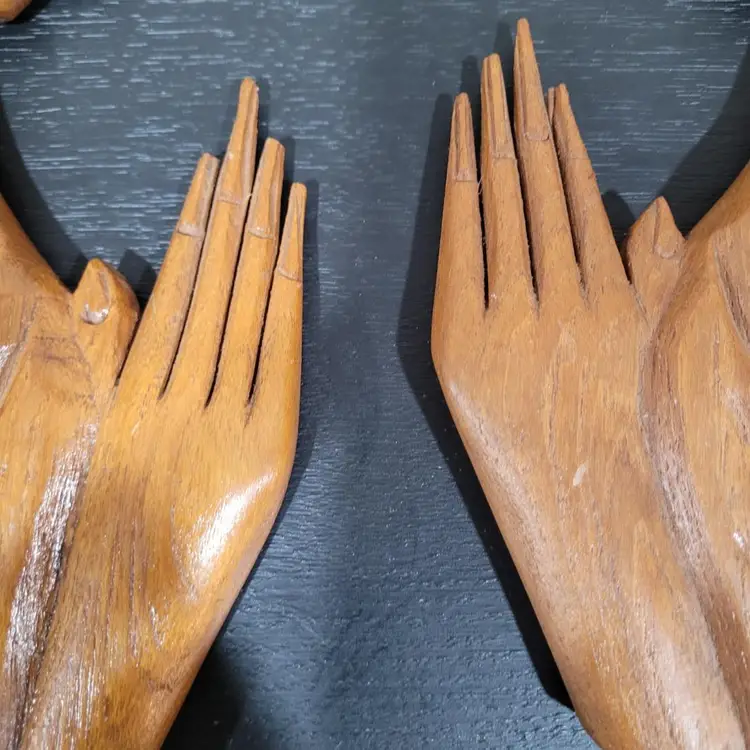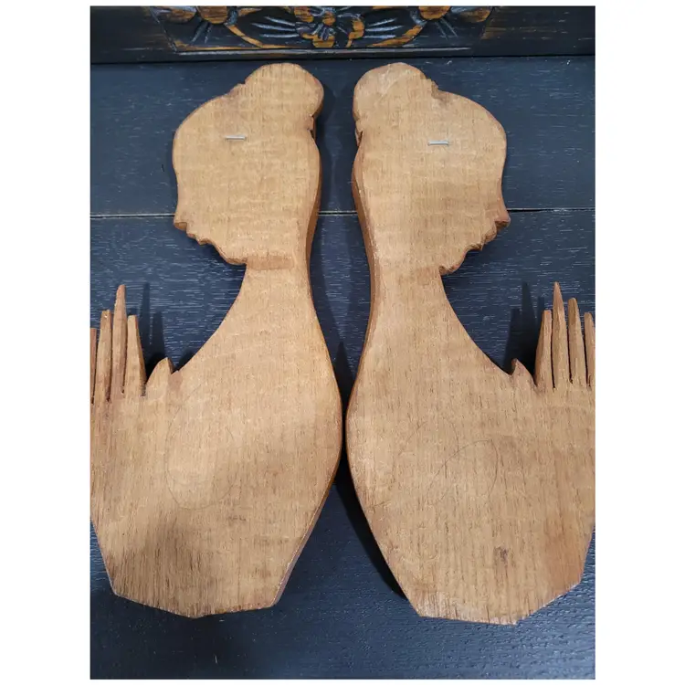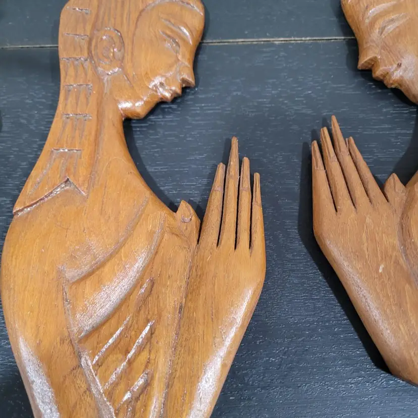 Adorable Set of two 16 inch long wood Polynesian Style Sisters Praying. Great carved midcentury look. The hands really set this wall art to the next level.