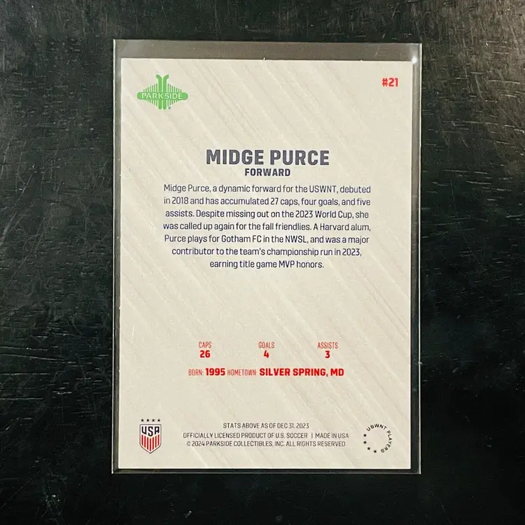 Card Size: Standard Set: 2023 Parkside USWNT Recap Year Manufactured: 2023 Player/Athlete: Midge Purce Original/Licensed Reprint: Original Type: Sports Trading Card Sport: Soccer Language: English Manufacturer: Parkside Features: Base Set Team: United States Card Number: 21 Season: 2023