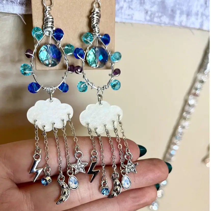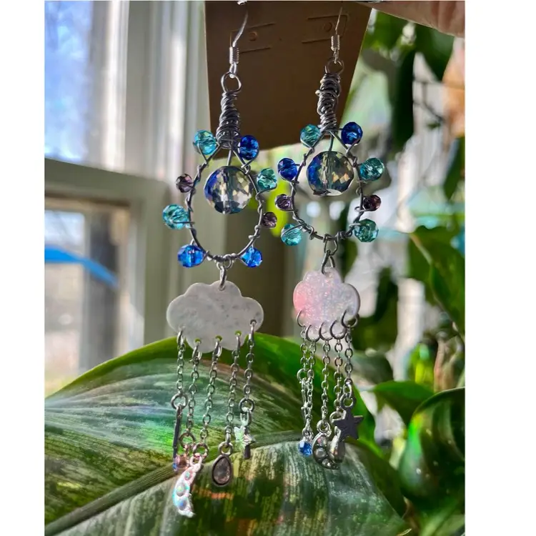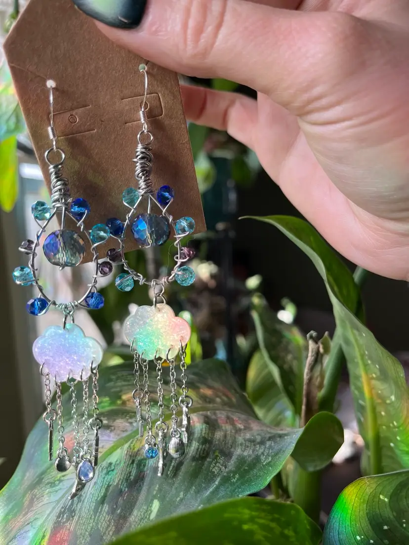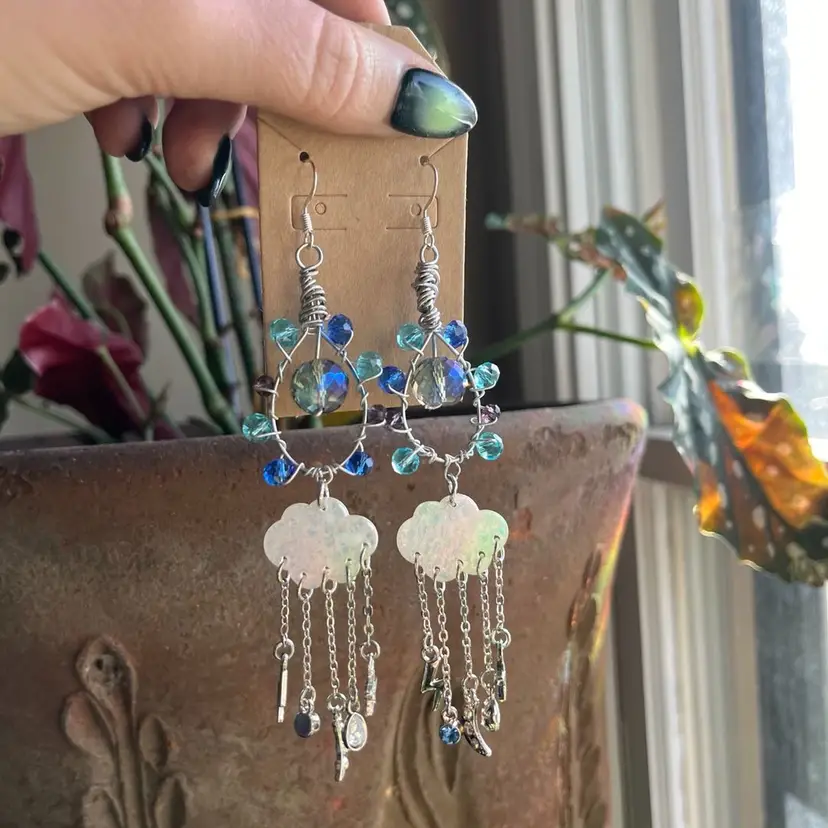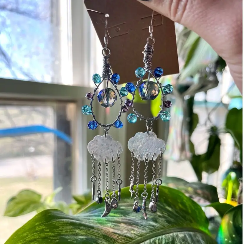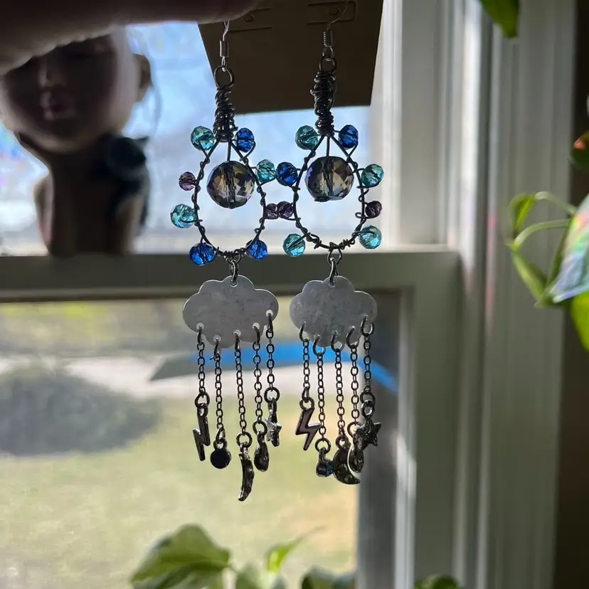 These Midnight Rain earrings were handmade by me! They are made of high quality crystal glass beads, silver metal wire, rain cloud charms, and lots of love 🫶🏼