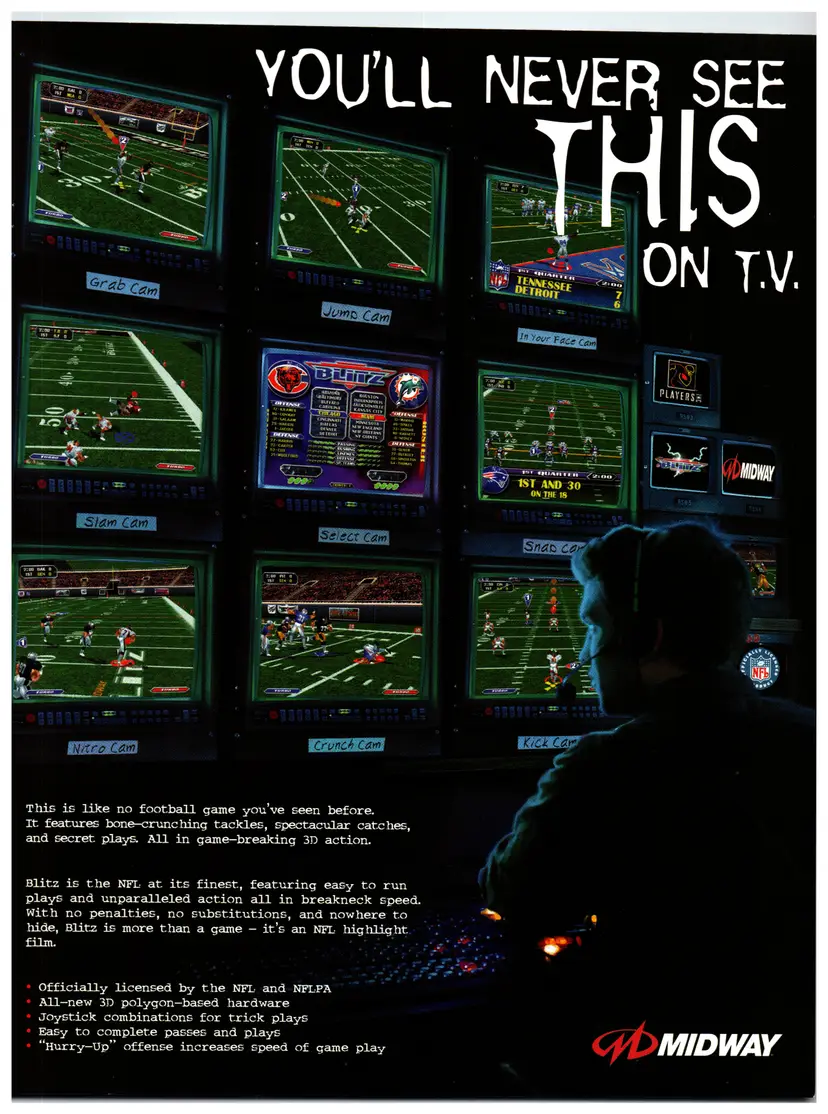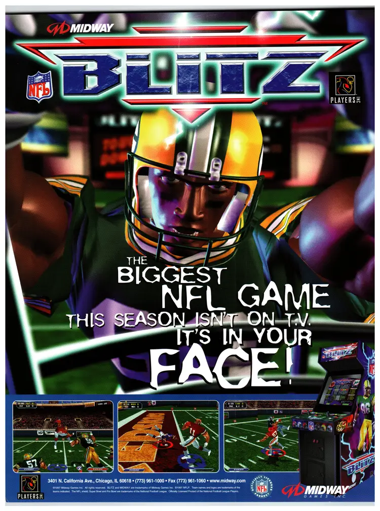 Verified Specifications: Brand: Midway Item Type: Arcade Game Promotional Poster / Advertisement Era/Style: Vintage, 1990s Game Title: NFL Blitz Material: Paper Features: Officially licensed by NFL and NFLPA, Promotes "Arcade perfect polygon-based hardware," "Bone-crunching tackles," "Hurry-up offense"