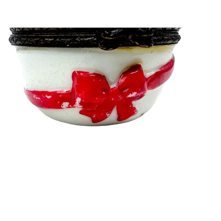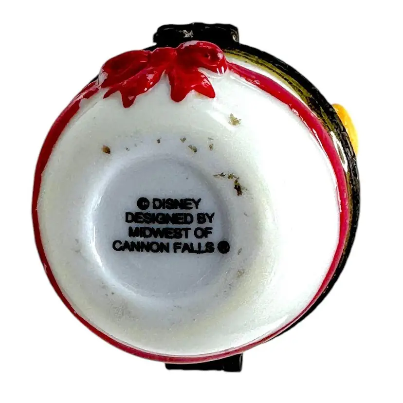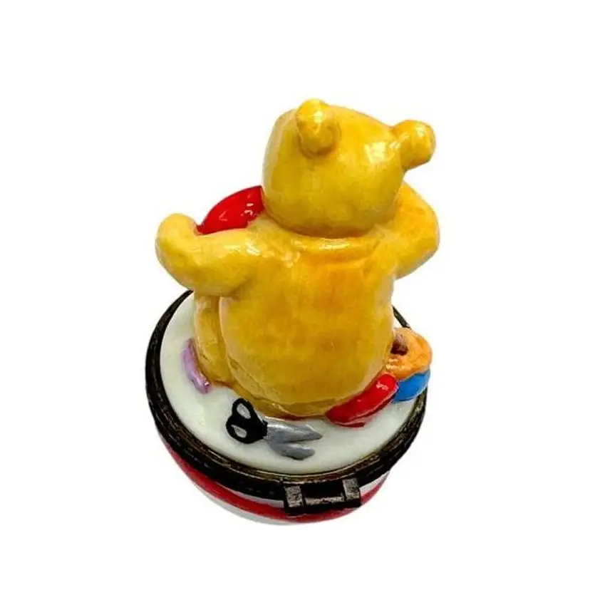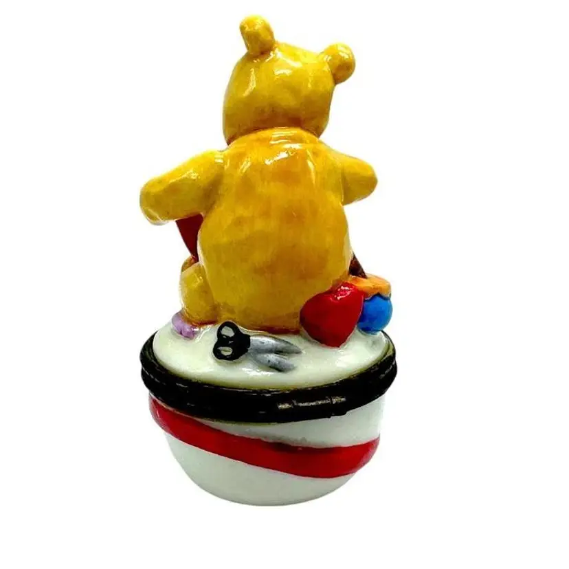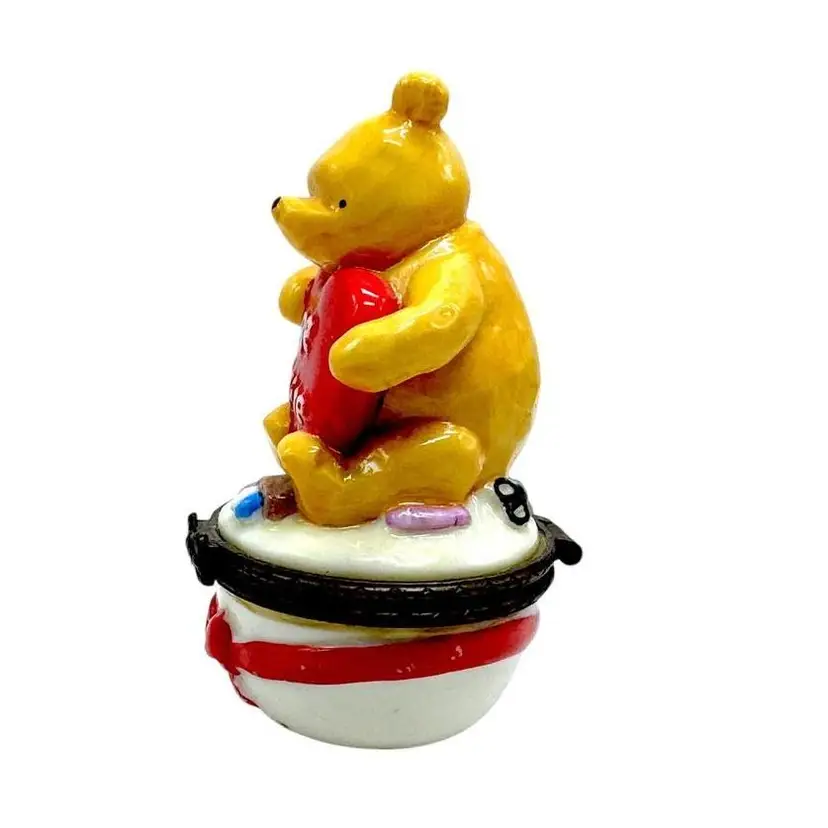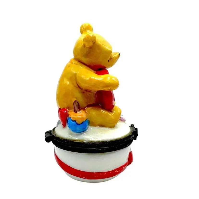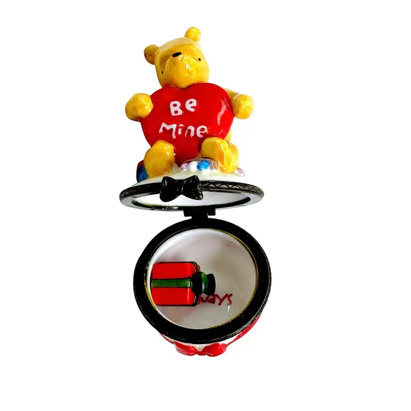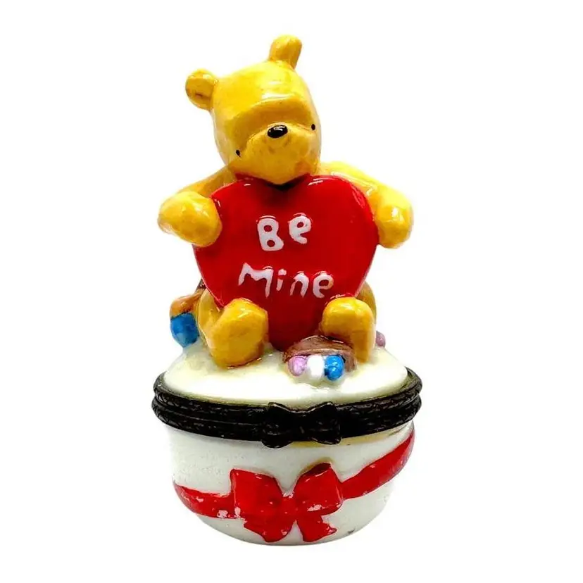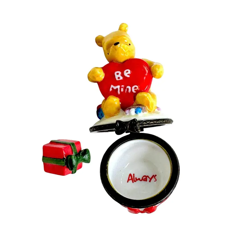 Vintage Winnie the Pooh "Be Mine" keepsake porcelain trinket box with a porcelain present inside and always. Good condition, no chips or cracks, paint missing on bow. 1.75"W x 1.75"D x 3"H