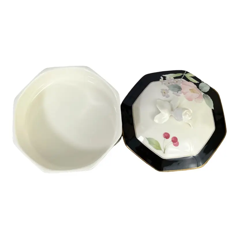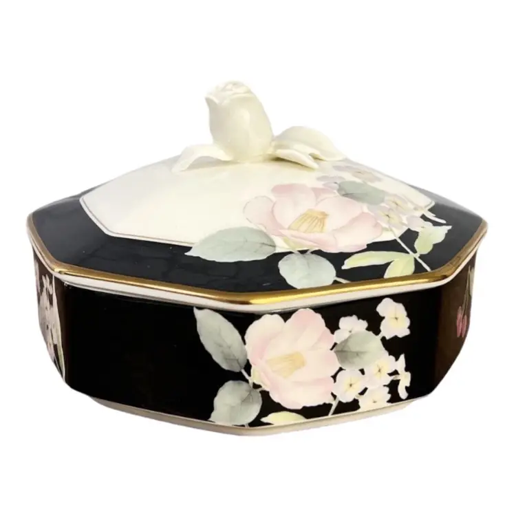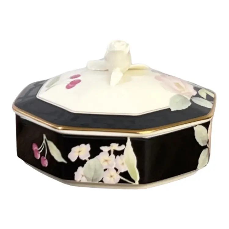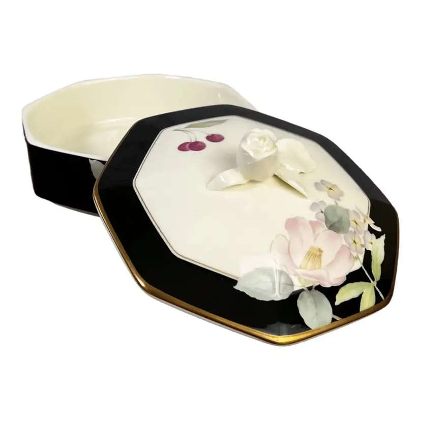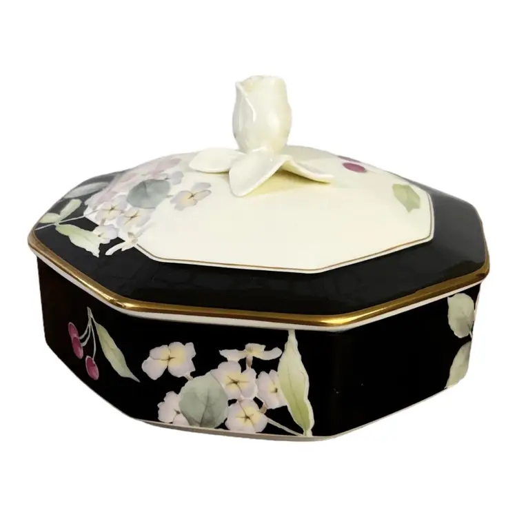 Add timeless charm to your collection with this exquisite Mikasa Botanica Black B2018 lidded bowl, crafted from Ivory Bone China by Narumi, Japan. This elegant piece features a black border with delicate floral and cherry motifs and a sculpted white rose handle on the lid — a true testament to Mikasa's artistry and fine detail.