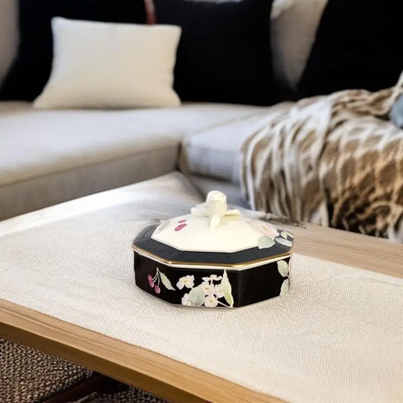 Color: Cream with black borders, multicolor floral/cherry design, gold trim