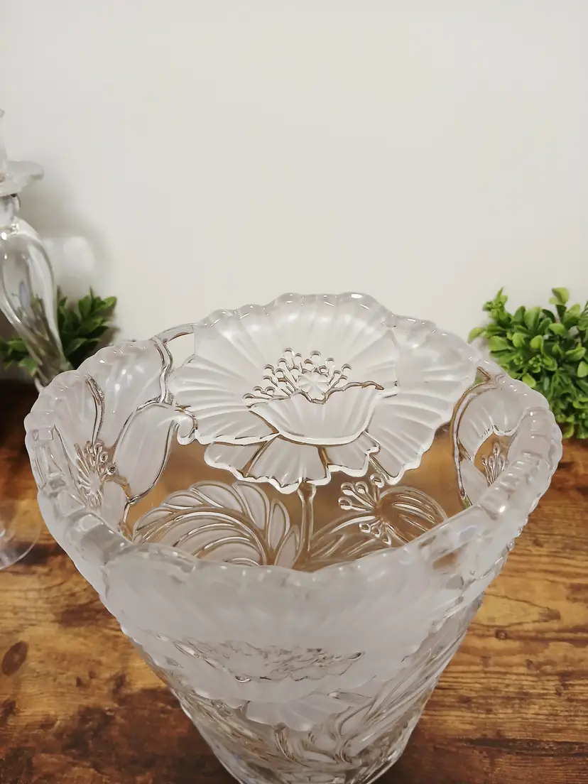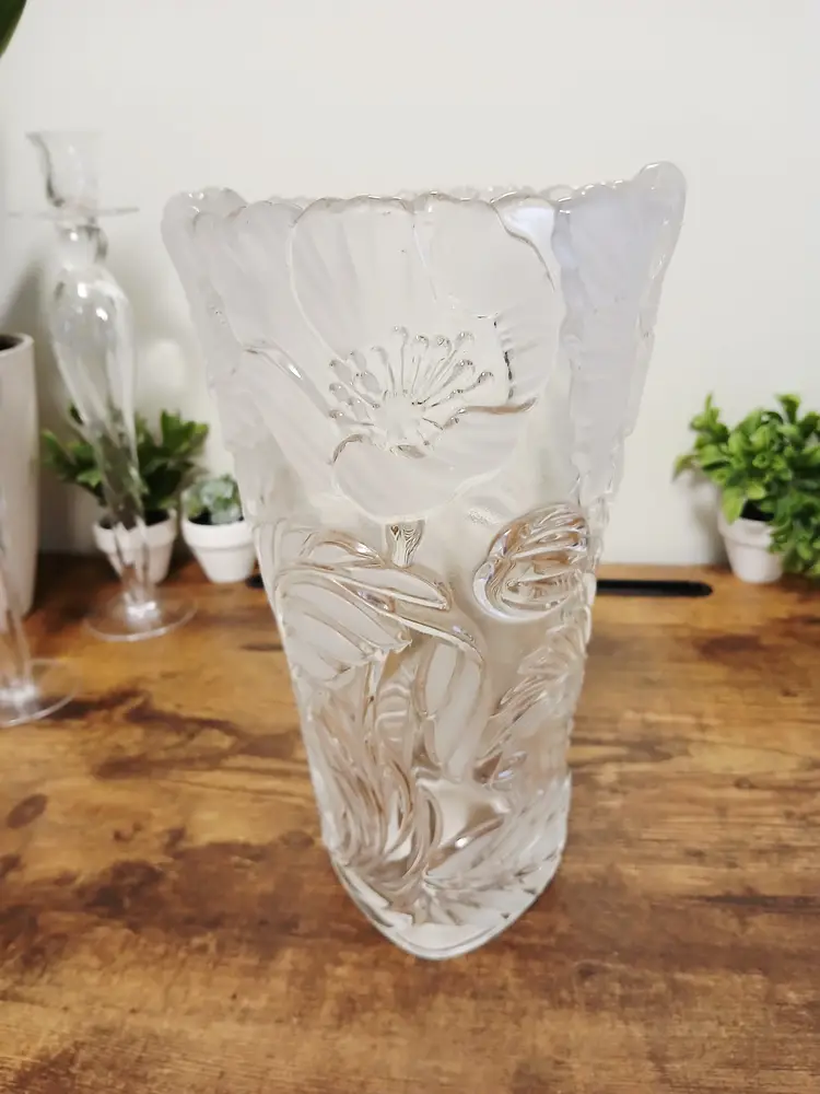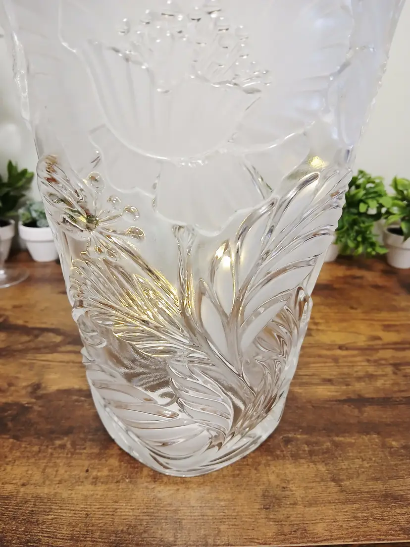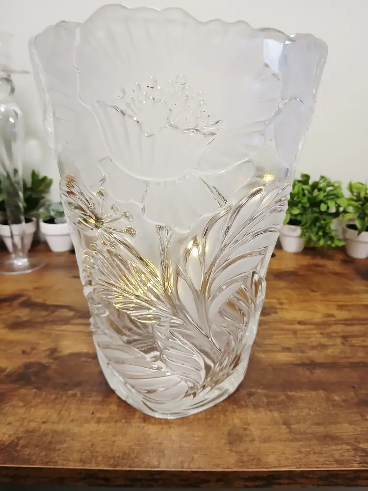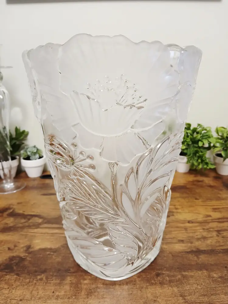 Enhance your decor with this vintage frosted glass vase featuring intricate floral designs. Perfect for showcasing your favorite blooms or as a standalone piece, it adds a touch of elegance to any room. Approximately 9 3/4" inches tall× 7" x 6"