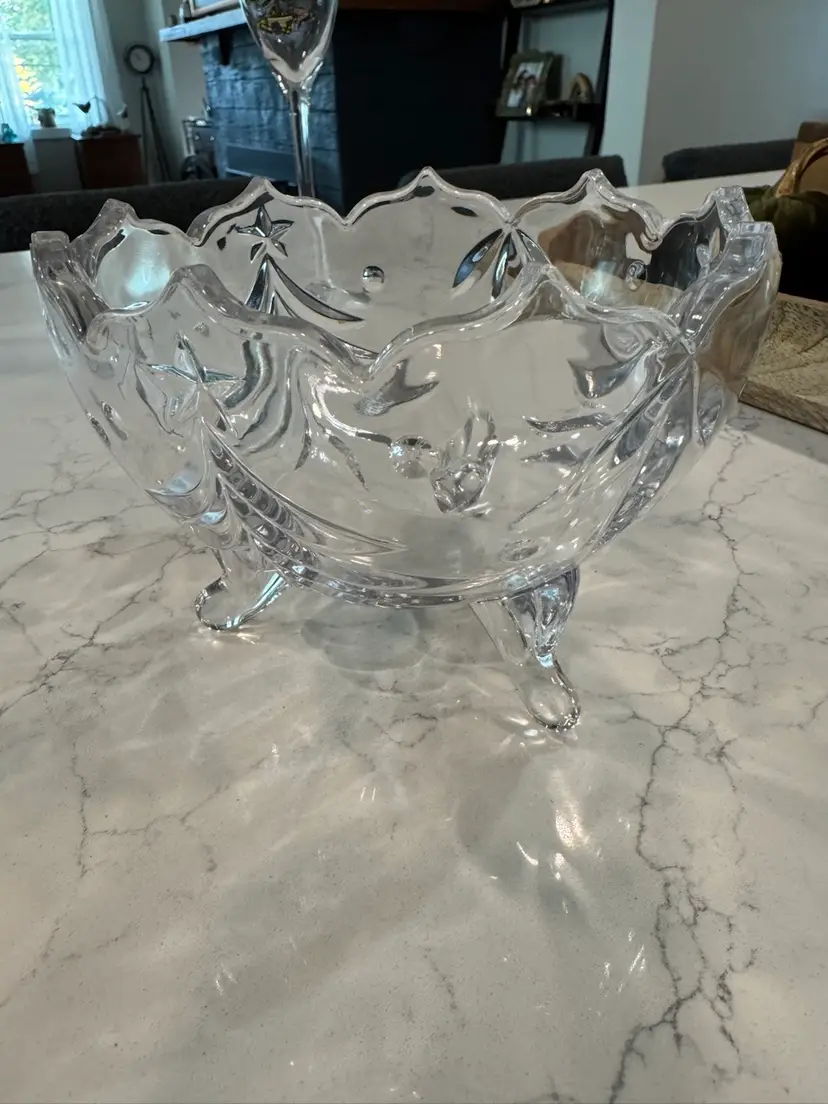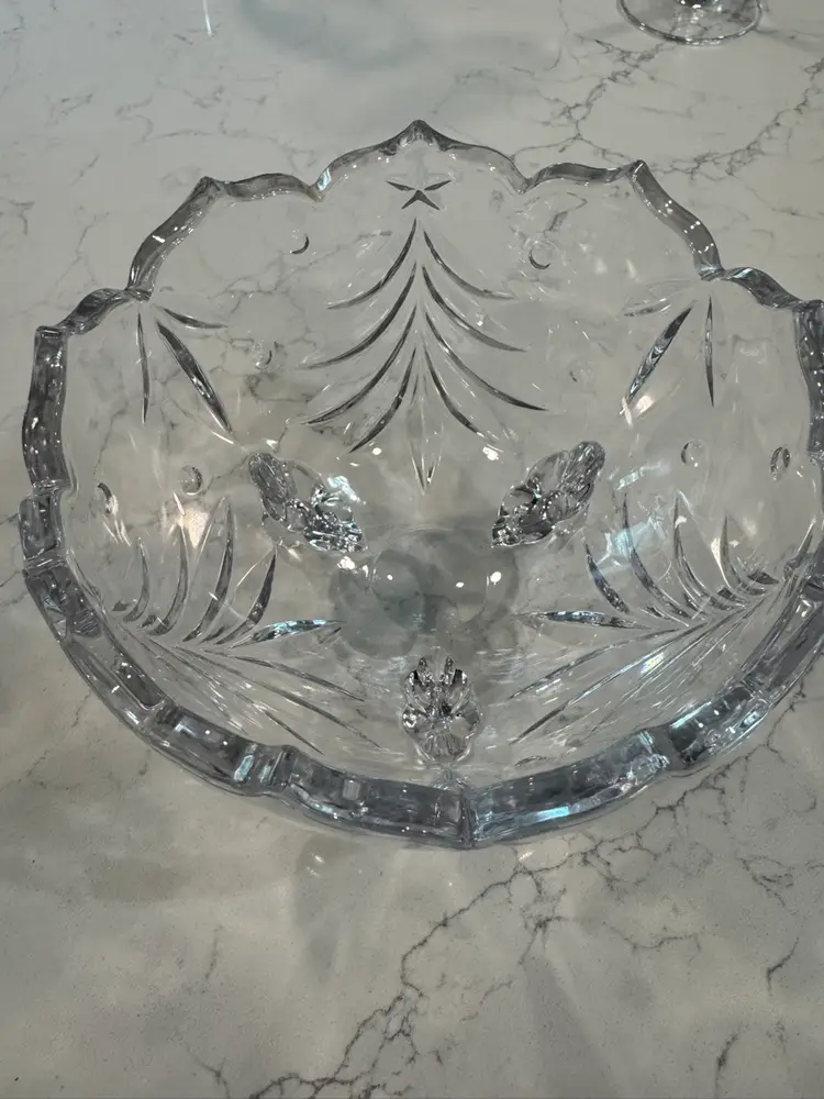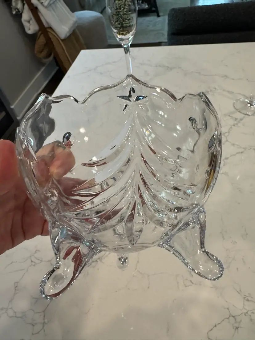 The prettiest little cut glass bowl with 3 feet and a design of festive Christmas trees. Perfect for Christmas treats! No chips or cracks.