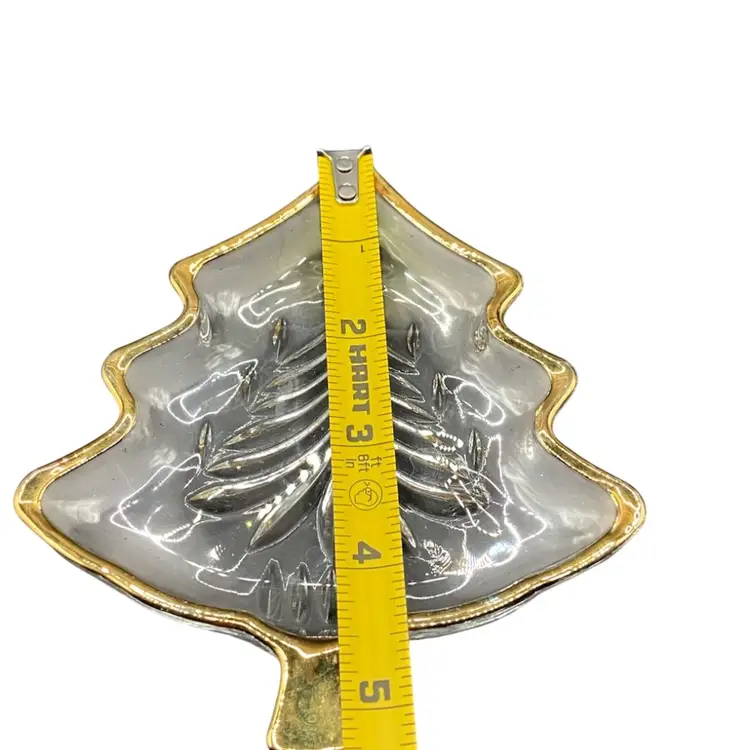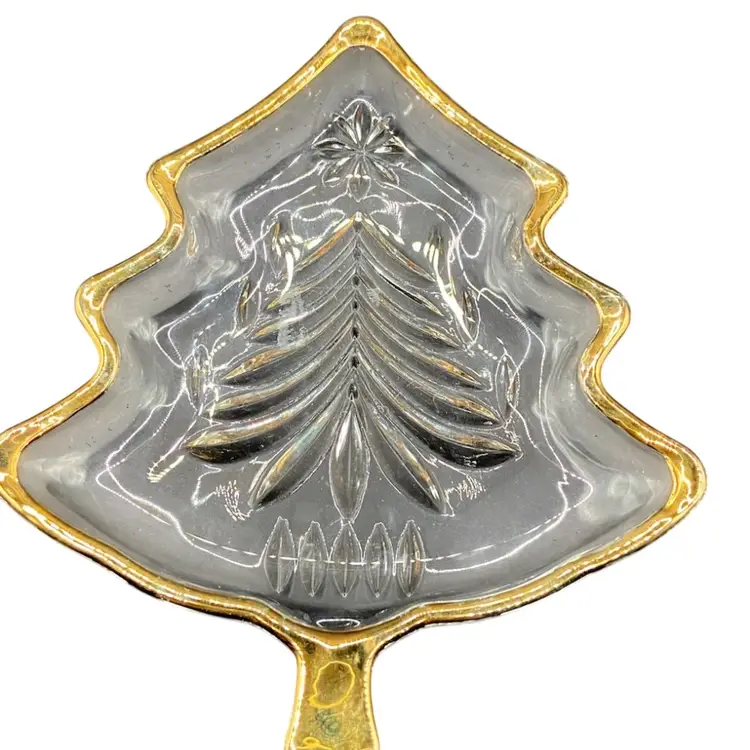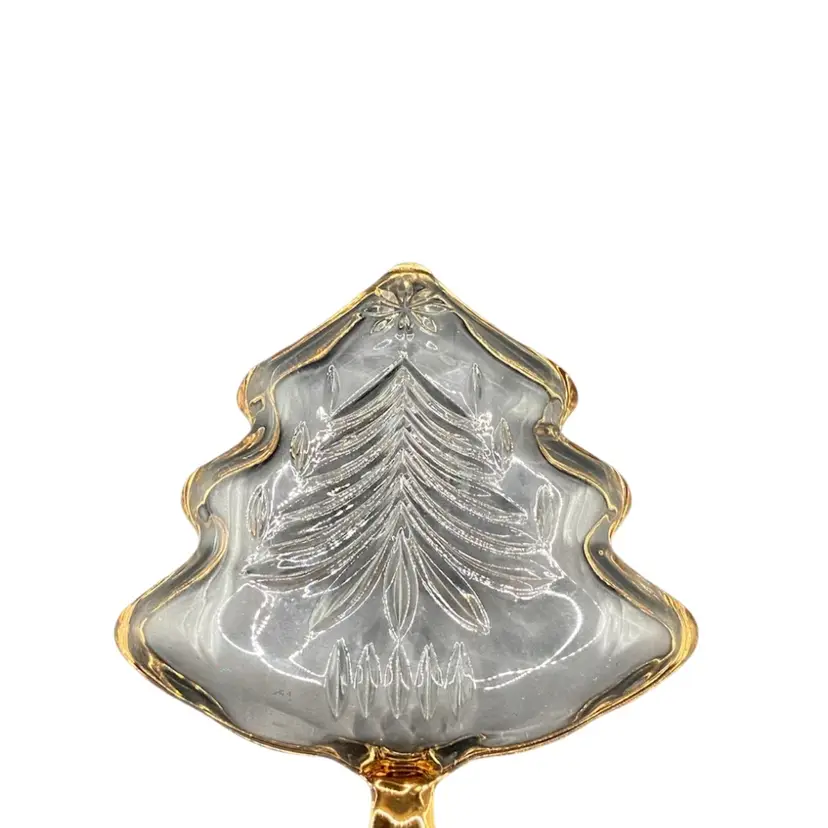 Glass tree has etching on the underside that really makes this tree stand out. The gold trim is in great shape with only the slightest wear. Perfect for holding earrings or small treats. No chips, cracks or repairs.