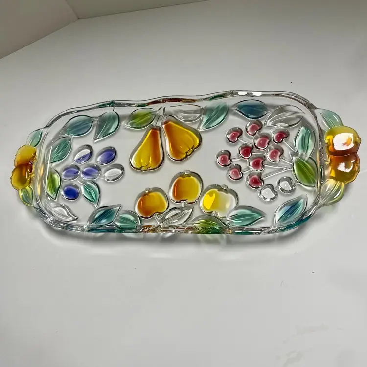 Beautiful vintage Mikasa Garden Harvest glass serving tray. Measures 16” long and 6.5” wide. Used condition; reverse painted with some paint missing from the back (see close up photos). In overall great condition for age and use of product.