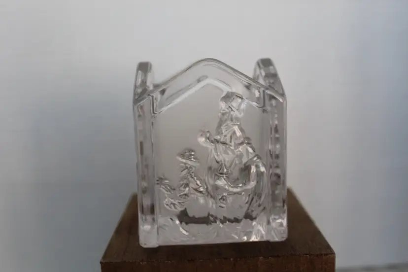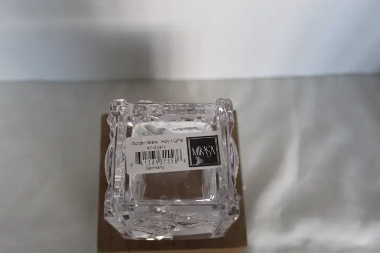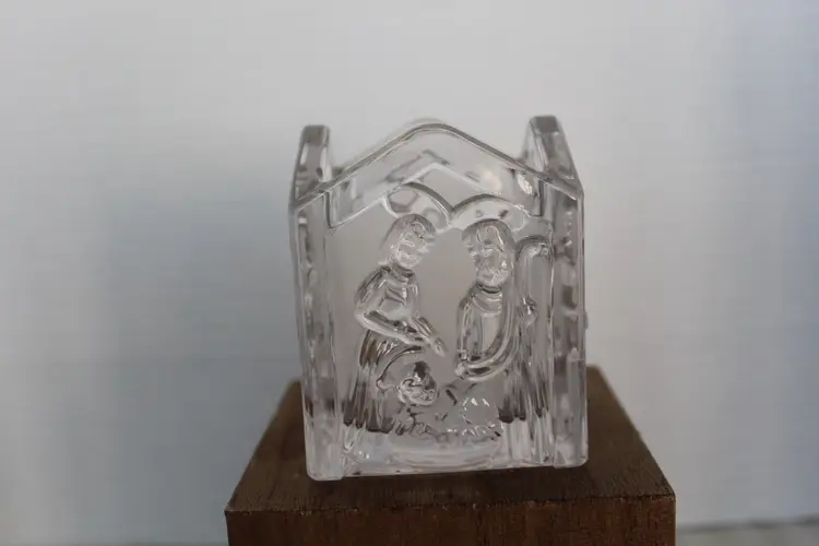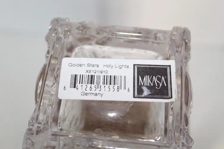 The Mikasa Glass Votive Candleholder with Golden Stars is a decorative piece made of leaded crystal glass, perfect for adding a touch of elegance to any room. This contemporary candle holder features etched patterns and a glossy finish, making it suitable for use with votive candles. With a height of 3.25 inches and a width of 2.5 inches, this candle holder from the late 20th century showcases a Christmas theme with its Holy Lights design, making it a beautiful addition to your holiday decor. Each side has a different nativity scene.