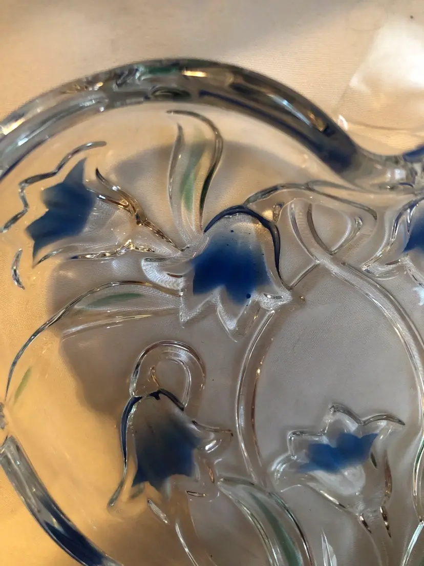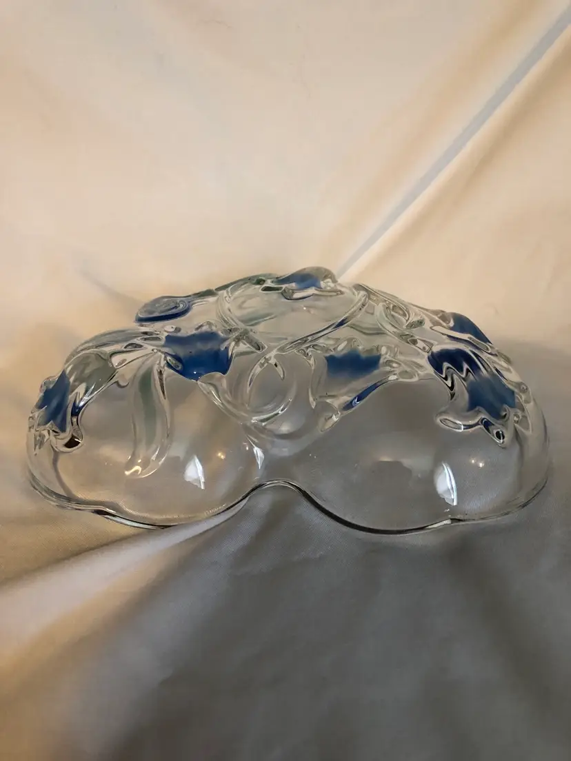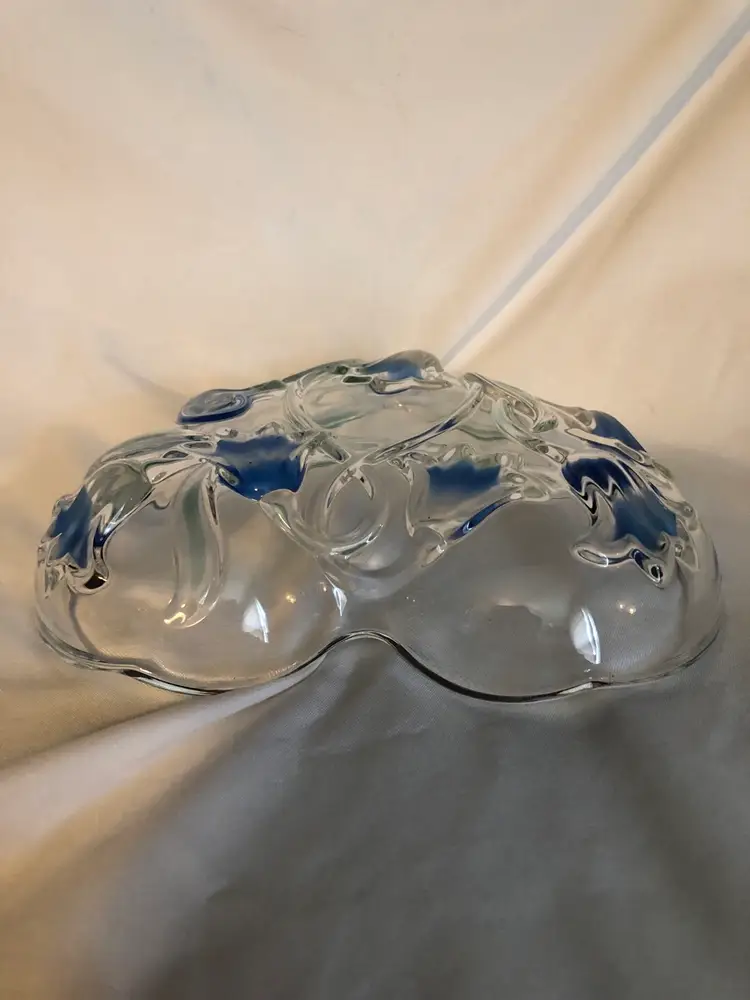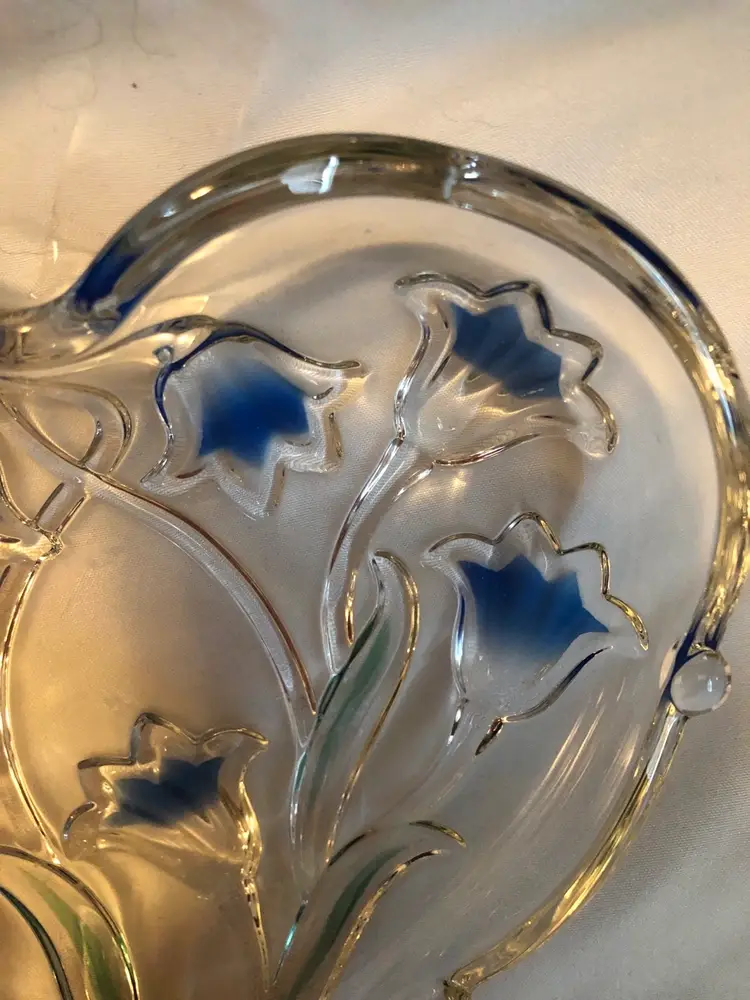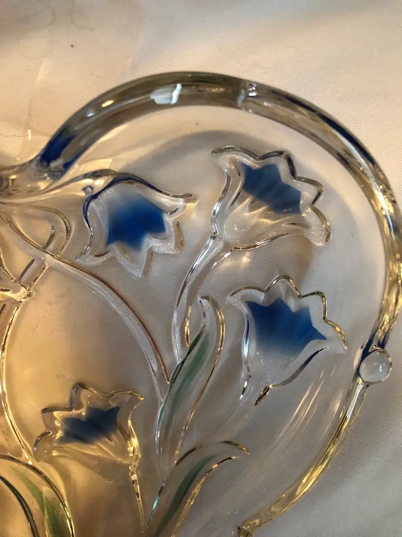Mikasa heart shaped crystal dish decorated with beautiful bluebells that are reverse painted. In excellent condition with no cracks or chips. Approx. 6 inches across.