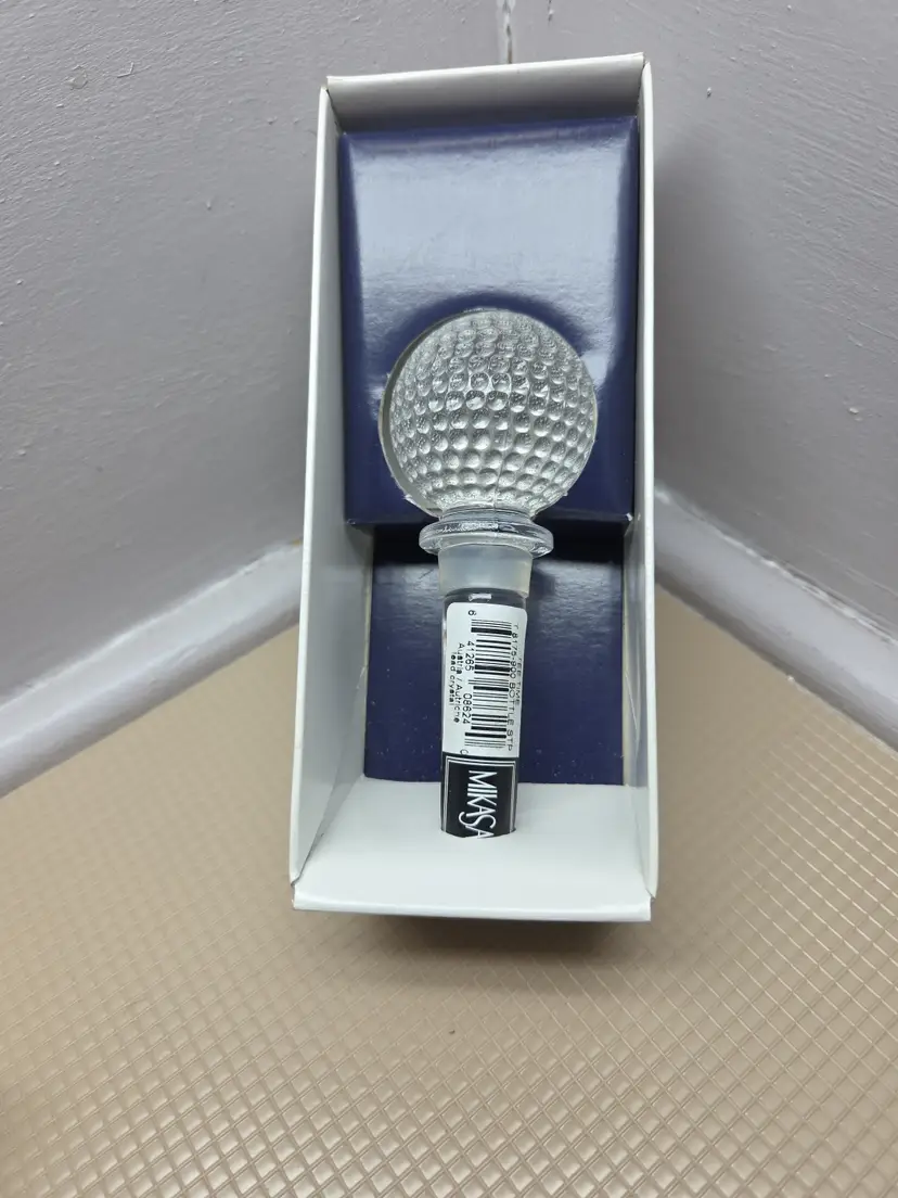 The Mikasa Lead Crystal "Tee Time" Golf Ball Wine Liquor Bottle Stopper is a luxurious and stylish addition to any bar or kitchen. Made of clear crystal with a golf ball theme, this bottle stopper adds a touch of elegance to your dining table or counter. Its leak-proof design ensures your wine or liquor stays fresh for longer. This unique and functional piece from Mikasa is perfect for all occasions, bringing a sporty yet sophisticated flair to your home. Made in Austria, this high-quality bottle stopper is a must-have for golf enthusiasts and those who appreciate fine craftsmanship. B-1
