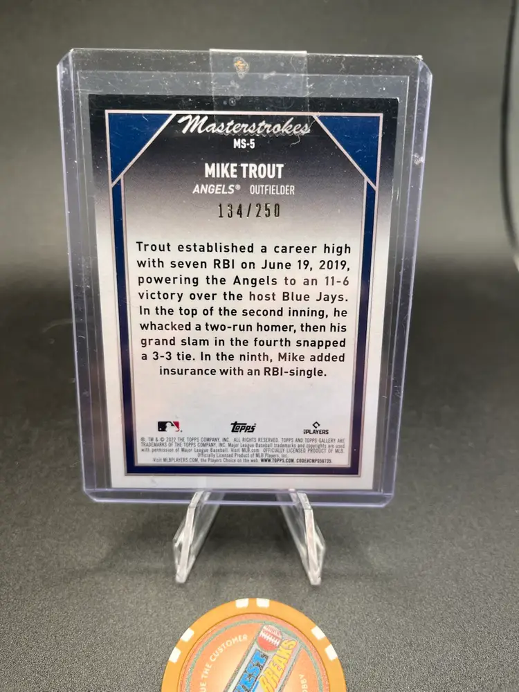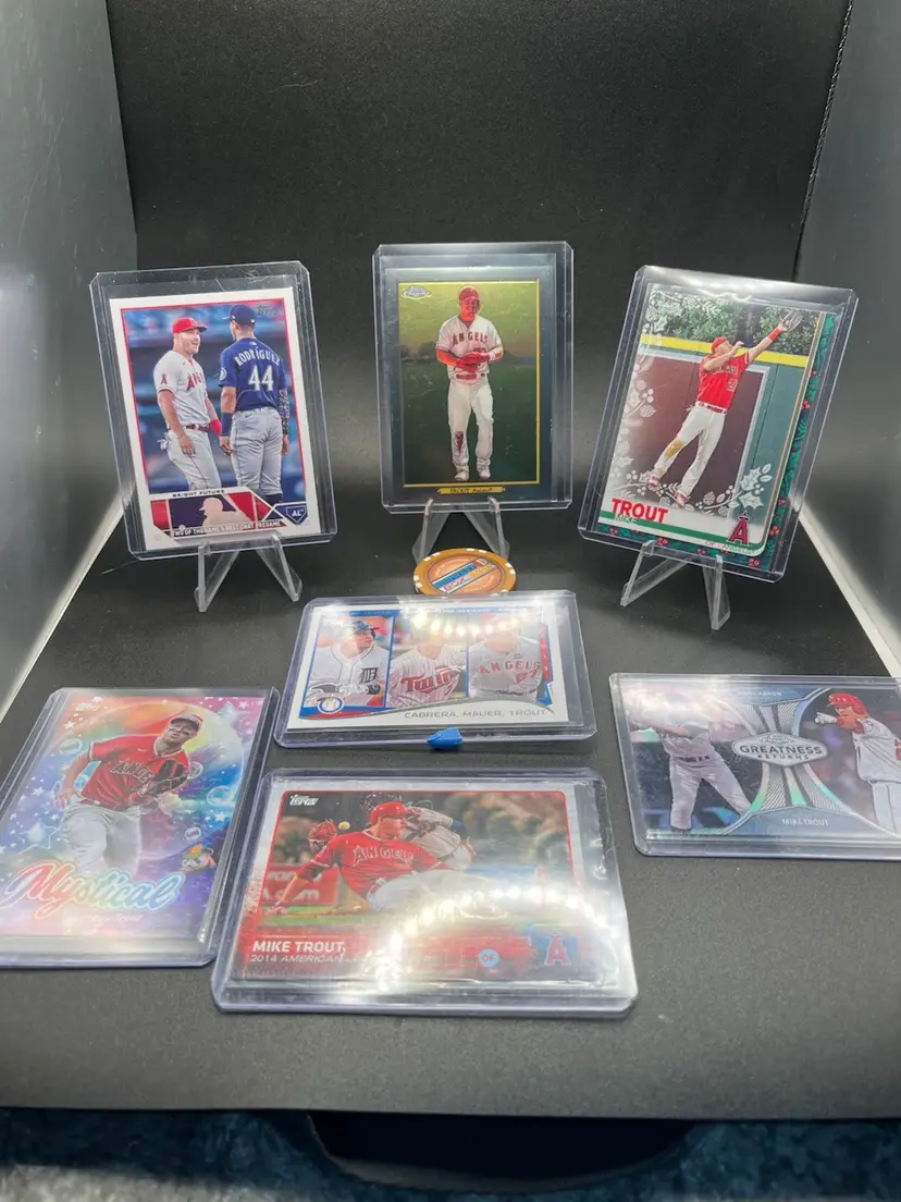 This is a 17-card Mike Trout lot including cards from 2013-2024. Also includes a Topps Gallery green /250 Trout. Soft corner/whitening on that card. Nice chrome cards, holiday cards, Mystical and an Aaron/Trout combo card.