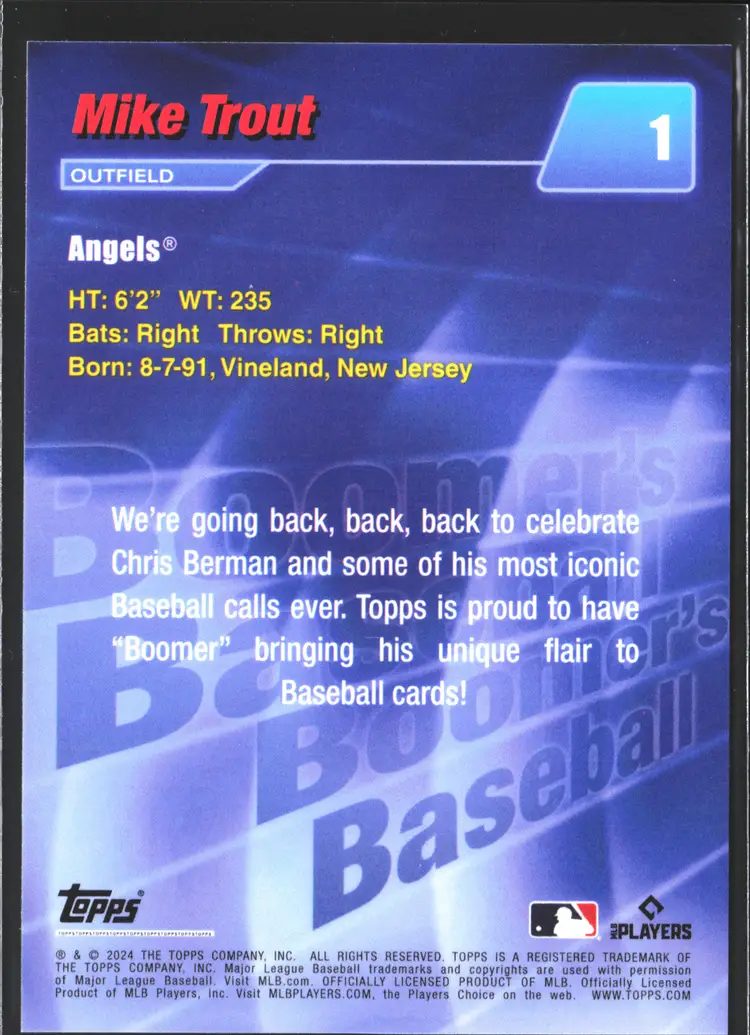 1st time buyer? Get $5 Off with code DISTRICT5 at checkout! Card as shown. All cards $20 and under ship PWE via lettertrackpro [https://www.letter-track.com/registerap.asp?AFID=8757] Sport: Baseball Season: 2024 Manufacturer: Topps Type: Sports Trading Card Set: 2024 Topps Chris Berman Boomer's Baseball Features: Parallel/Variety Parallel/Variety: Silver Player/Athlete: Mike Trout Autographed: No Year Manufactured: 2024 Vintage: No Graded: No Autograph Authentication: Topps Team: Los Angeles Angels League: Major League (MLB) Material: Card Stock Original/Licensed Reprint: Original Country/Region of Manufacture: United States