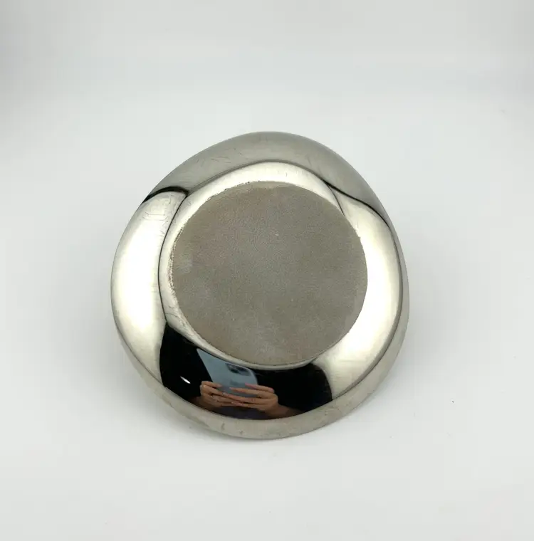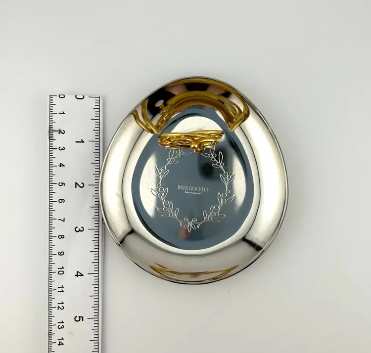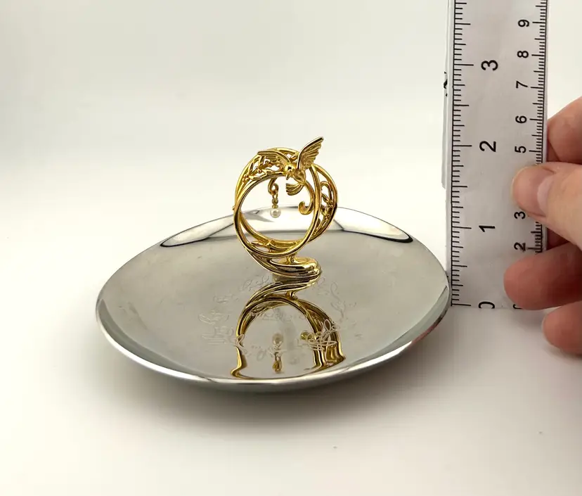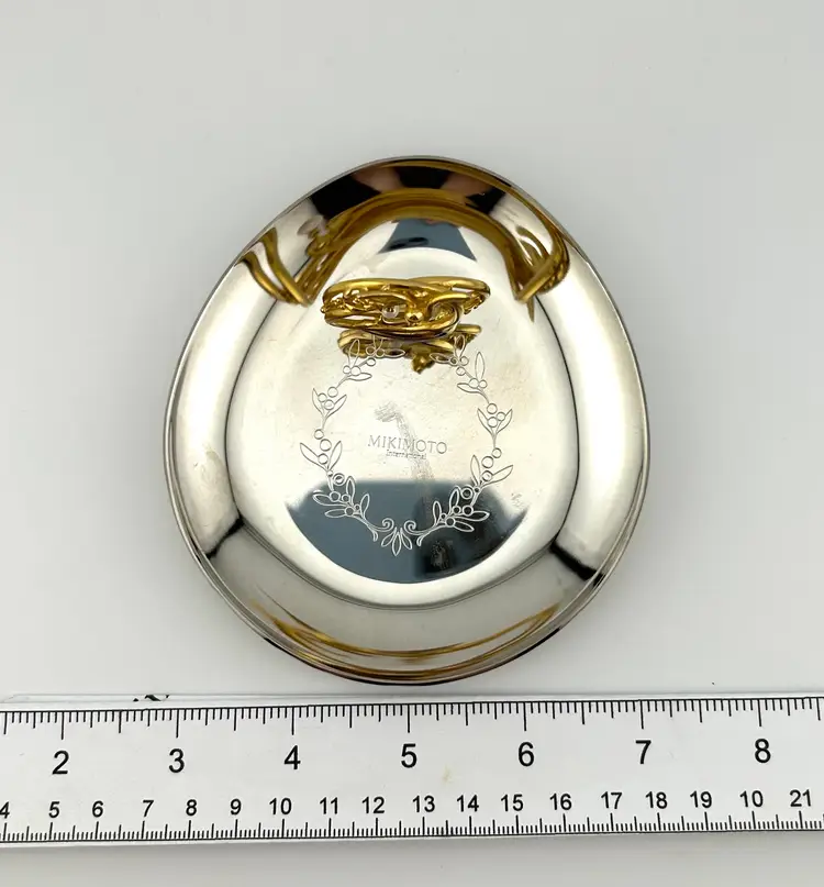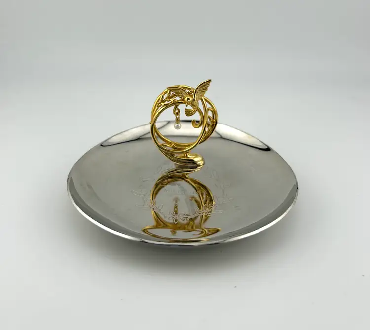 Plated in stainless steel or pewter. Gold colored metal bird handle with akoya pearl. There is a smudge through the middle of the dish. I tried to polish it out but it wouldn’t budge.