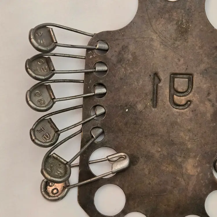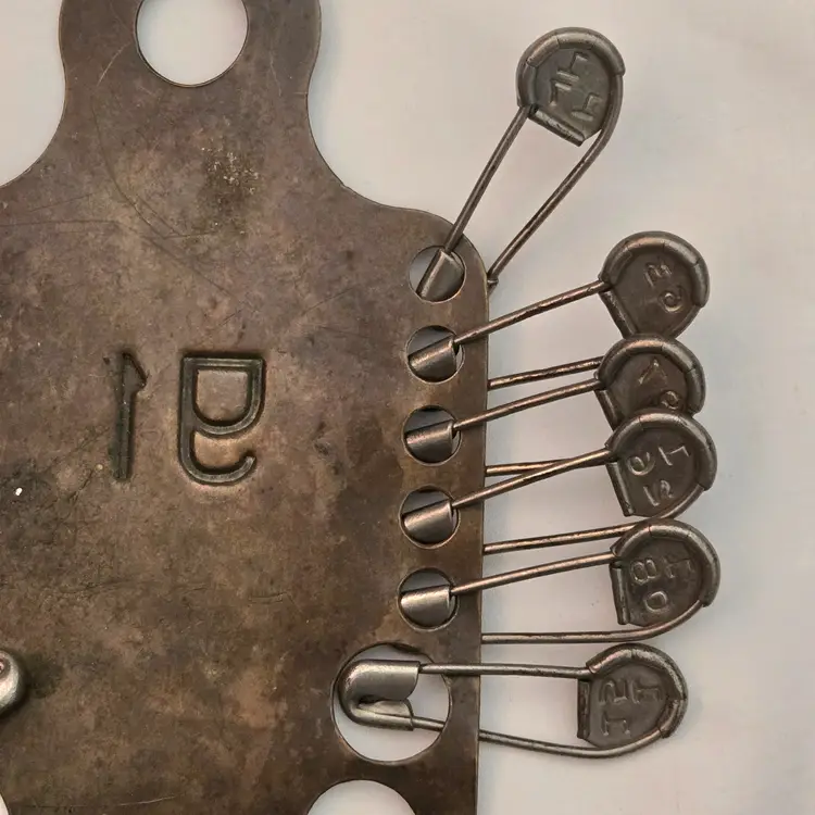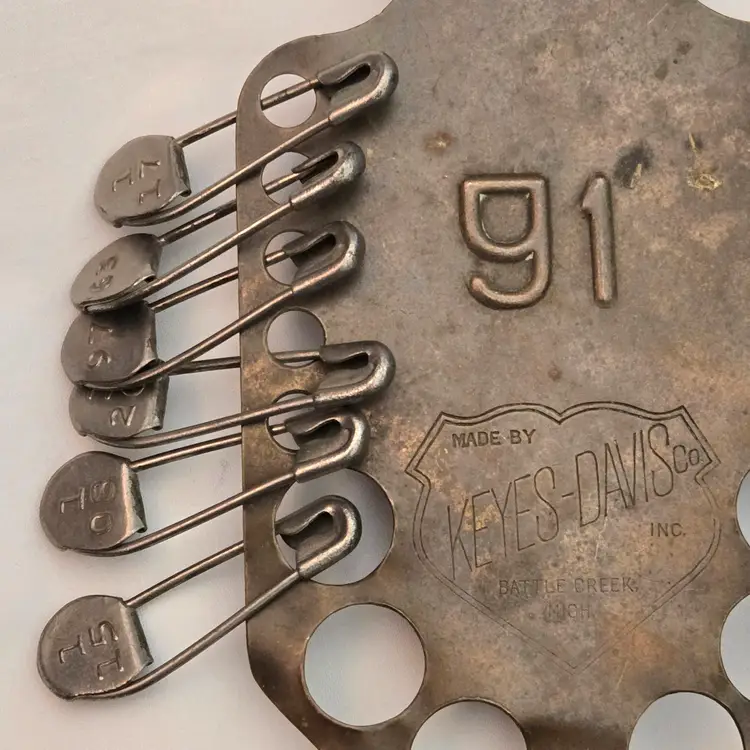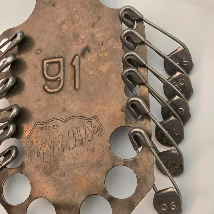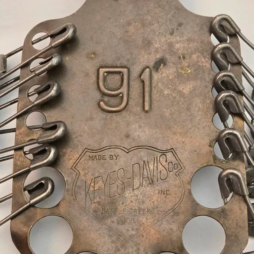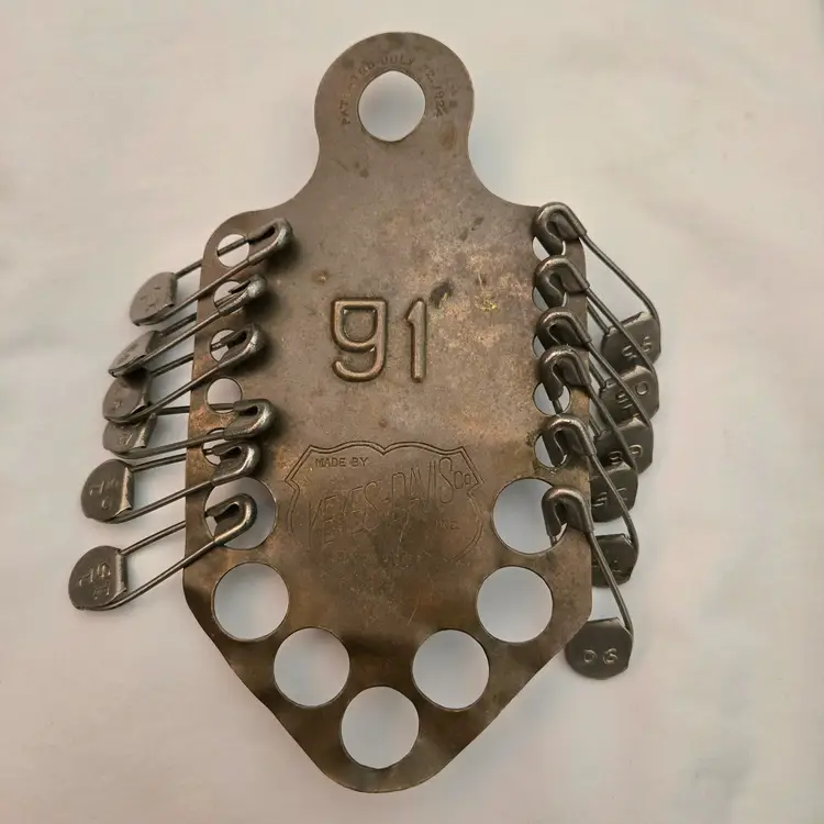 Military Laundry Tag Holder with Metal Laundry Tags #91 Keyes-Davis Antique 6⅝" Long. Used condition with tarnish, bends, scratches, stains, missing tags, etc. from extensive use. Please view all the photos and please ask any questions prior to purchase when possible.