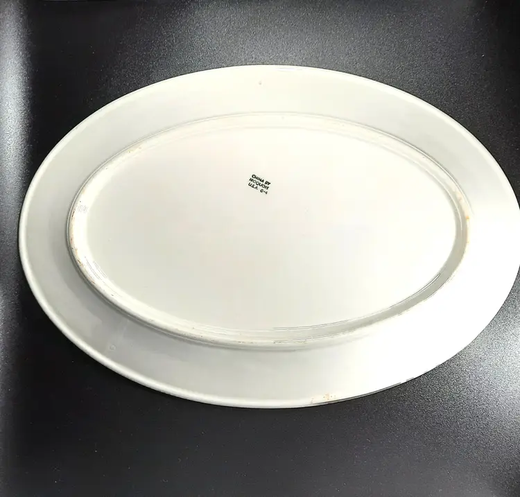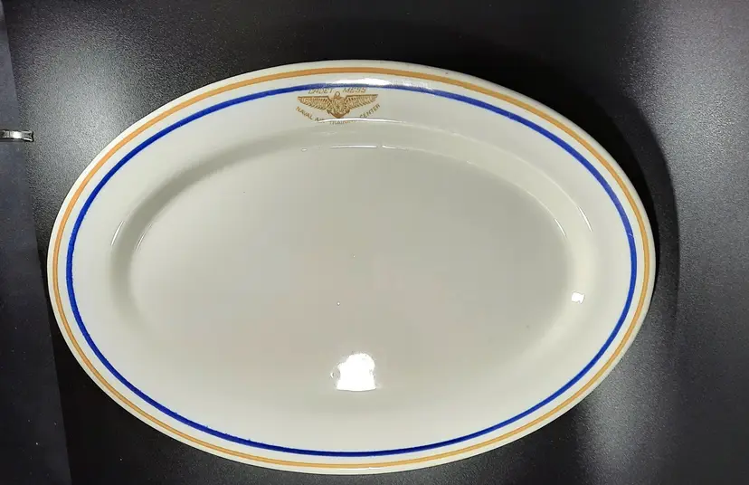 In 1914, the navy opened Naval Air Station Pensacola, Florida, dubbed the "Annapolis of the air", to train its first naval aviators. Candidates had to have served at least two years of sea duty and training was for 12 months. In 1917, the navy's program became part of the Flying Officer Training Program. This restaurant ware grade platter was made by Iroquois China in 1917. It was made for the Flying Officer Training Program Cadet Mess. This item was used by the cadets in the first program. It measures 15 1/2 inches by 10 inches. It is in excellent pre-owned condition with no damage.