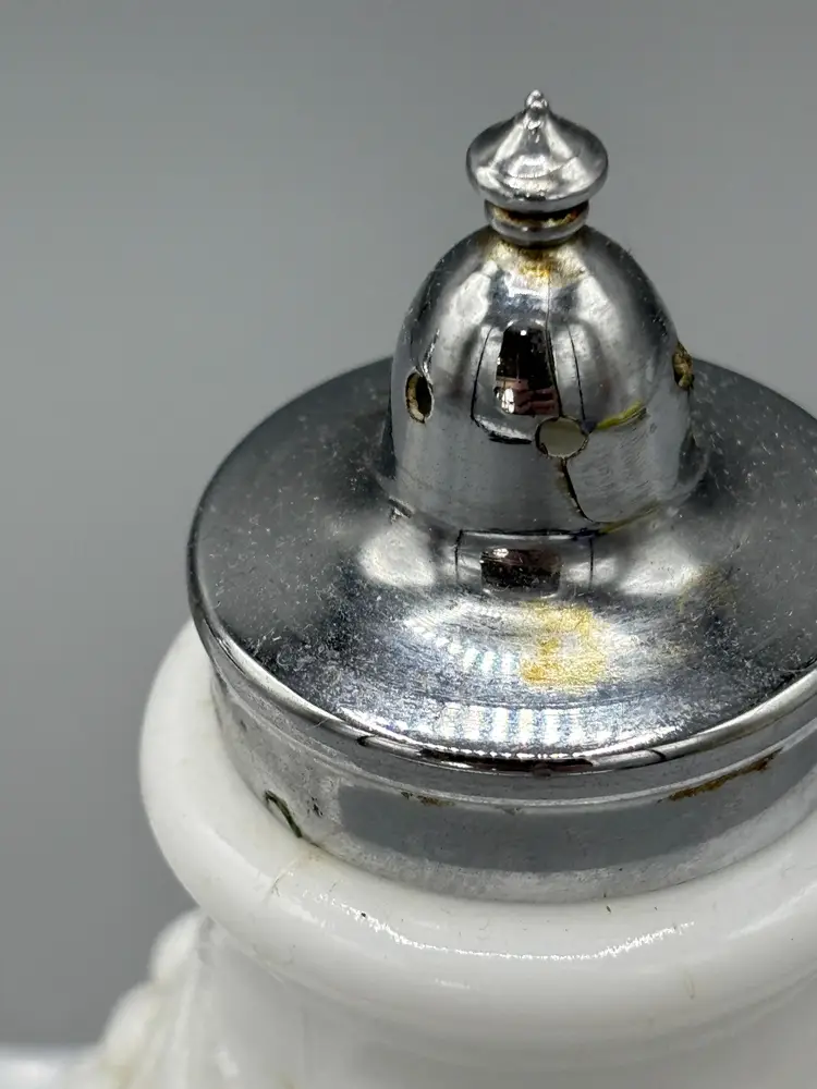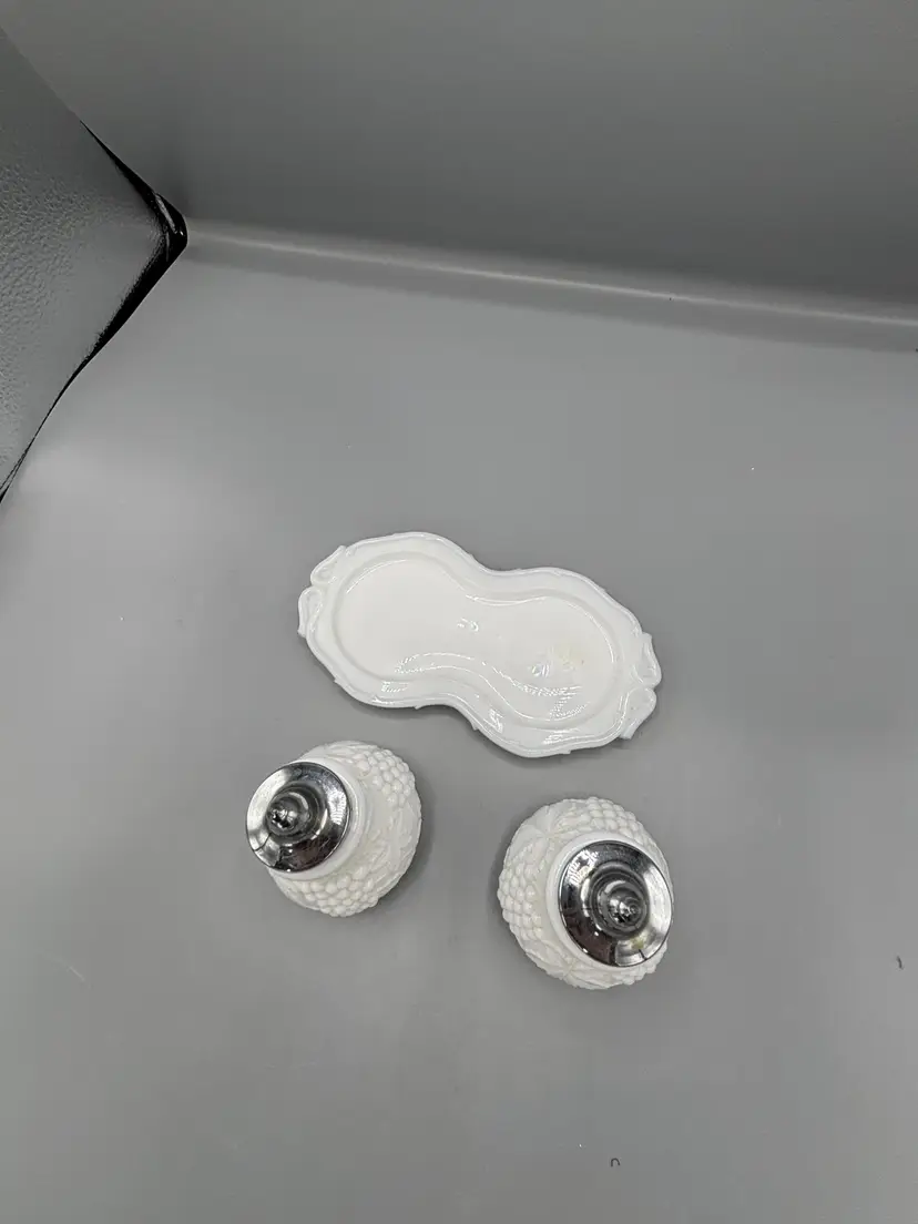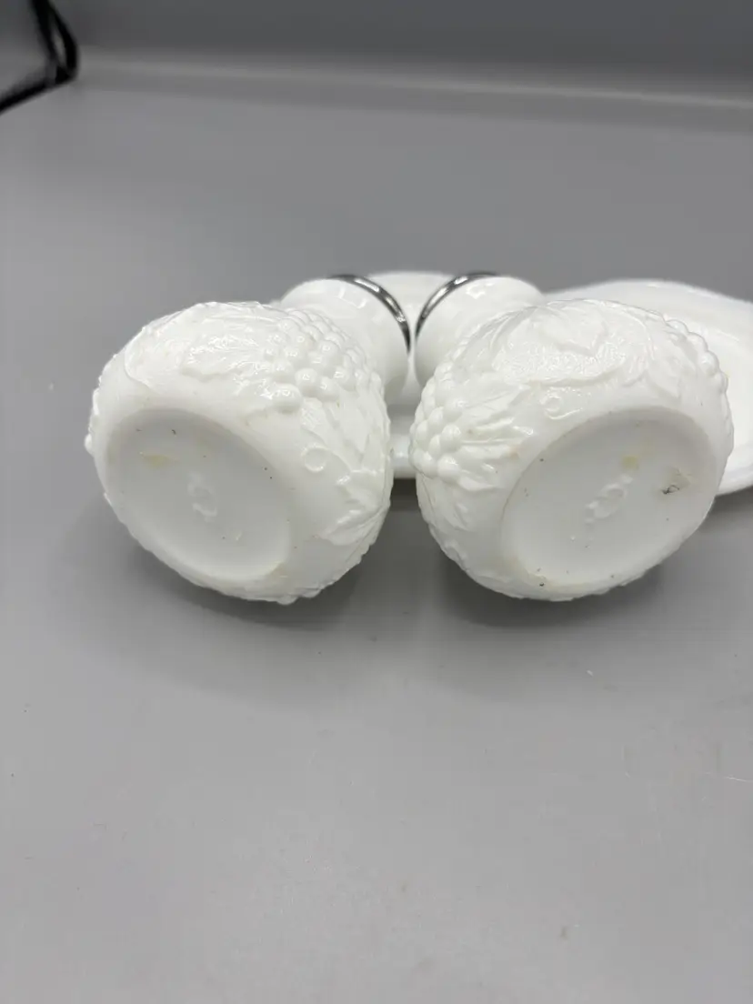 Milk glass 3 piece Tray, Salt & Pepper set that would make a great set to add to any collection or display. This is hard to find in this condition. Refer to pictures for details.