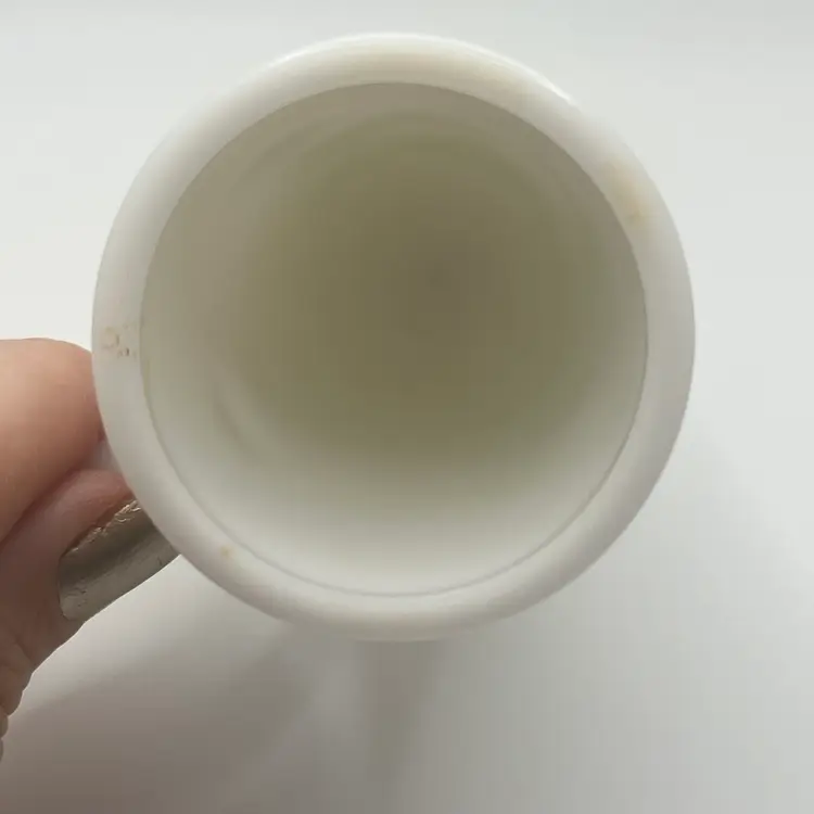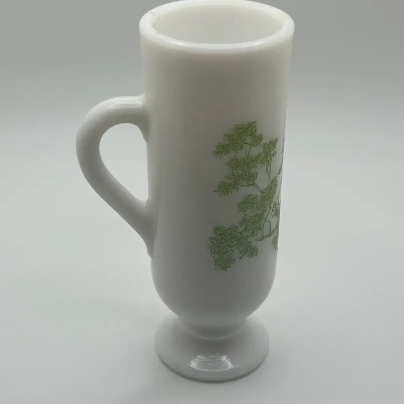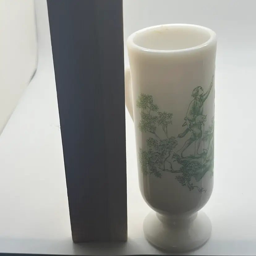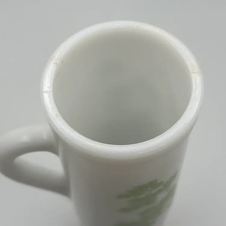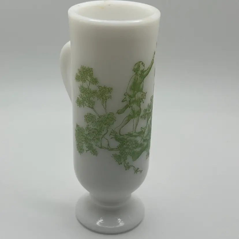 Very good vintage condition. vintage Avon milk glass demitasse cup with a green toile Victorian scene. These cups were sold by Avon, likely in the 1970s. Made of white milk glass and features a green toile design depicting a Victorian scene, often showing a man and woman with greenery or tarm animals. Originally intended for serving strong, after-dinner coffees like espresso or Turkish coffee, these small cups can also be used for tea or as decorative items like small vases or candlestick holders.