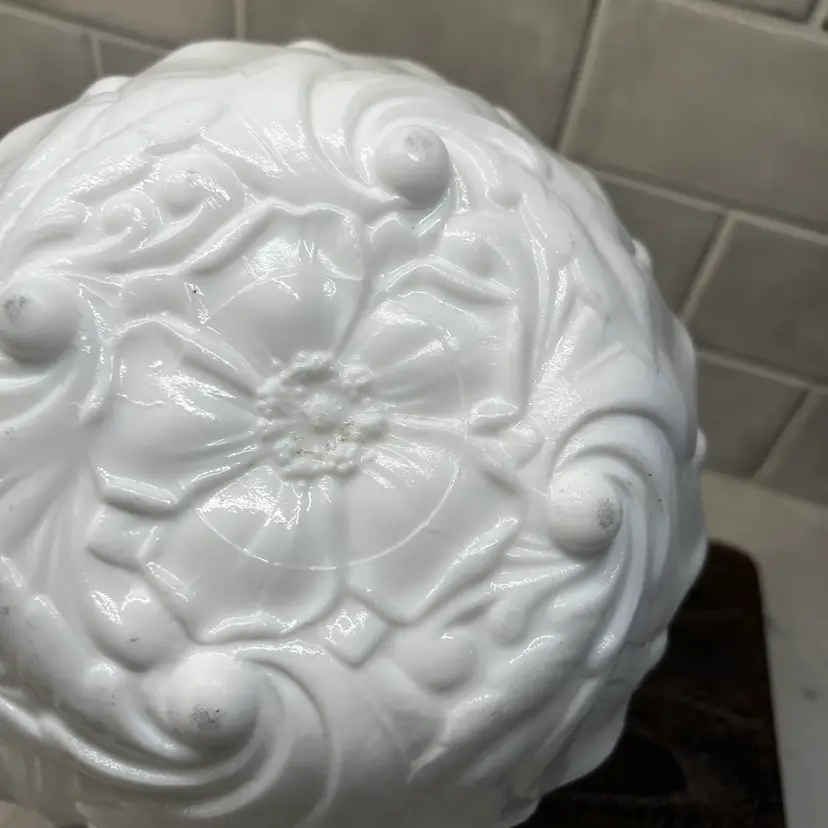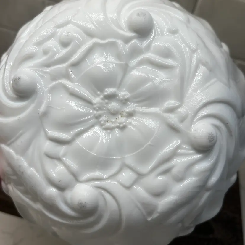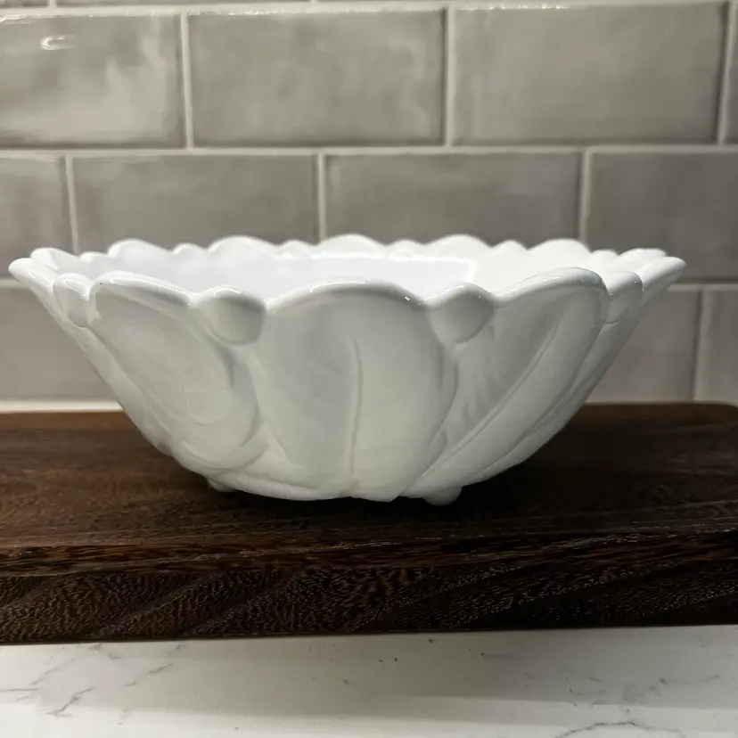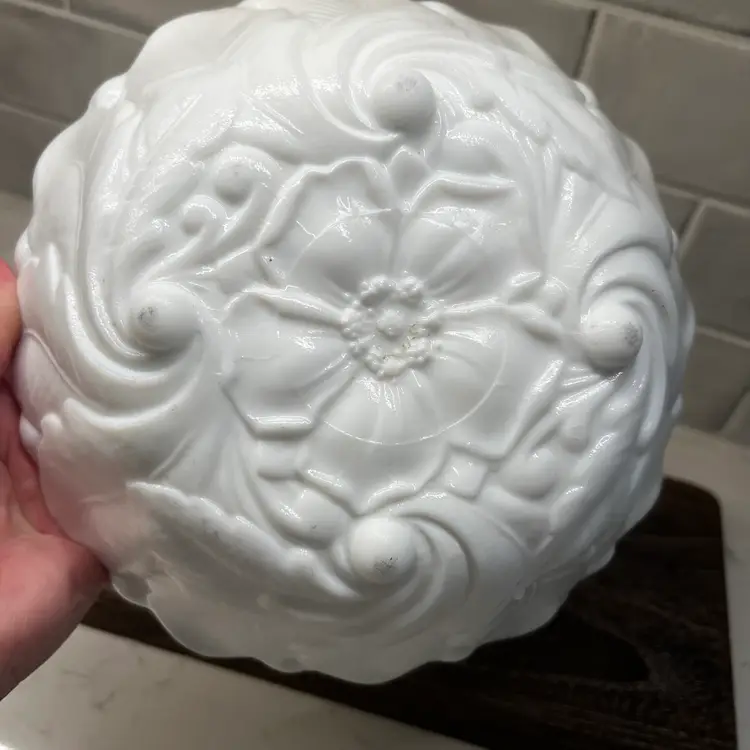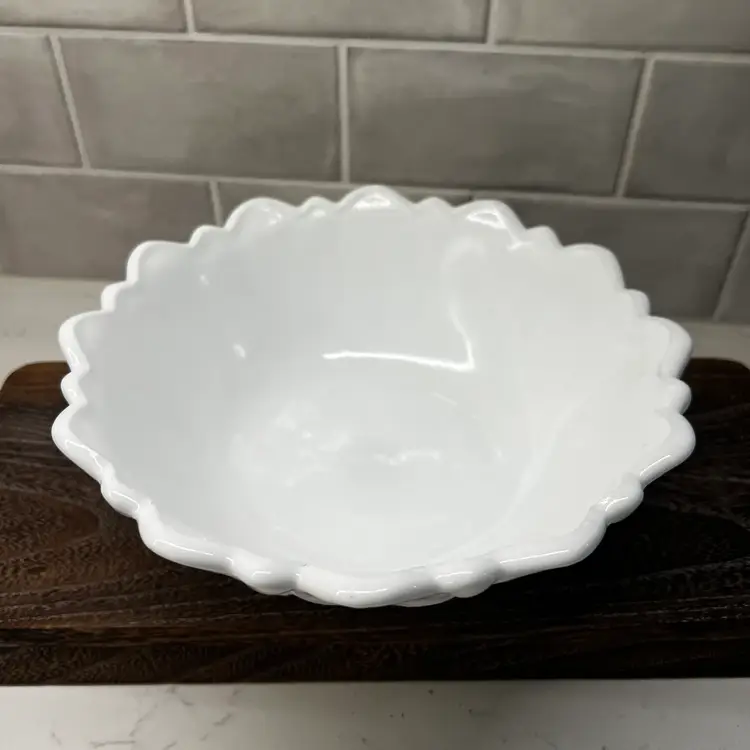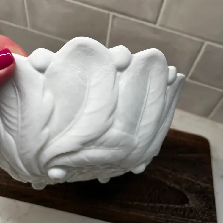 Milk glass pressed texture floral design. This is a discontinued piece. The outer edges are in a raised leaf pattern . The tips of the leaves form a scalloped edge effect around the top of the bowl . The bottom of the bowl is decorated with a wild rose.