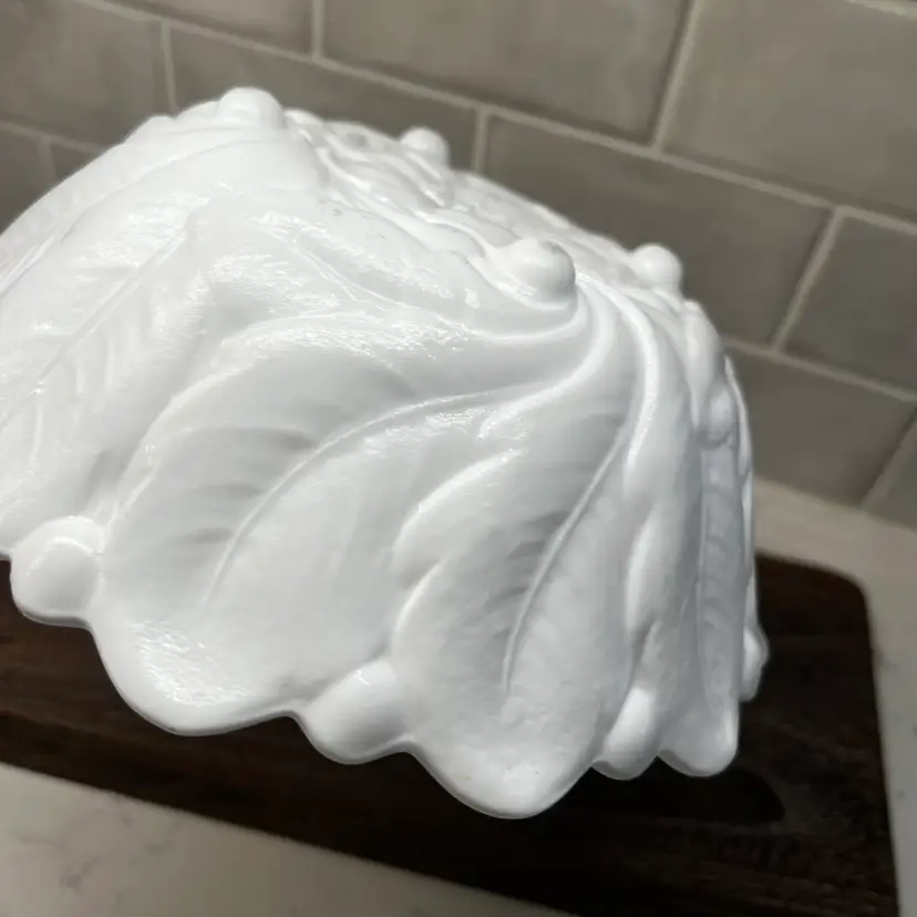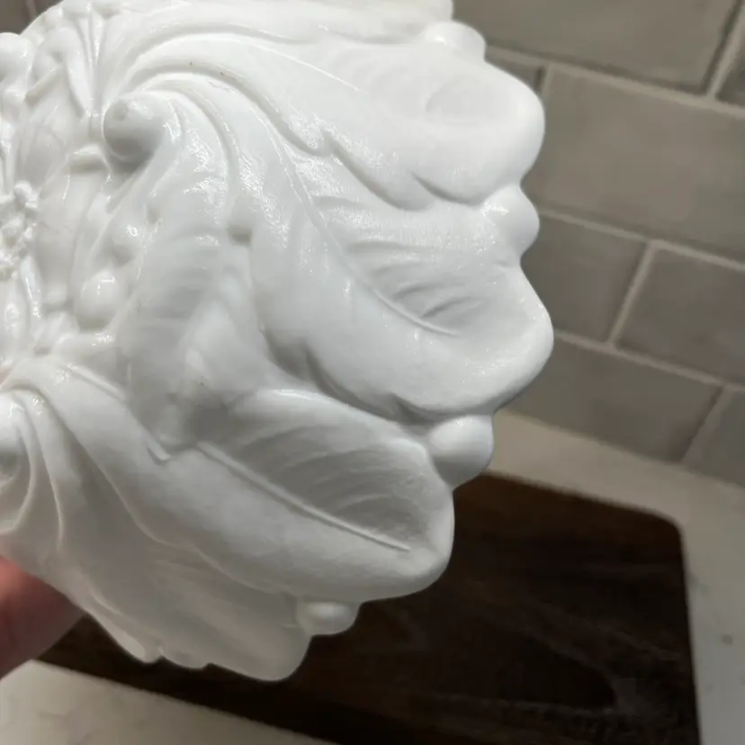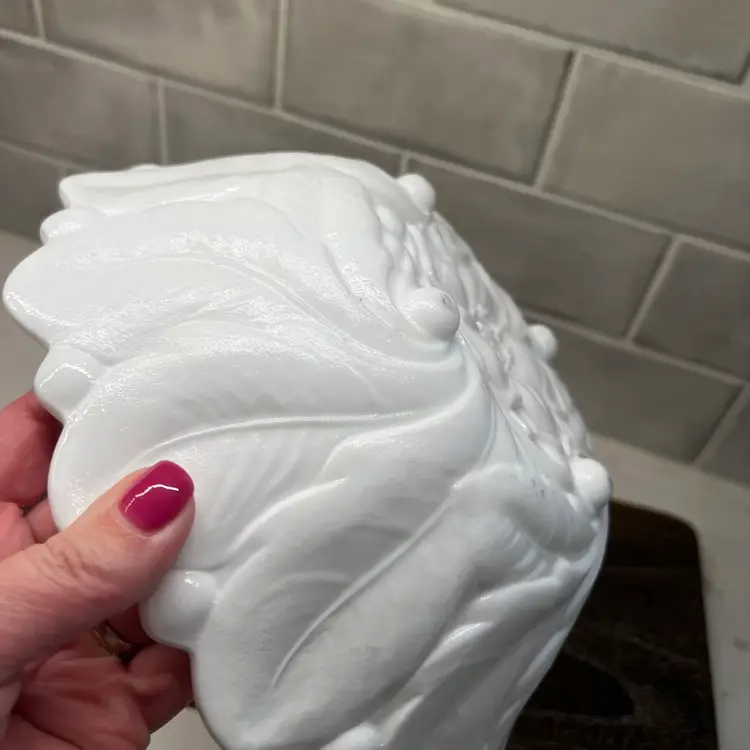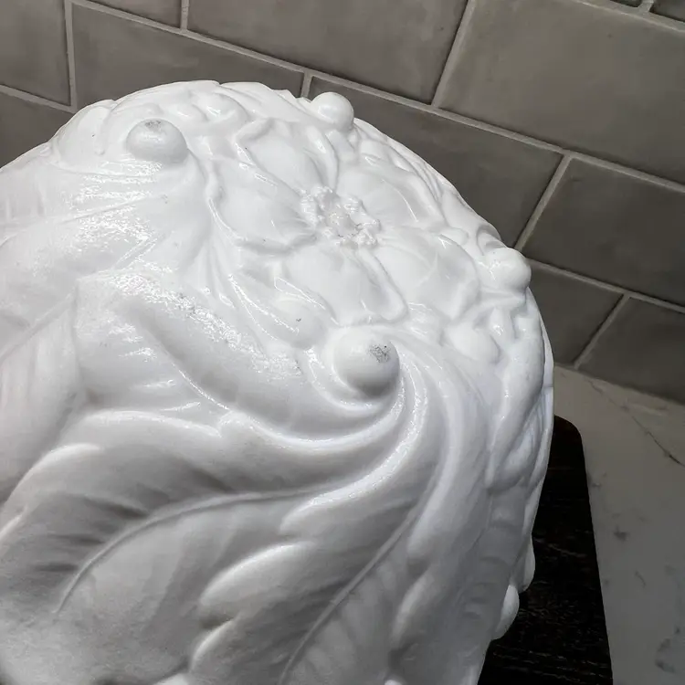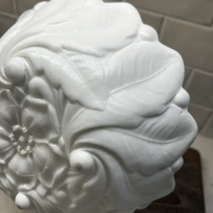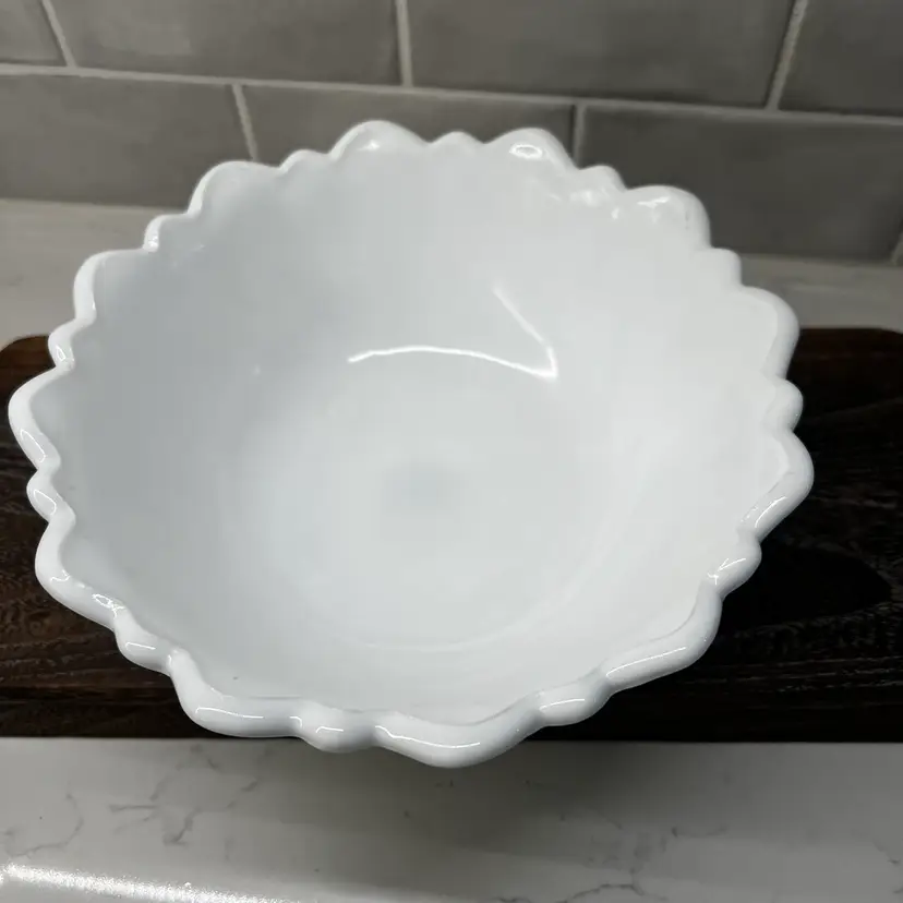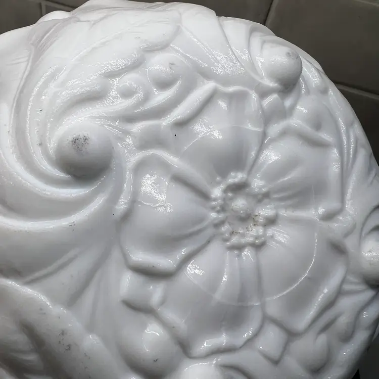 Milk glass pressed texture floral design. This is a discontinued piece. The outer edges are in a raised leaf pattern . The tips of the leaves form a scalloped edge effect around the top of the bowl . The bottom of the bowl is decorated with a wild rose.