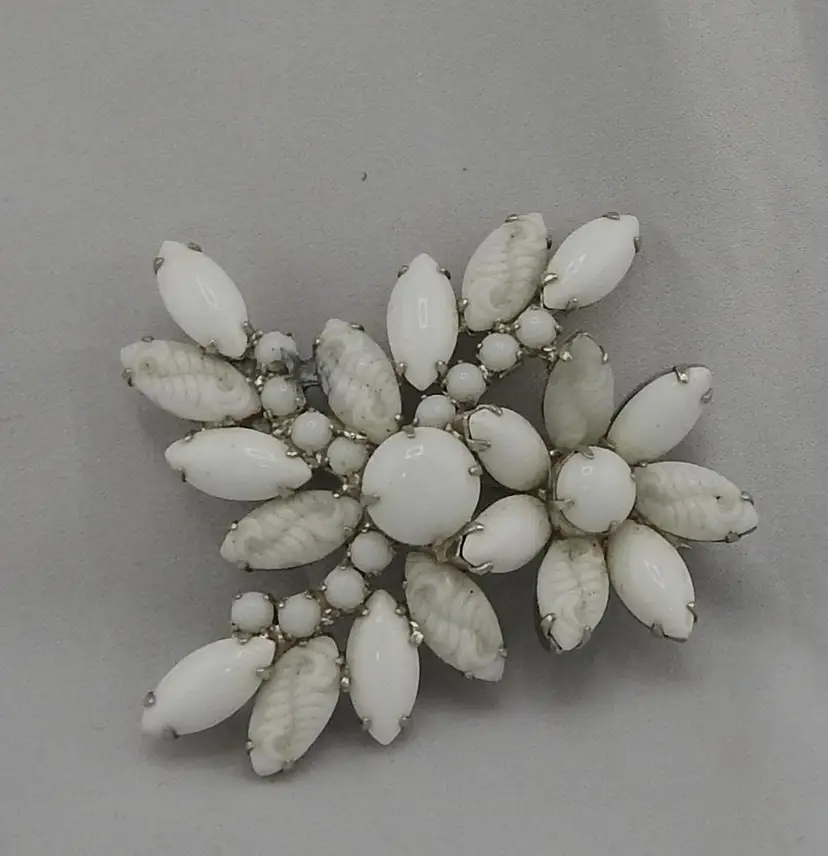 This brooch has milkglass molded leaves, great piece. Measures 2 3/8" 2 3/4" Condition is excellent, no chips, appears to have never been worn. working clasp Unsigned