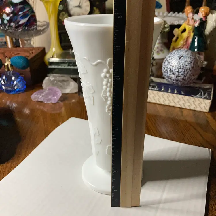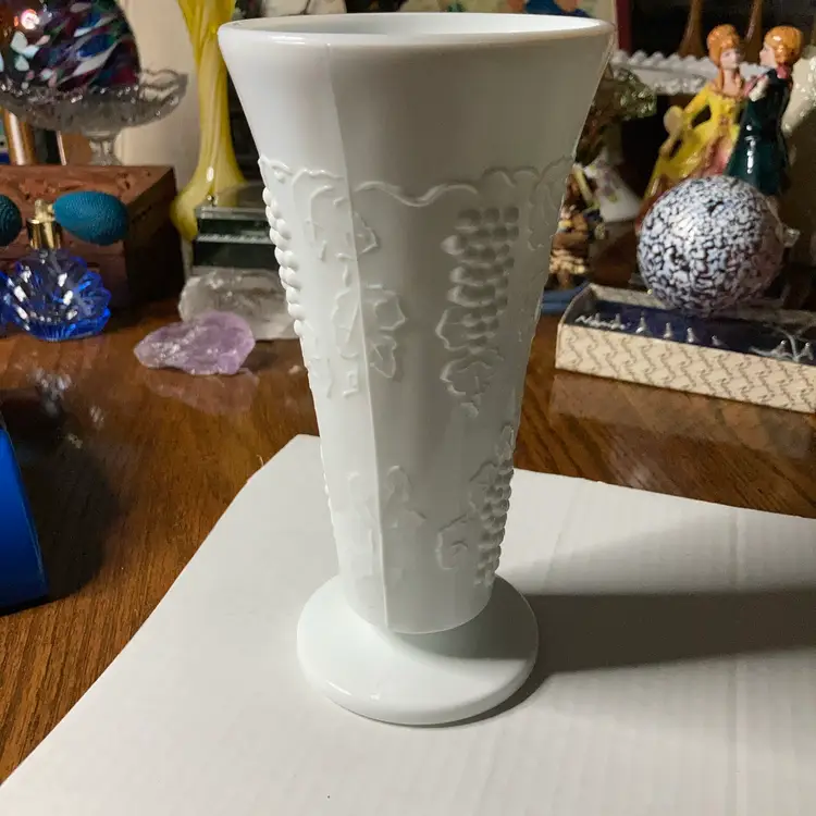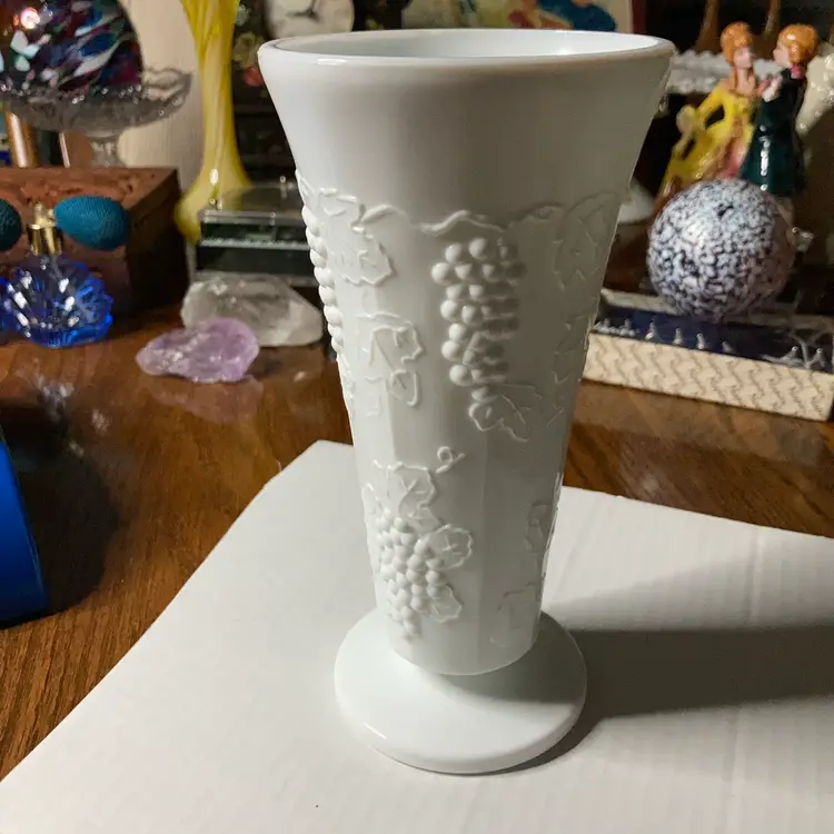 Milkglass Vase! Grapevine Pattern! Just Over 7 1/2” Tall! NEW to District? Enter code Michel42 into your wallet prior to your first ever purchase and save $5 off any $10 or more! Give me a Follow and I WILL Follow you back!