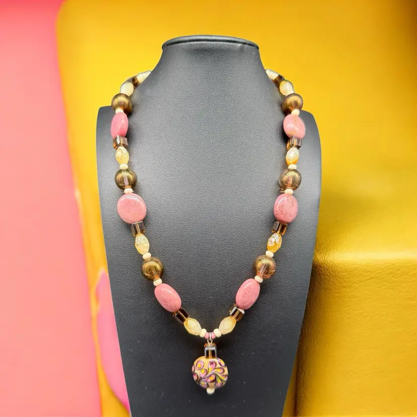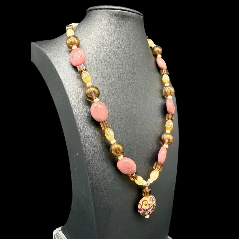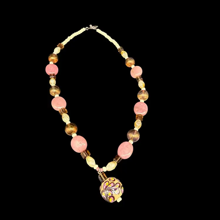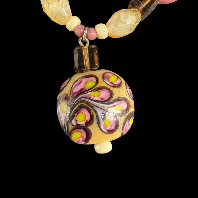 This beautiful artisan pendant necklace features a round, multi-color Millefiori art glass pendant carefully strung on a beautiful strand of glass and stone beads. The necklace has a 17-inch length and a sterling silver toggle closure. The glass pendant is accented with faceted rock crystal stones, pink rhodolite discs, and bronze AB coated squares, adding a touch of natural beauty and whimsy to the piece. The magical necklace captures a bohemian vibe with its unique design, making it a perfect accessory for any occasion where a touch of beauty and mysticism is desired.