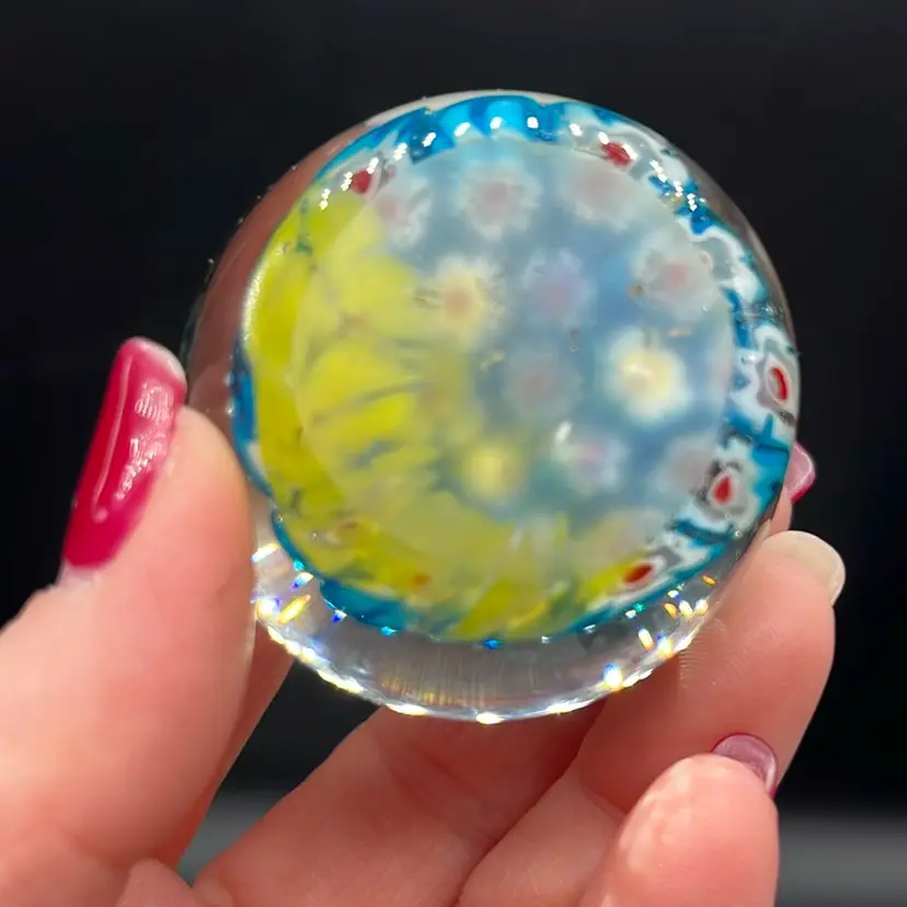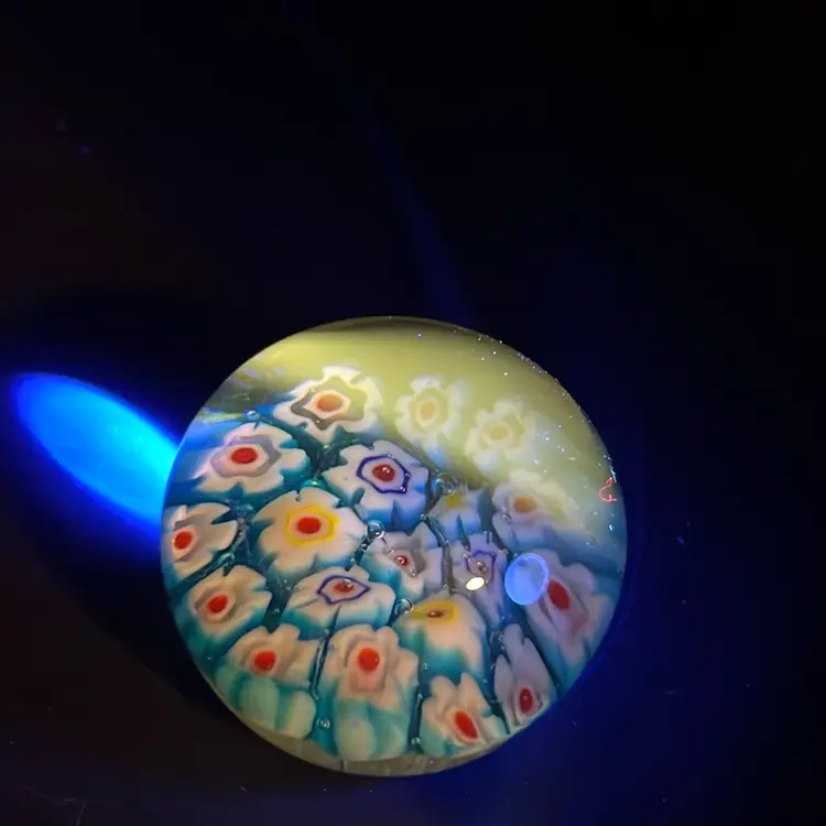 Features blue, white, and red floral-style canes arranged in a mosaic pattern. Glows a little green under UV. Some minor surface scuffing but no chips or cracks. Approx: 1.75”