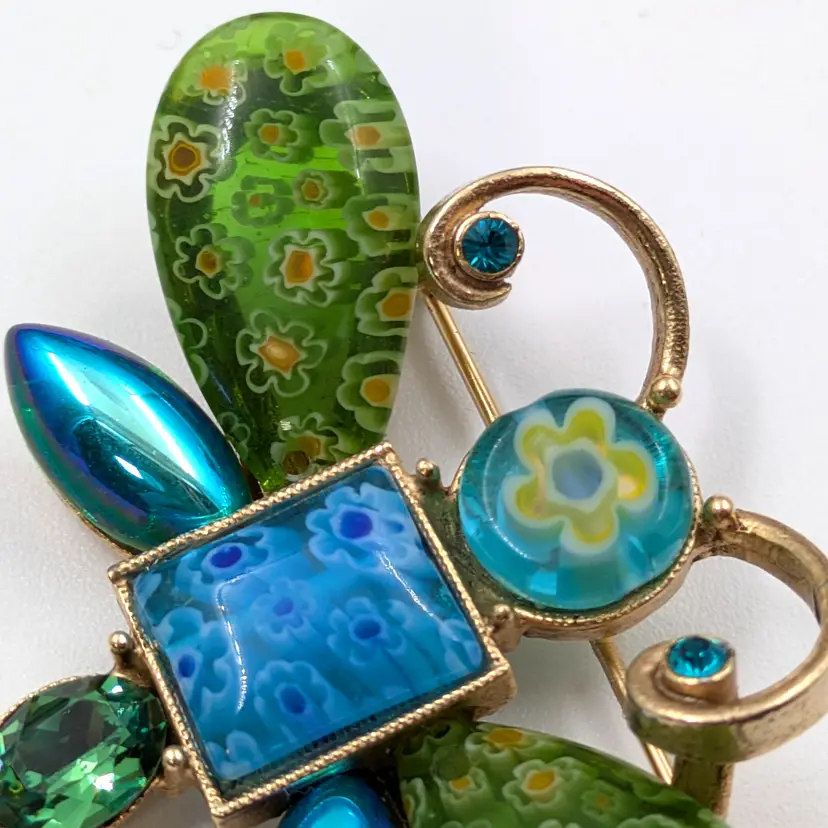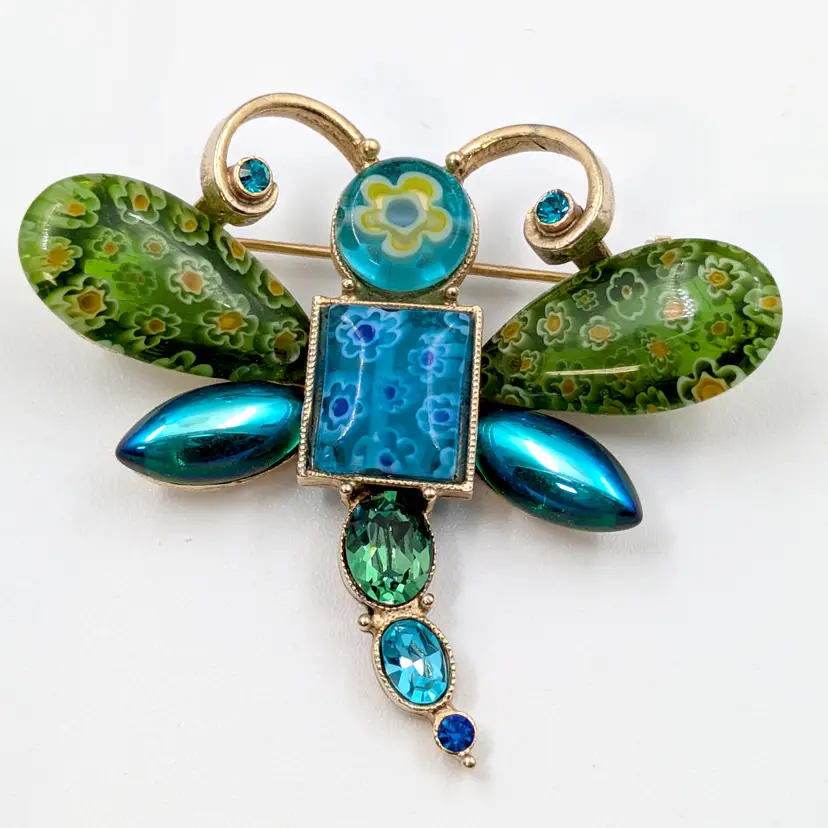 Charming dragonfly shaped brooch featuring vibrant millefiori glass wings and sparkling blue rhinestone accents. Excellent vintage condition. Signed on the back Sweet Romance USA