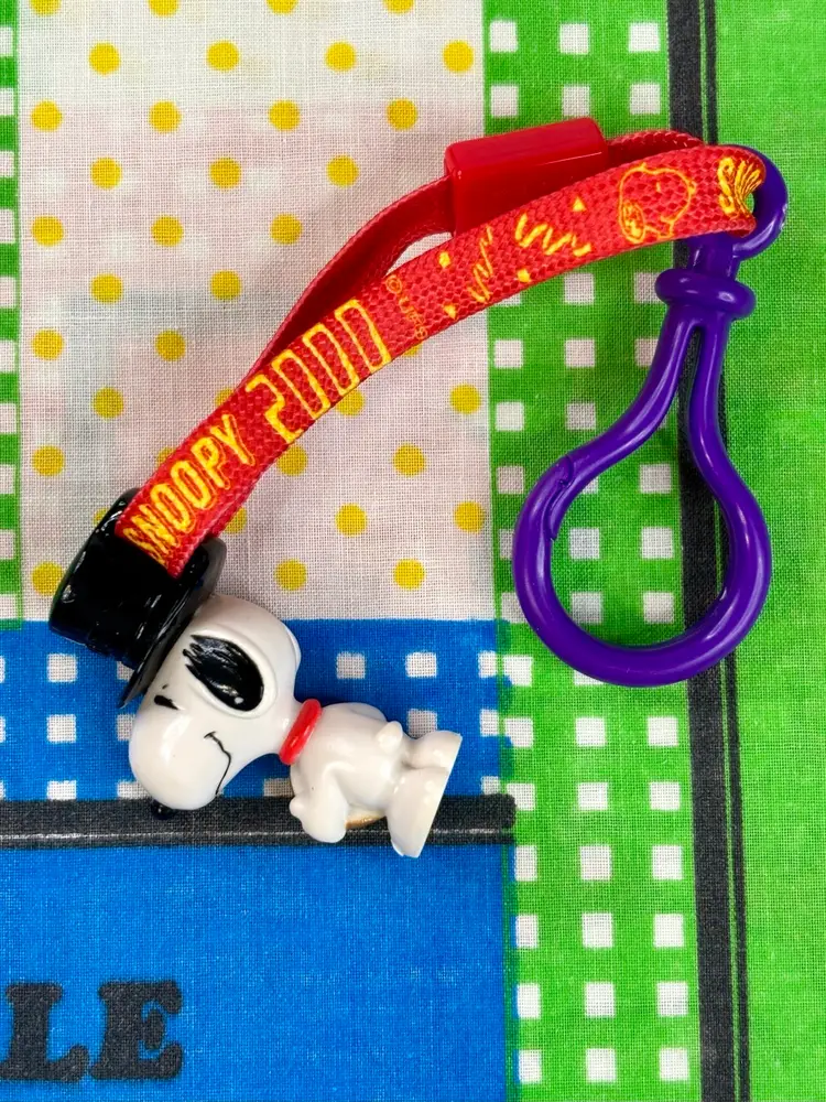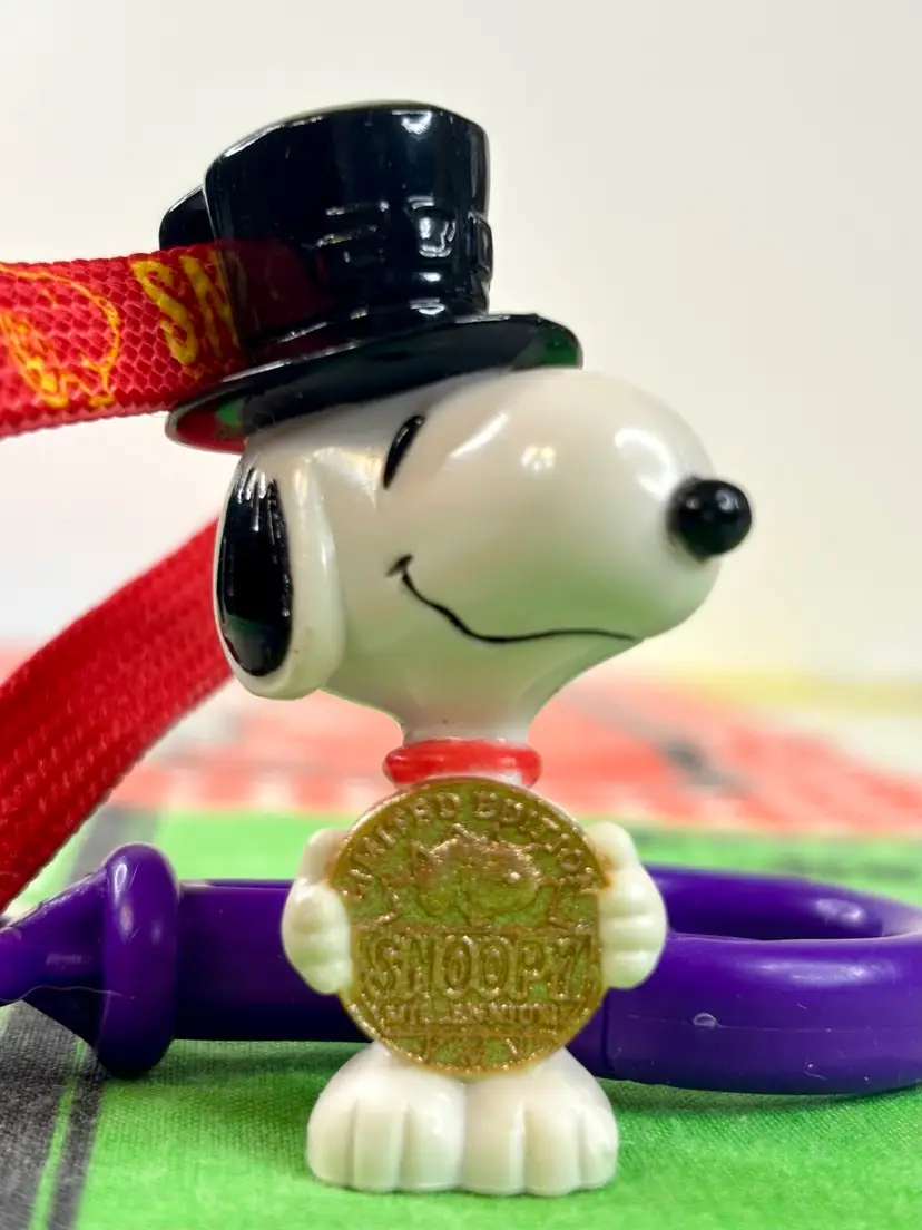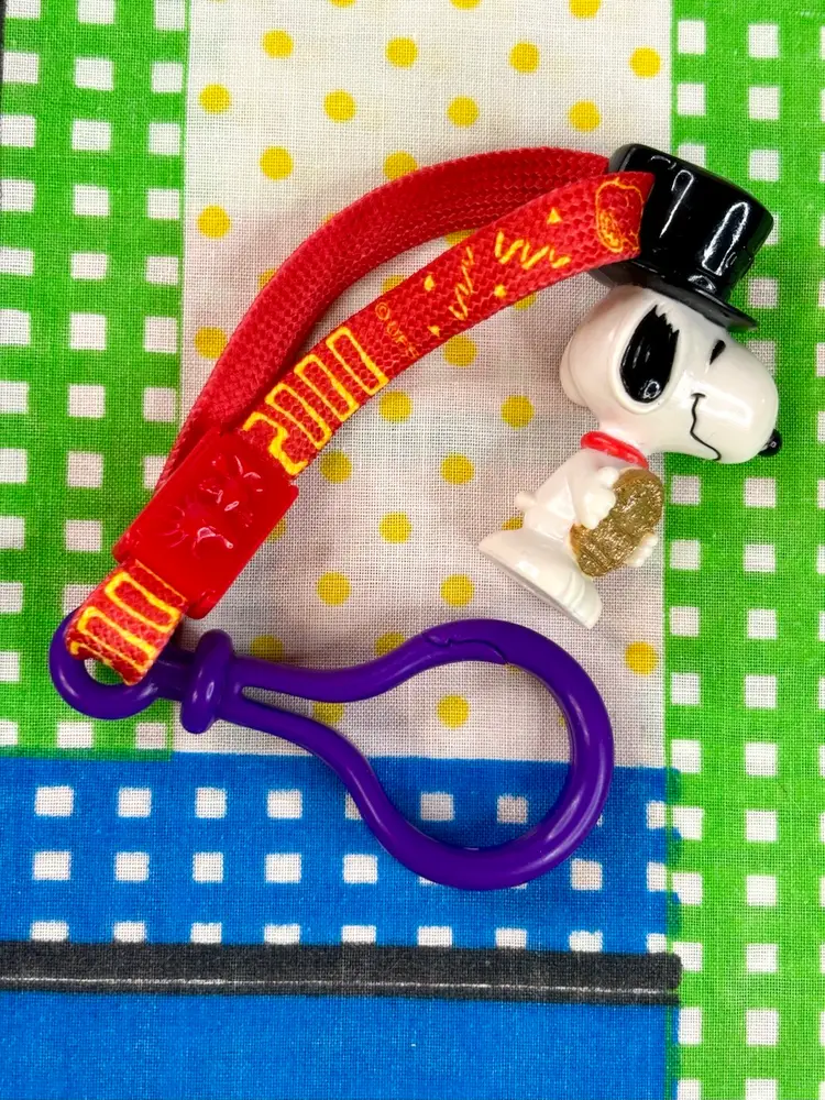 This fun PVC features Snoopy with a top hat, holding a gold limited edition Millennium medallion with his face on it. The “ribbon” is similar to a thick shoestring in material. It says “Snoopy 2000” and has a small clip with a picture of Woodstock as well as the larger bag clip. What a perfect way to party!