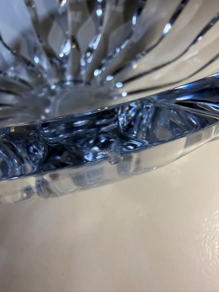 This very heavy, full-lead crystal features distinct vertical cuts or rays radiating from the center to the rim.