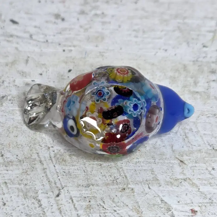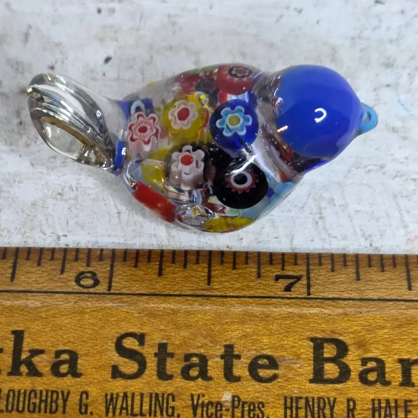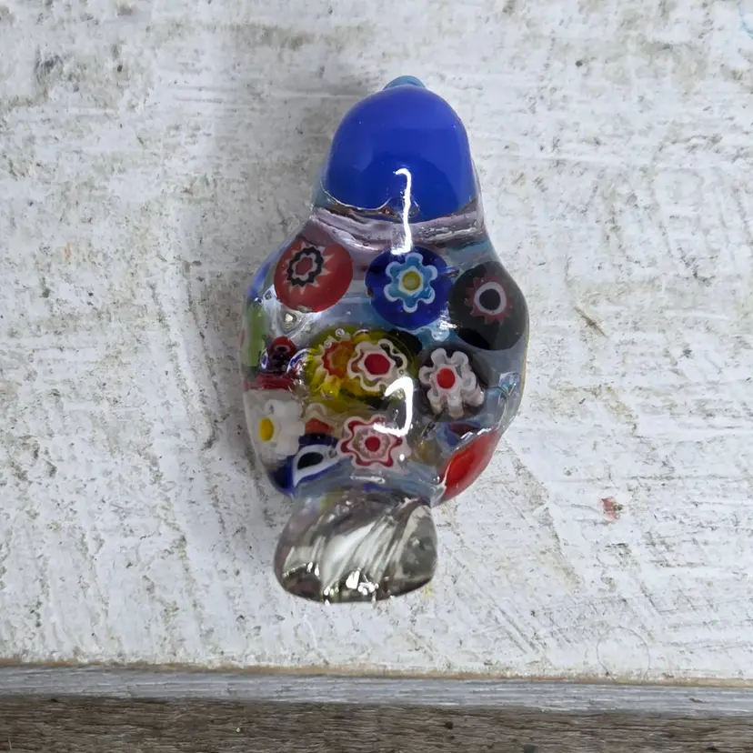 This gal is made with a white seed bead beak. Hear head is from a bead that came from my craft pole. Her tail is clipped from a necklace and filed down to fit and her body is filled with Millefiori style beads.