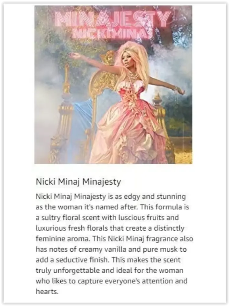 It has a floral and fruity note for women by Nicki Minaj. Top notes are Red Berries, Lemon and Peach; middle notes are Frangipani, Orchid and Magnolia; base notes are Tonka Bean, Vanilla and Musk. Sounds yummy!