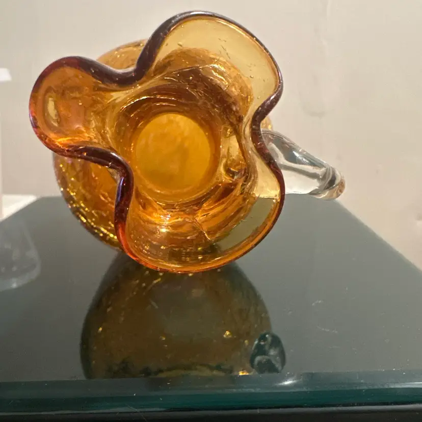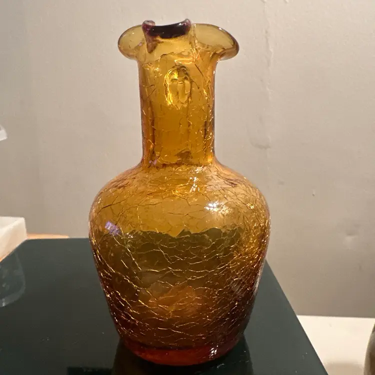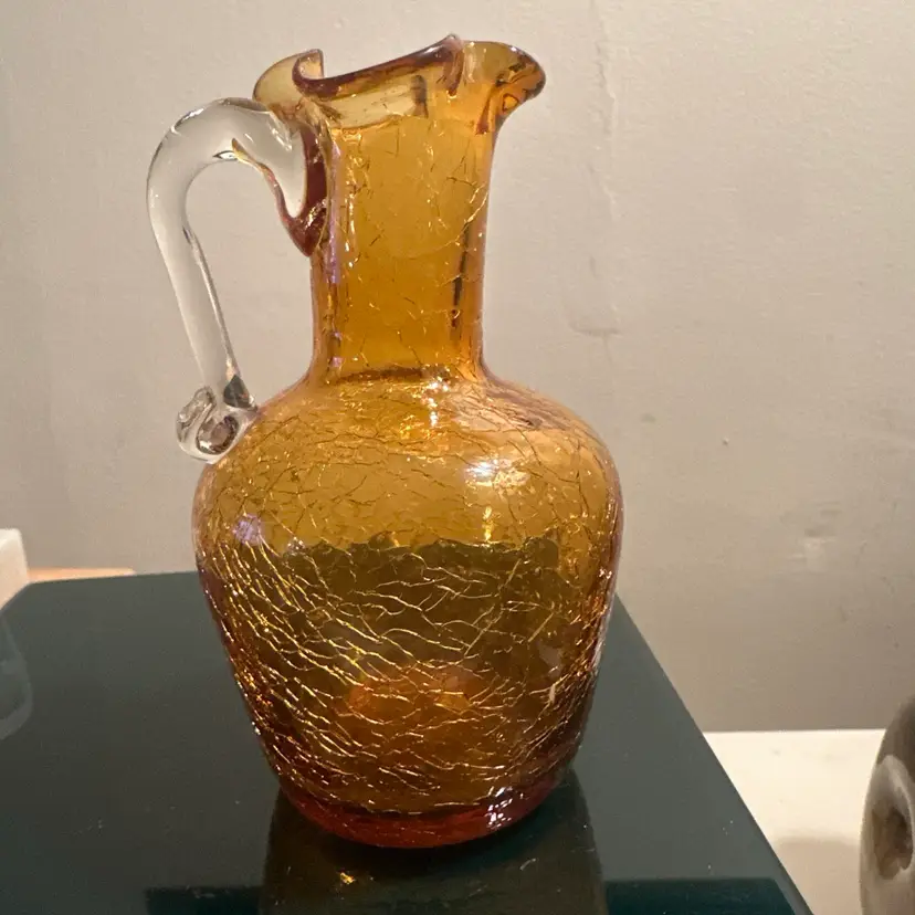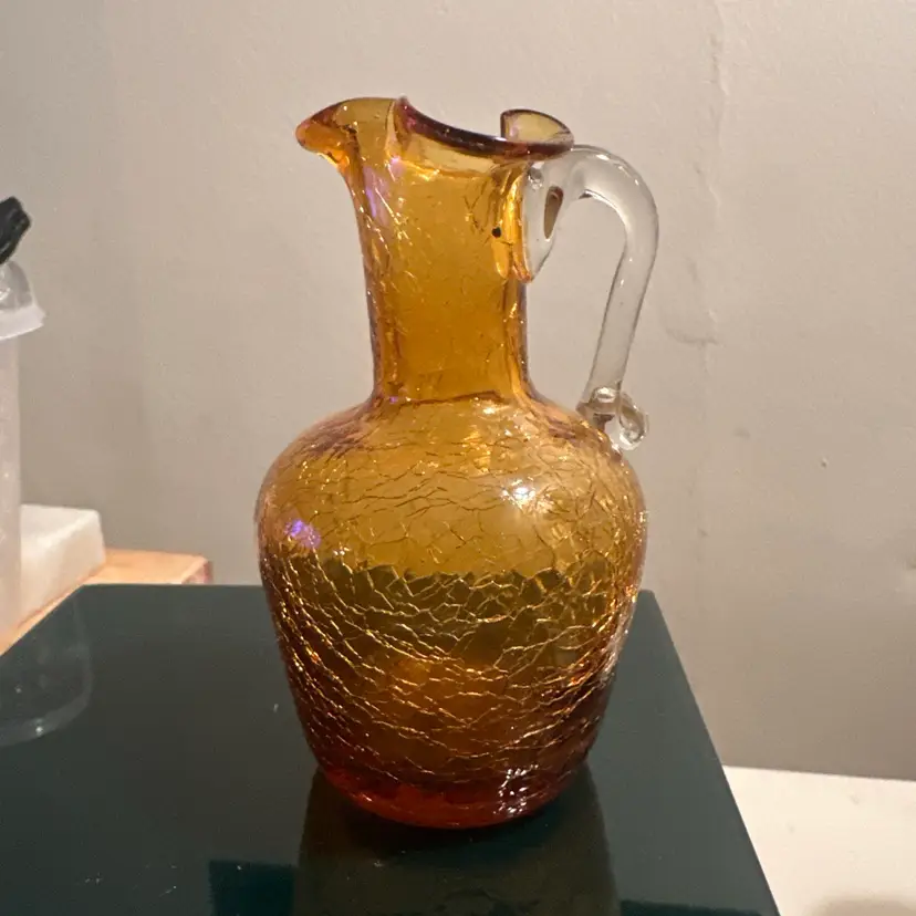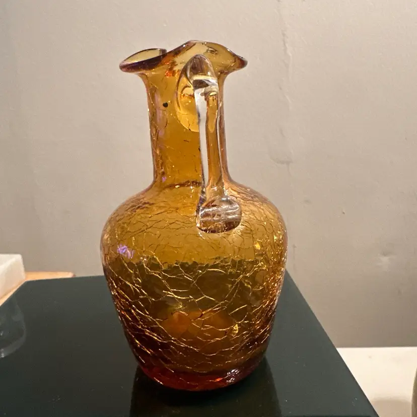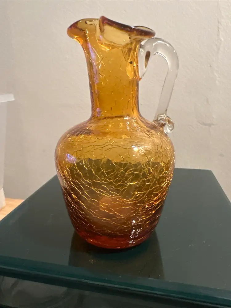 This elegant mini amber glass pitcher has a unique crackle design. Perfect for adding a touch of sophistication to your home decor. It measures about 4 1/2 inches tall by 3 inches. It is BLENKO in Style.