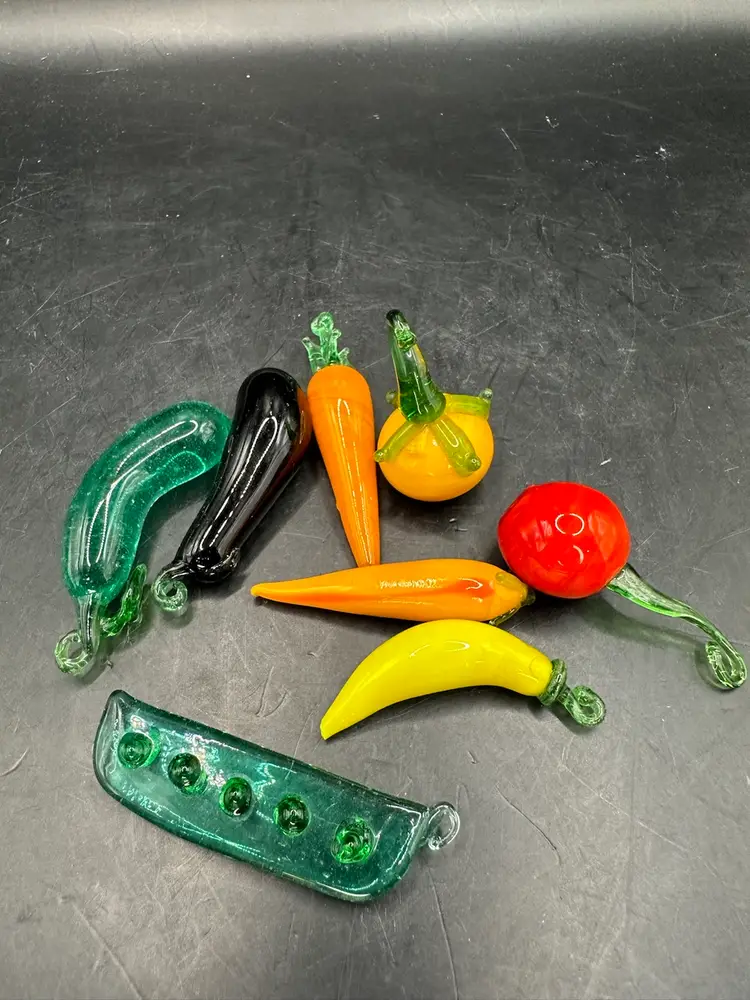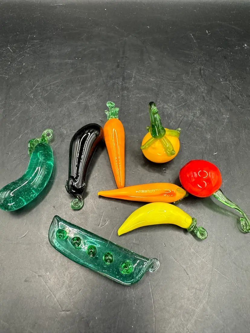 Zucchini, Eggplant, Carrot, tomato on the vine, squash, yellow squash, pea pod and unknown veggie No chips or cracks