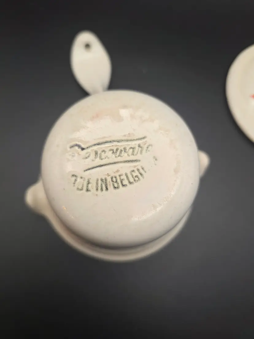 As Is. It has a chip off the enamel on the lid. Will no affect use. Descoware made in Belgium. Signed on the bottom.