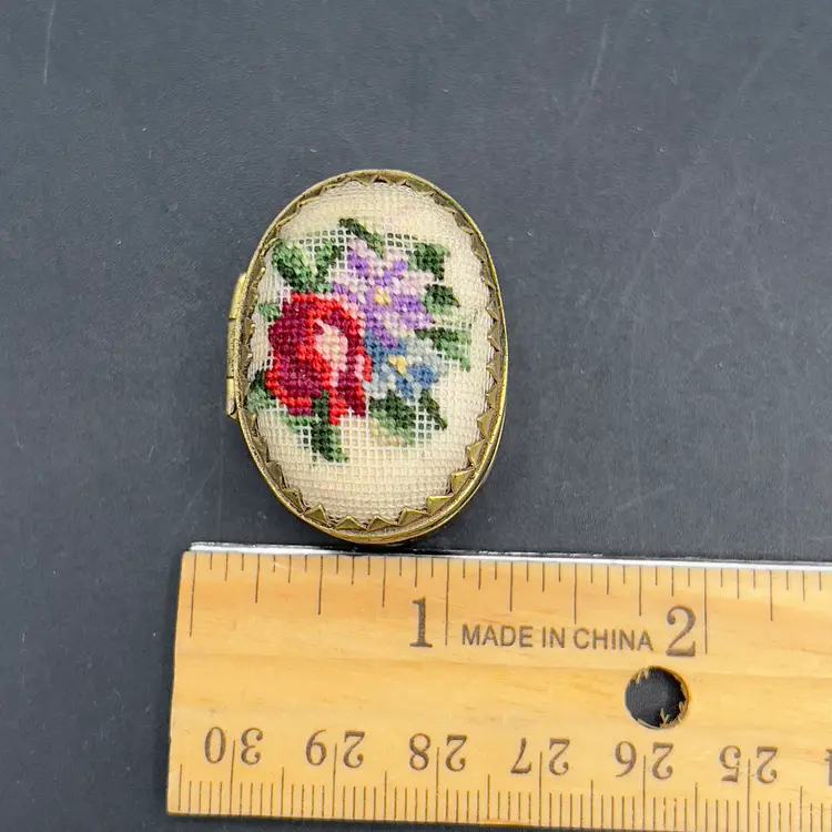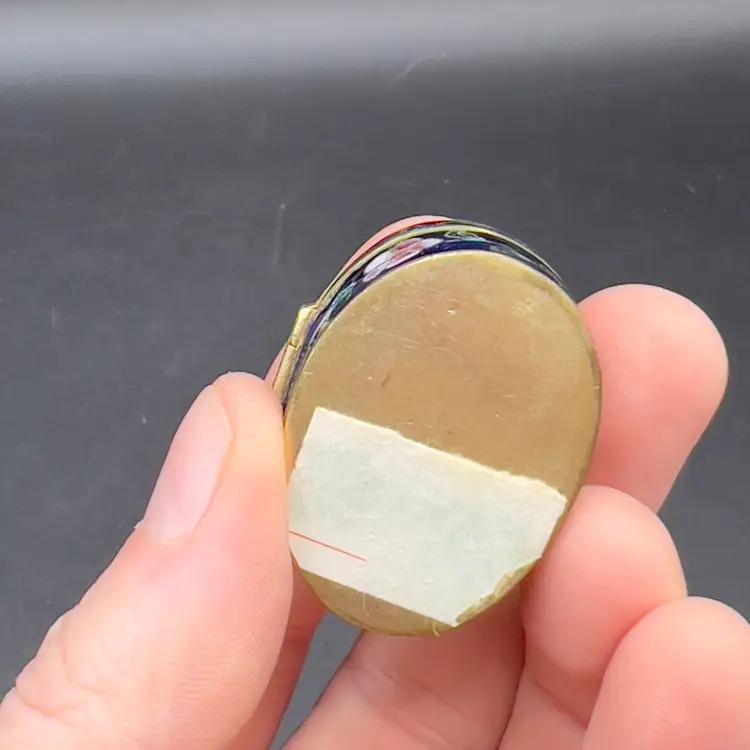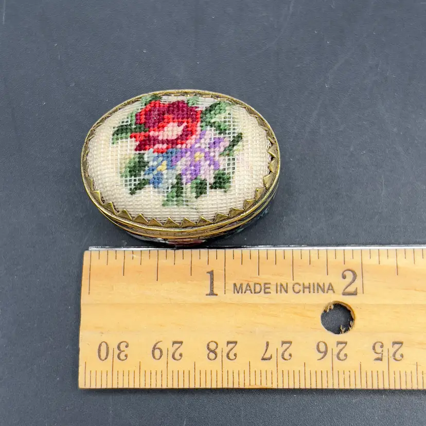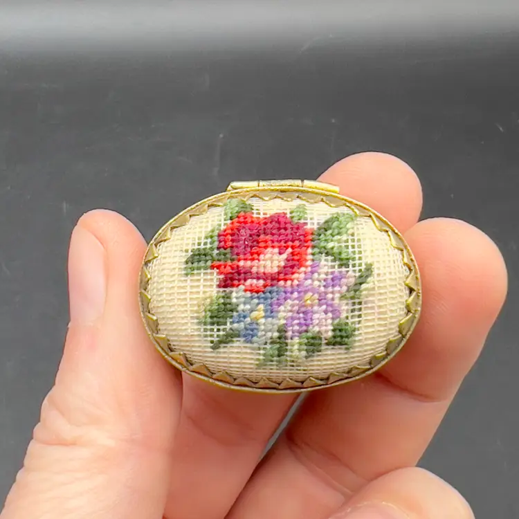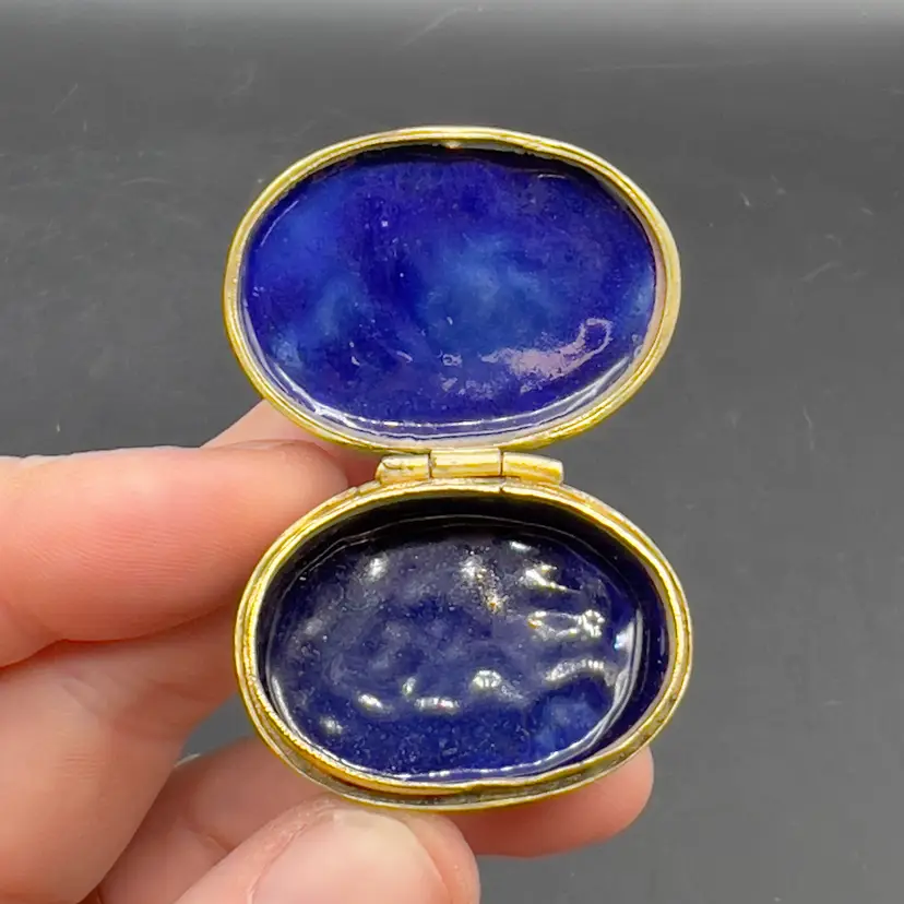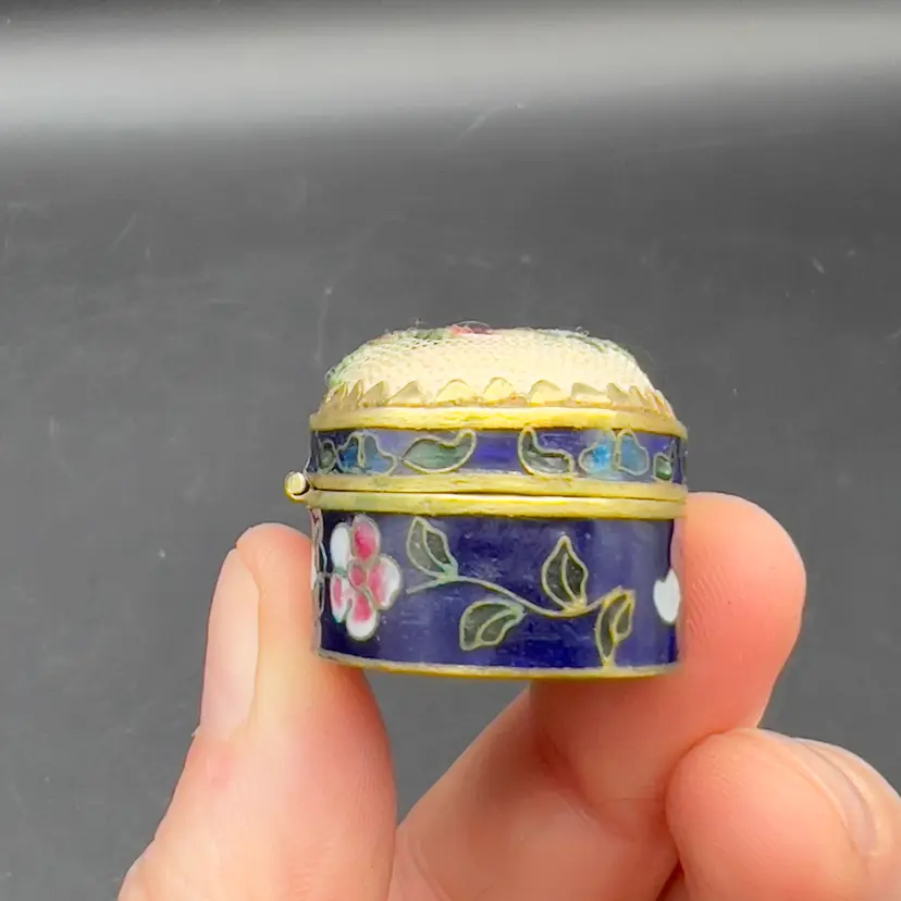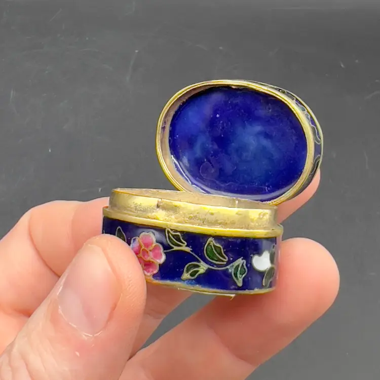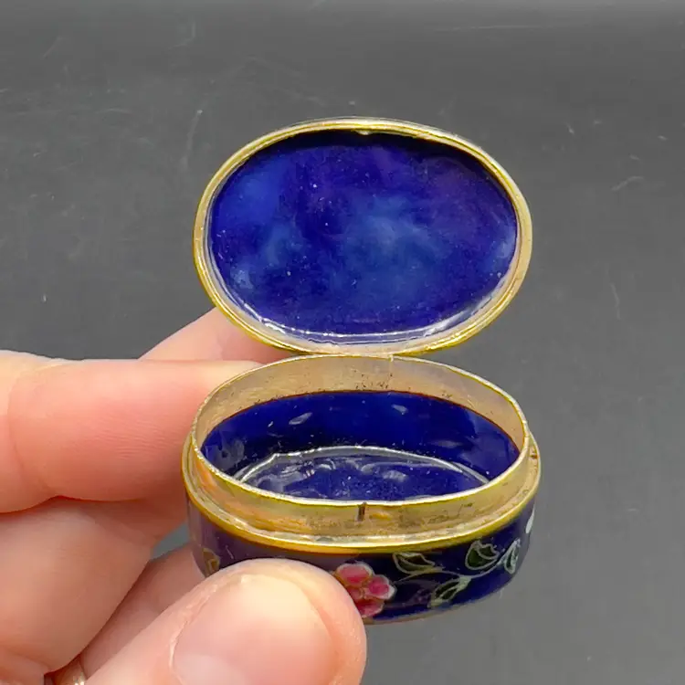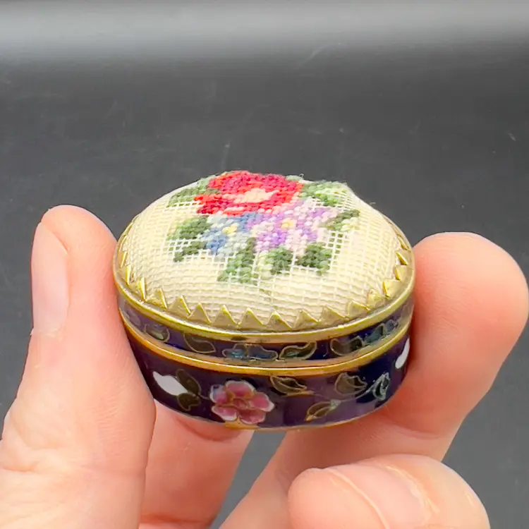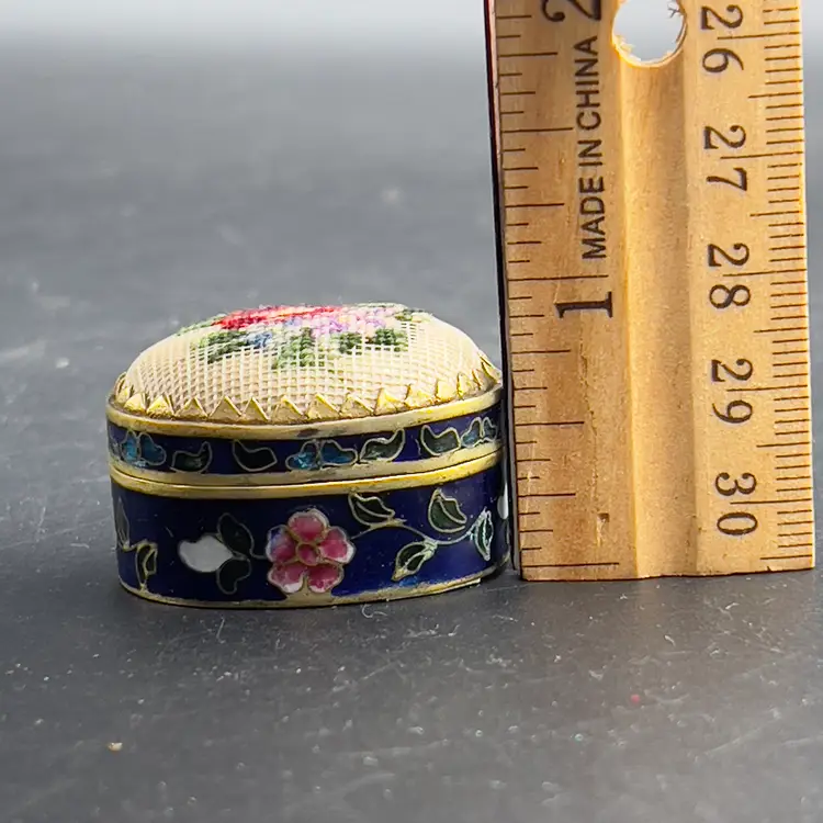 Mini Cloisonne Enamel Box Embroidered Lid Cobalt Blue Gold Pink Flowers Roses The sweetest little trinket / pill box I have ever seen.