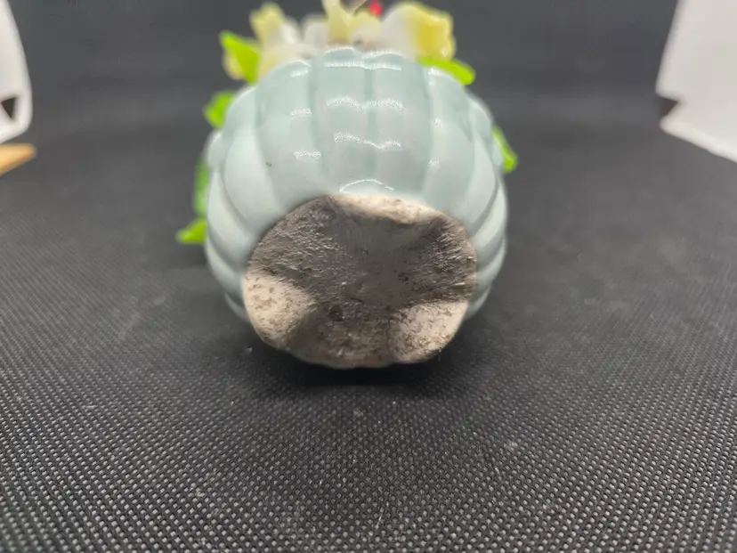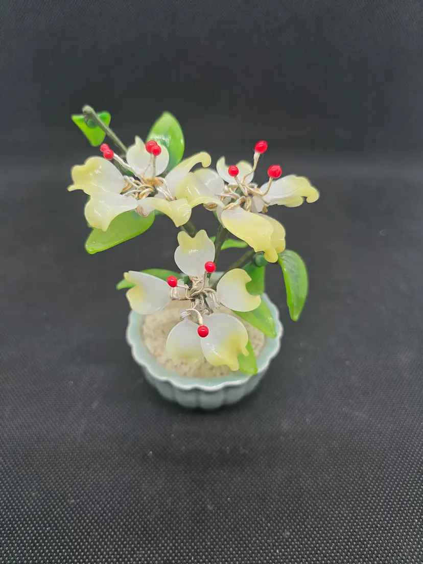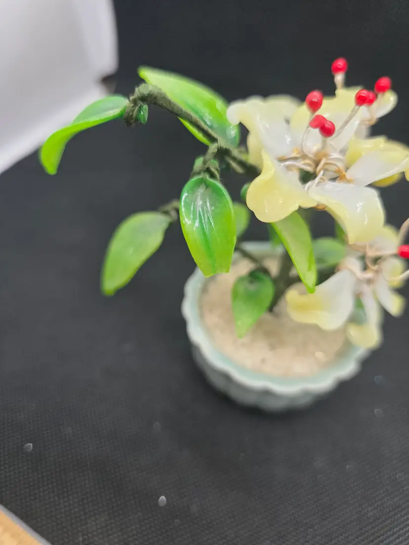 This tree is about 5" tall and 3" wide. There is one broken leaf (see last photo). Please note: Items may need to be cleaned and reshaped upon delivery!