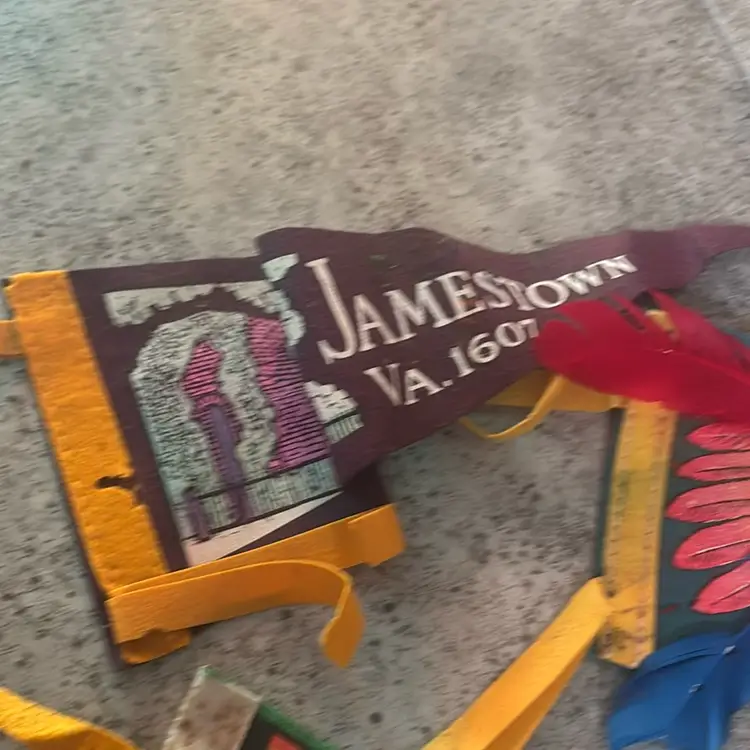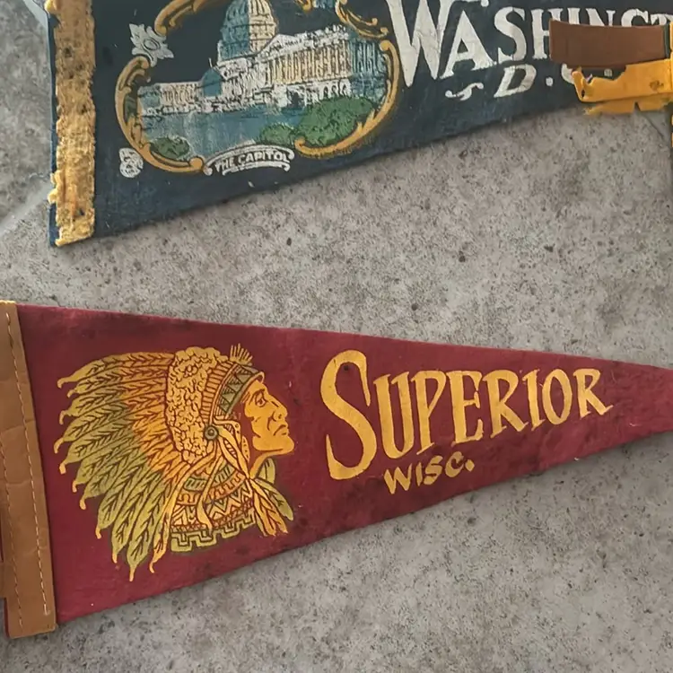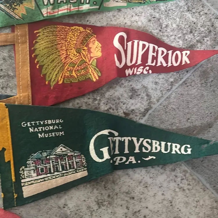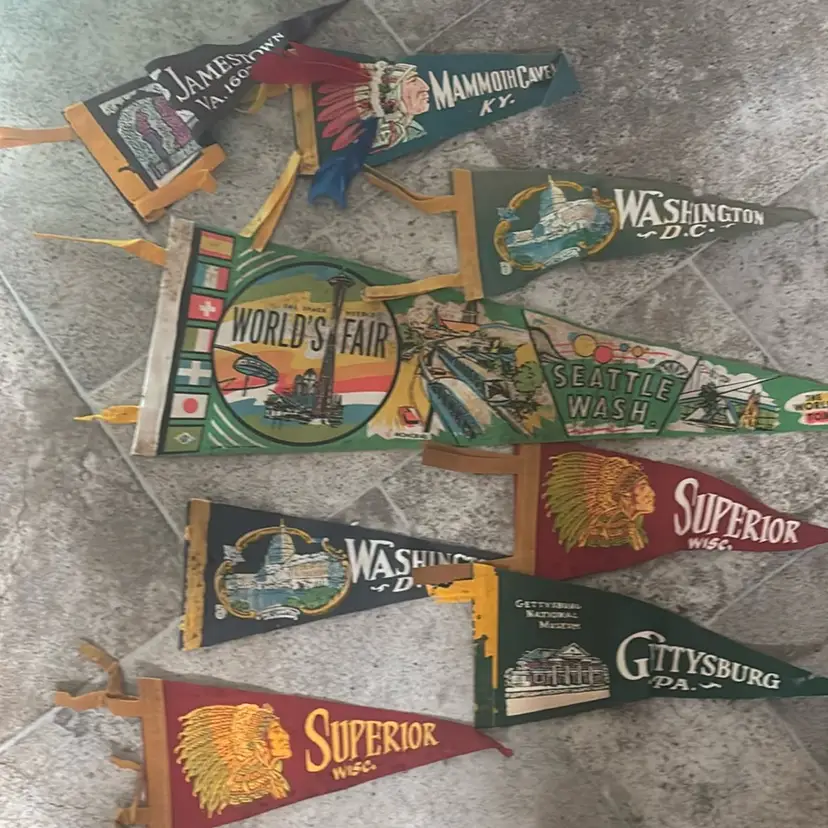 Here is a lot of small felt souvenir pennants. These not including the tails are about 11 inches long. The world‘s fair pennant measures 25 inches long. Some of these are really rough, but they date back to the 1950s to 70s. The world fair pennant is, upon my research 1962. That one’s not in bad condition,but does have some staining. some of the other ones the graphics are a little worn off, thin in areas, fading in areas. So you were buying these as is.