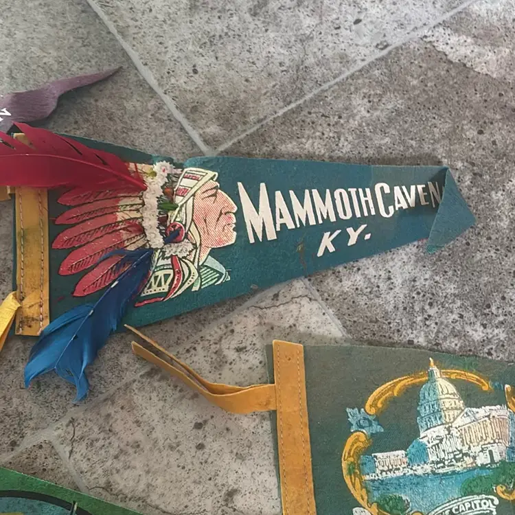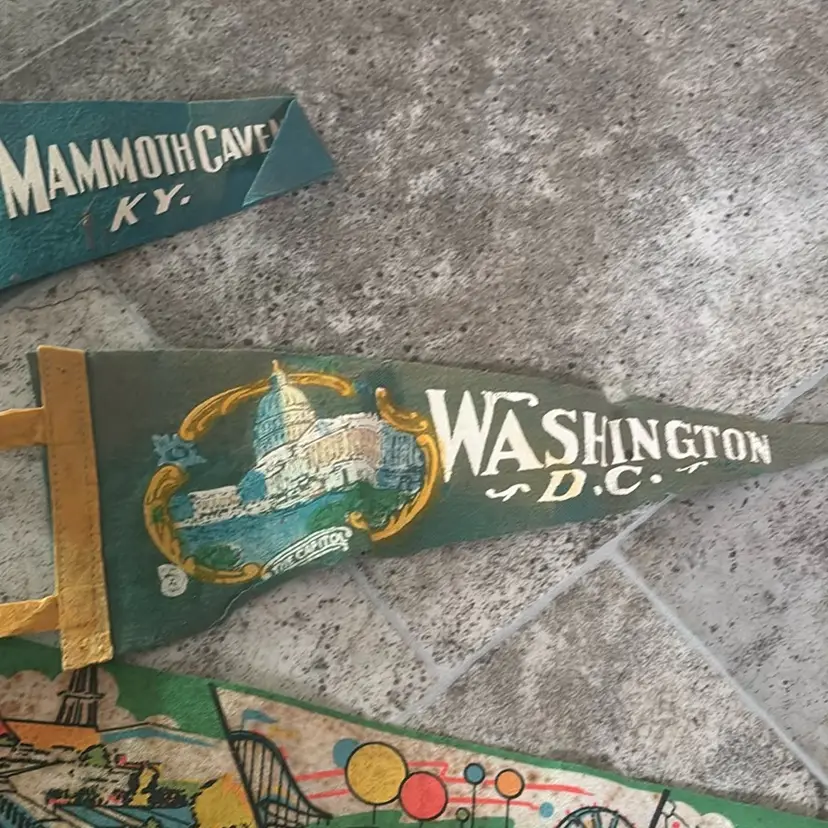 These items are vintage souvenir felt pennants from various American tourist destinations and attractions, likely dating from the 1950s to 1970s. Destinations featured: Locations include Mammoth Cave, KY; Washington D.C.; Seattle, WA; and Jamestown, VA. Specific event: The large pennant in the center commemorates the 1962 Seattle World's Fair. Historical significance: Such pennants were popular, inexpensive souvenirs sold at national parks and roadside attractions during the expansion of American car travel.